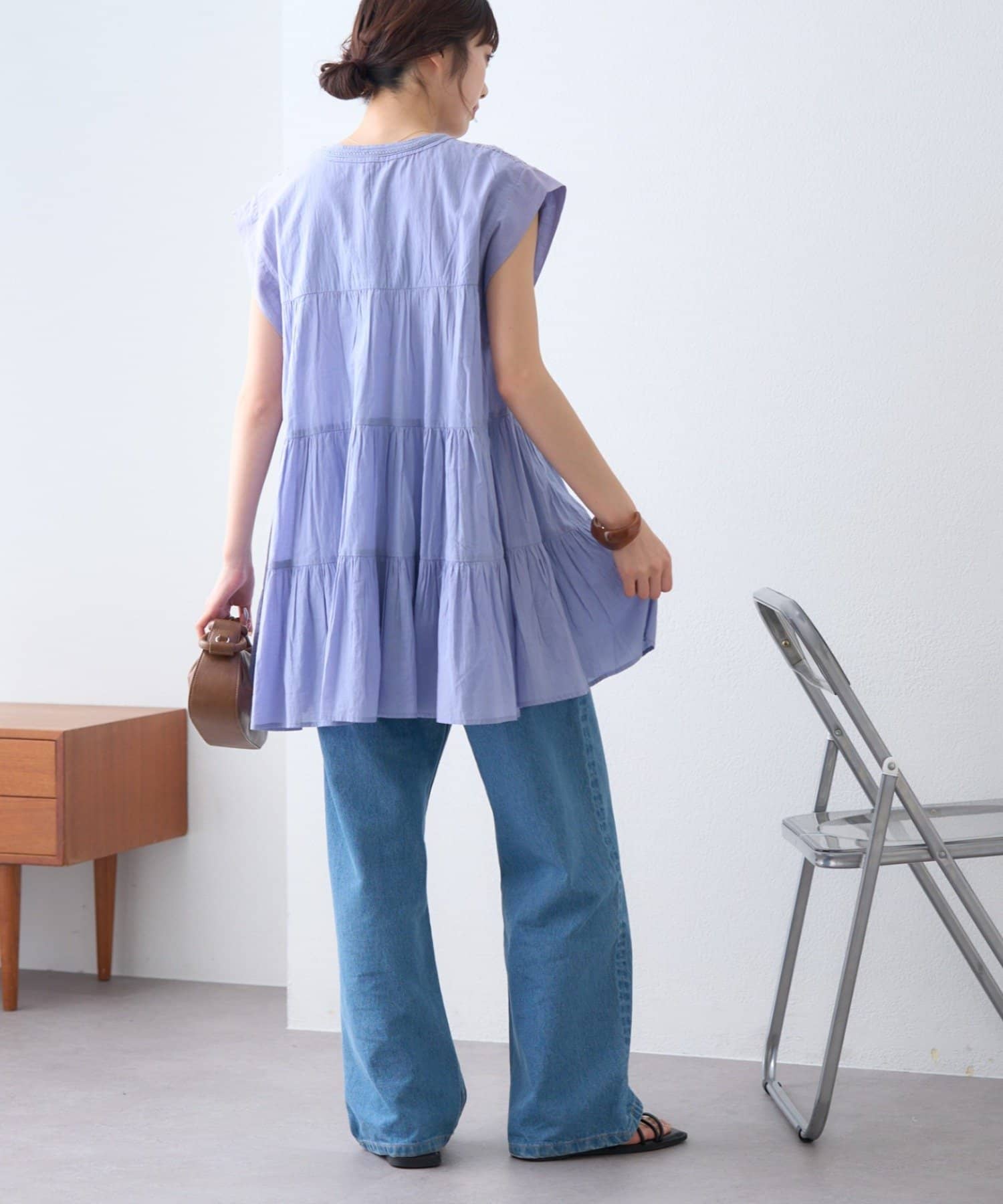 ナチュラルな生地感とやりすぎないデザインが一枚でさらっと着るだけでコーデを完成。