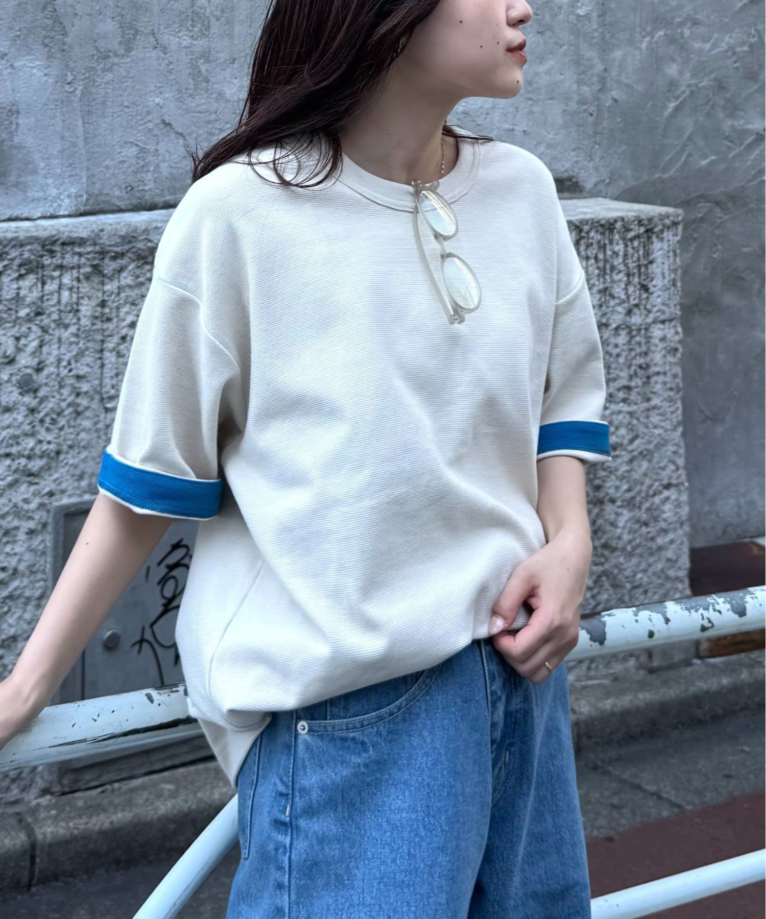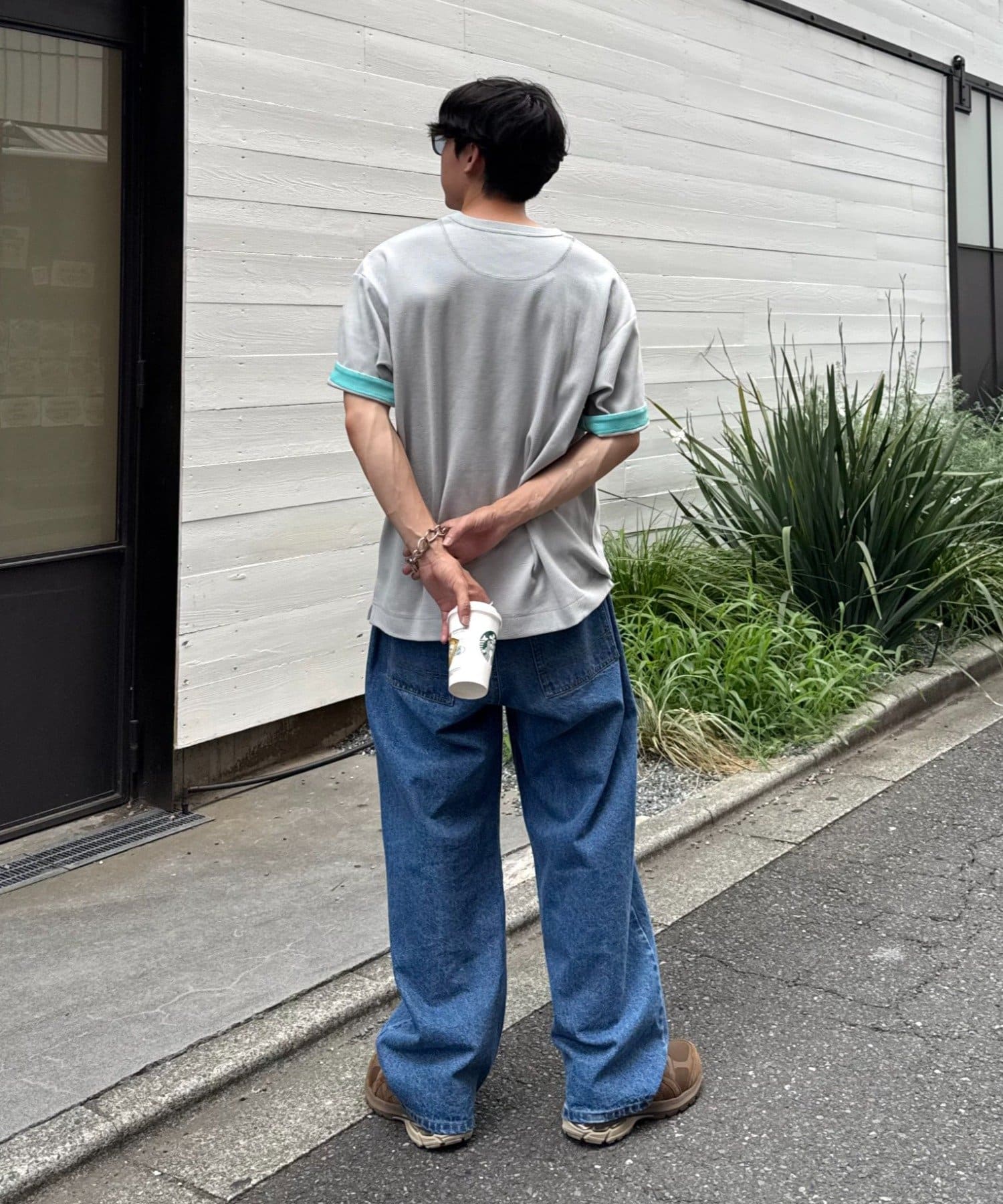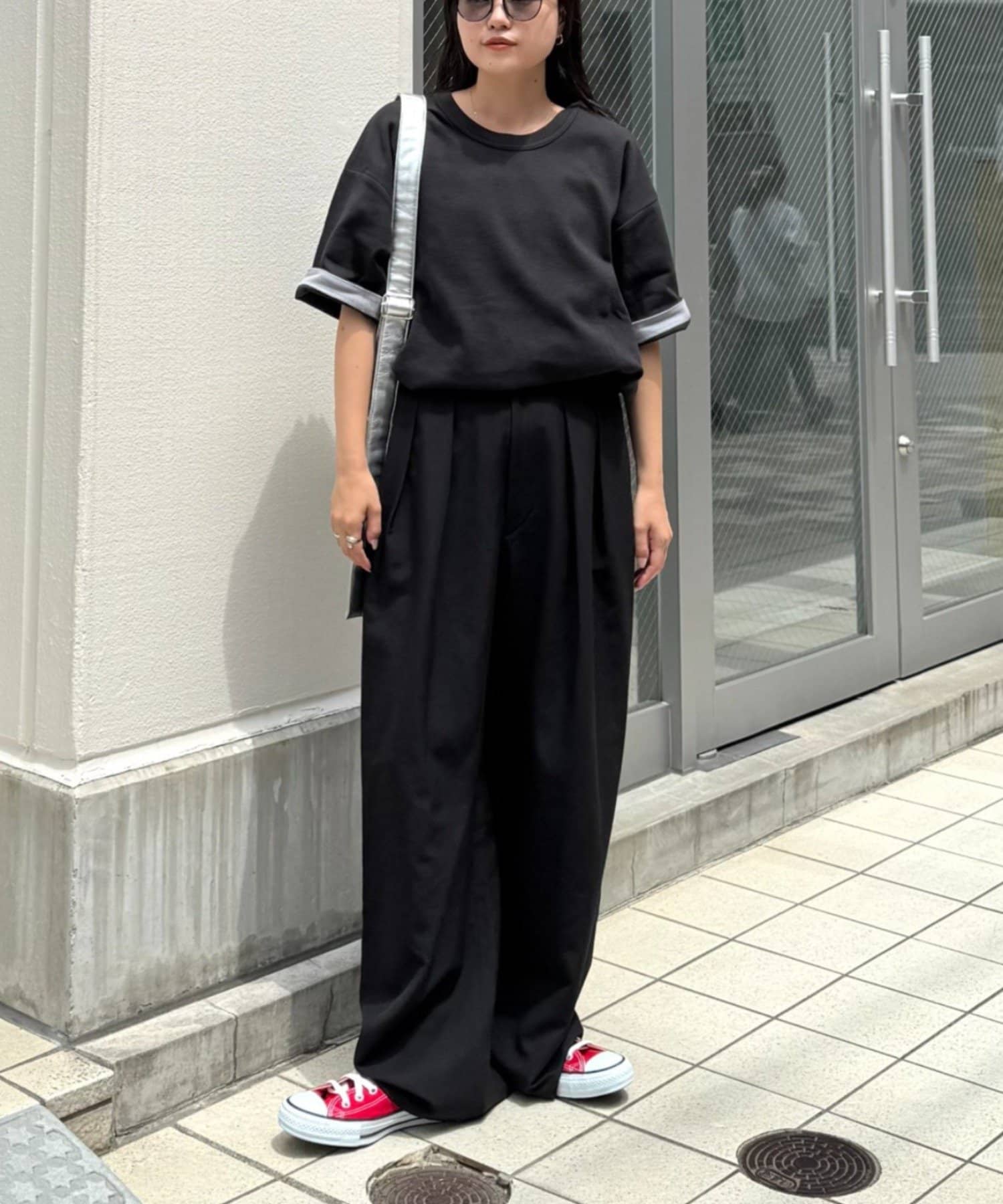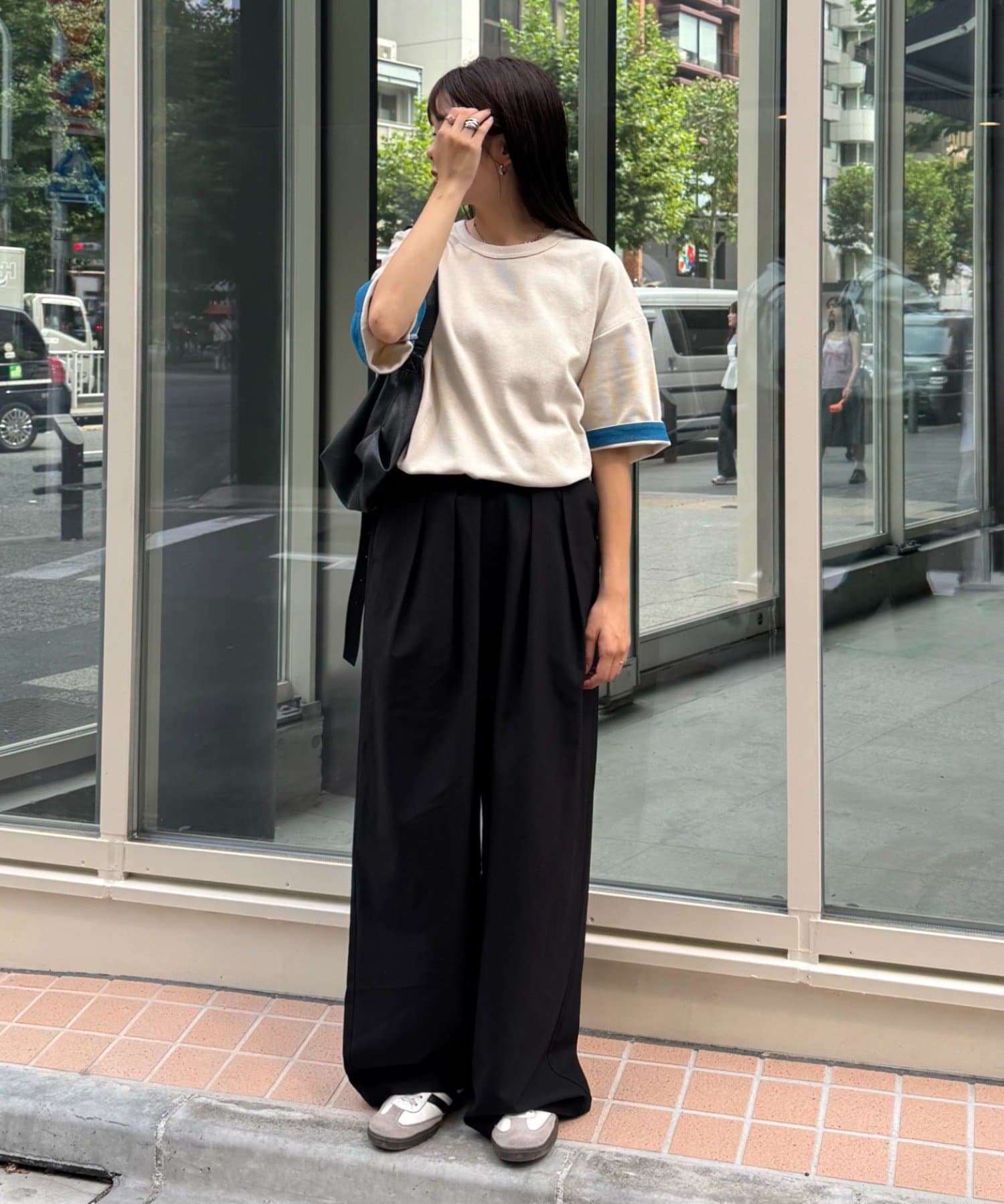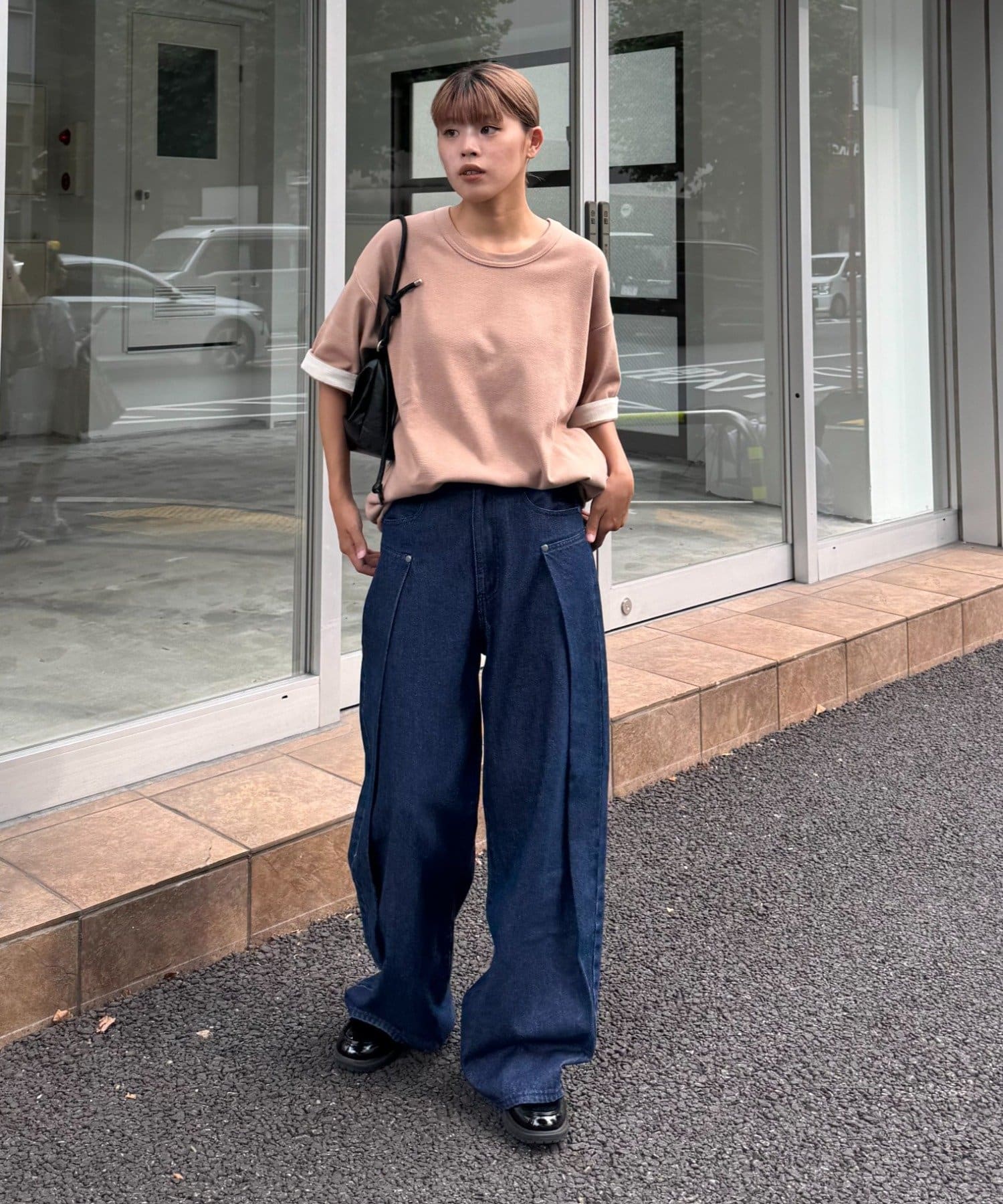 シンプルなハーフスリーブTeeは一枚で様になり、スタイリングの主役にも引き立て役にもなる万能な一着。