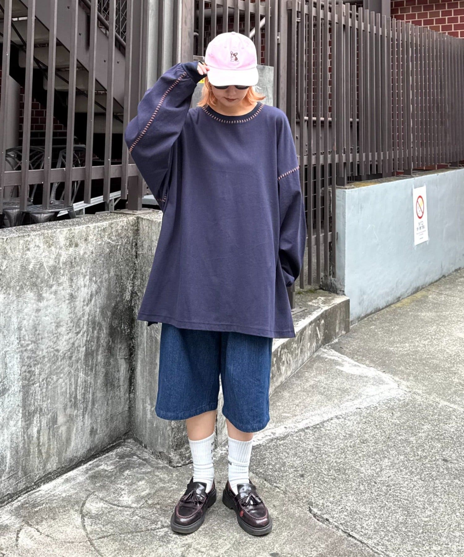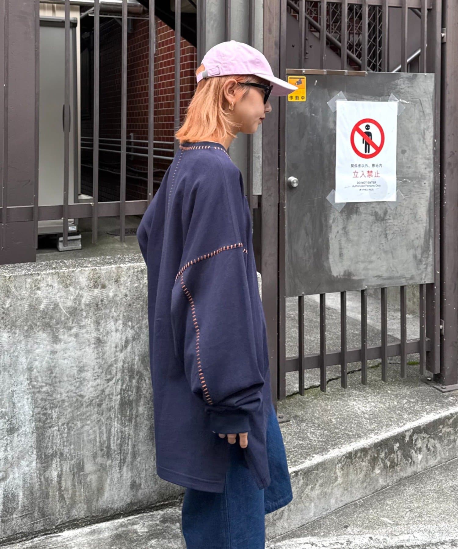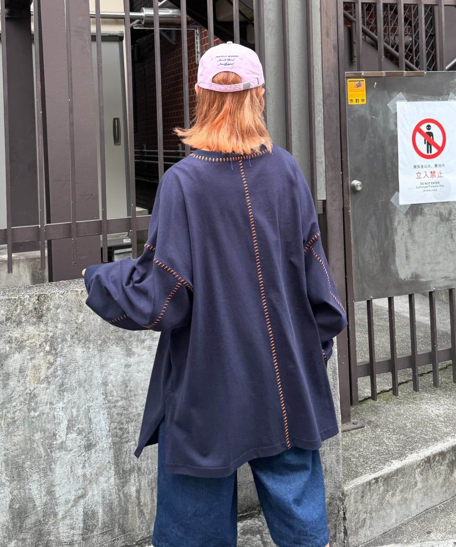 ルーズなサイズ感と配色ステッチでどの角度でもおしゃれ見えするデザイン。