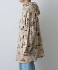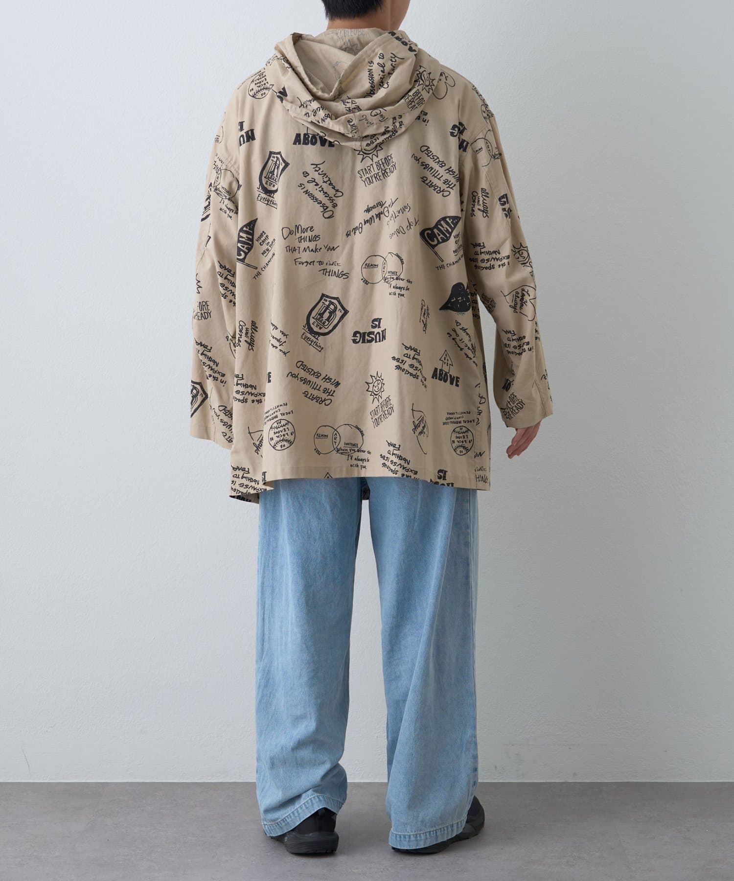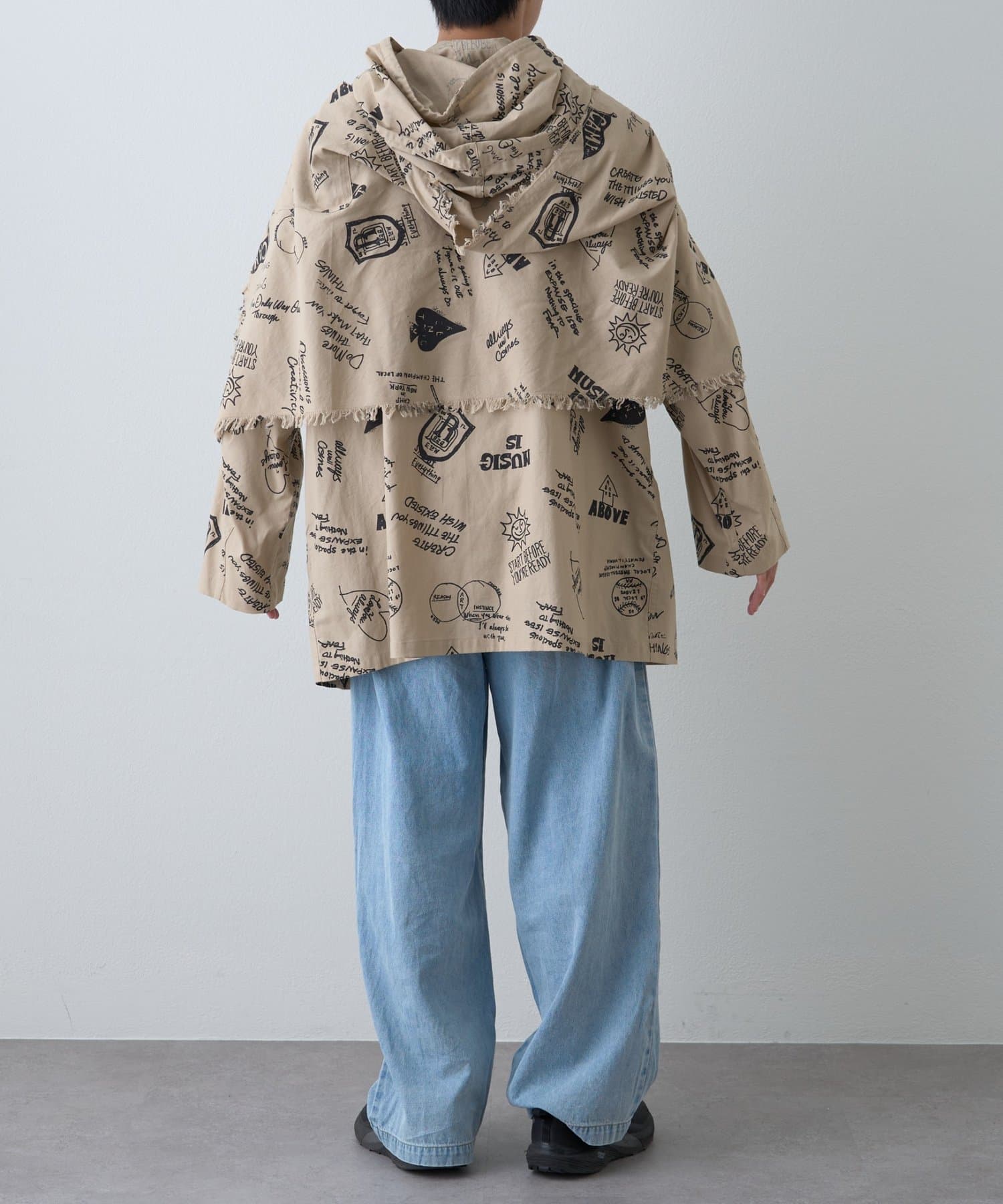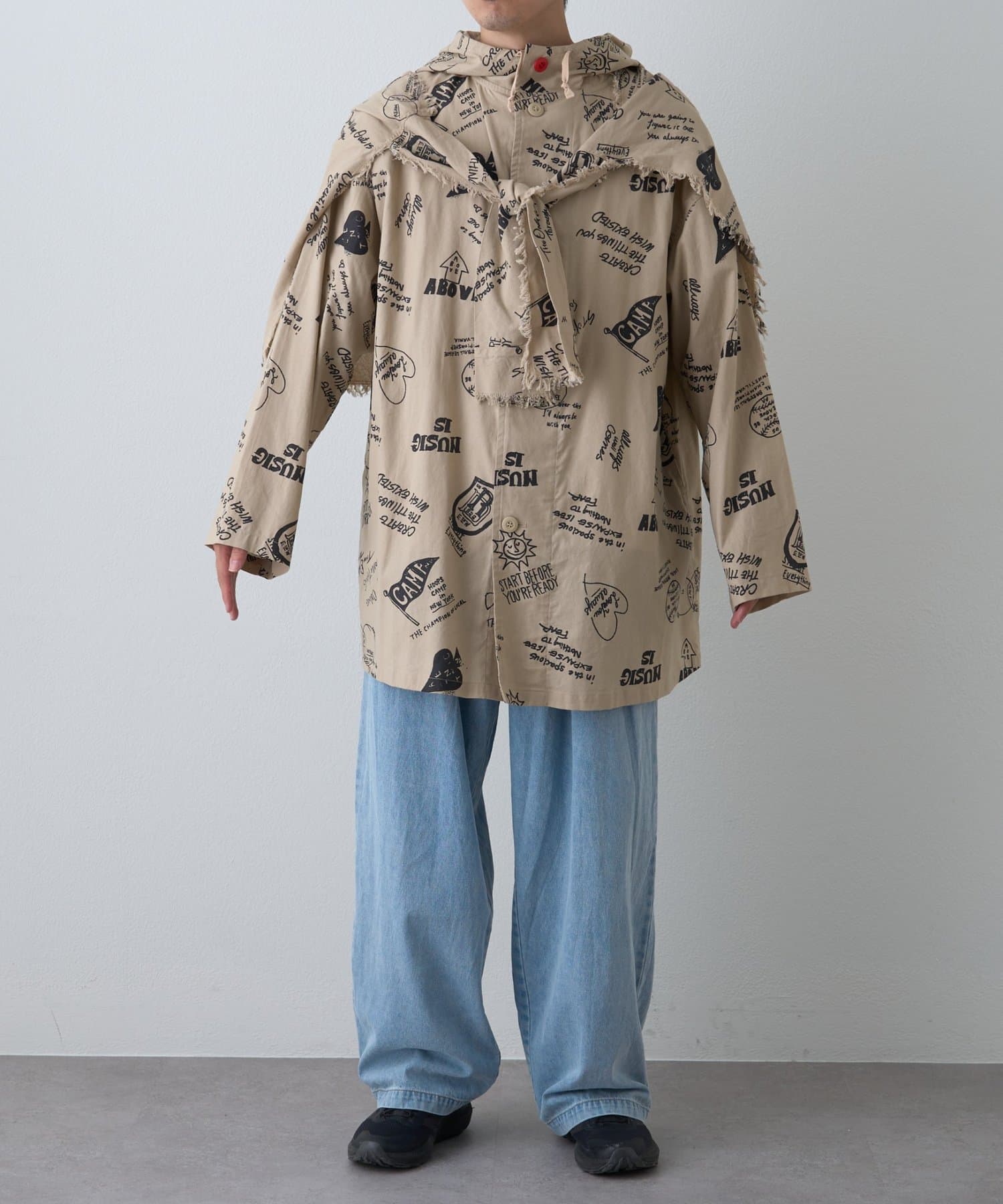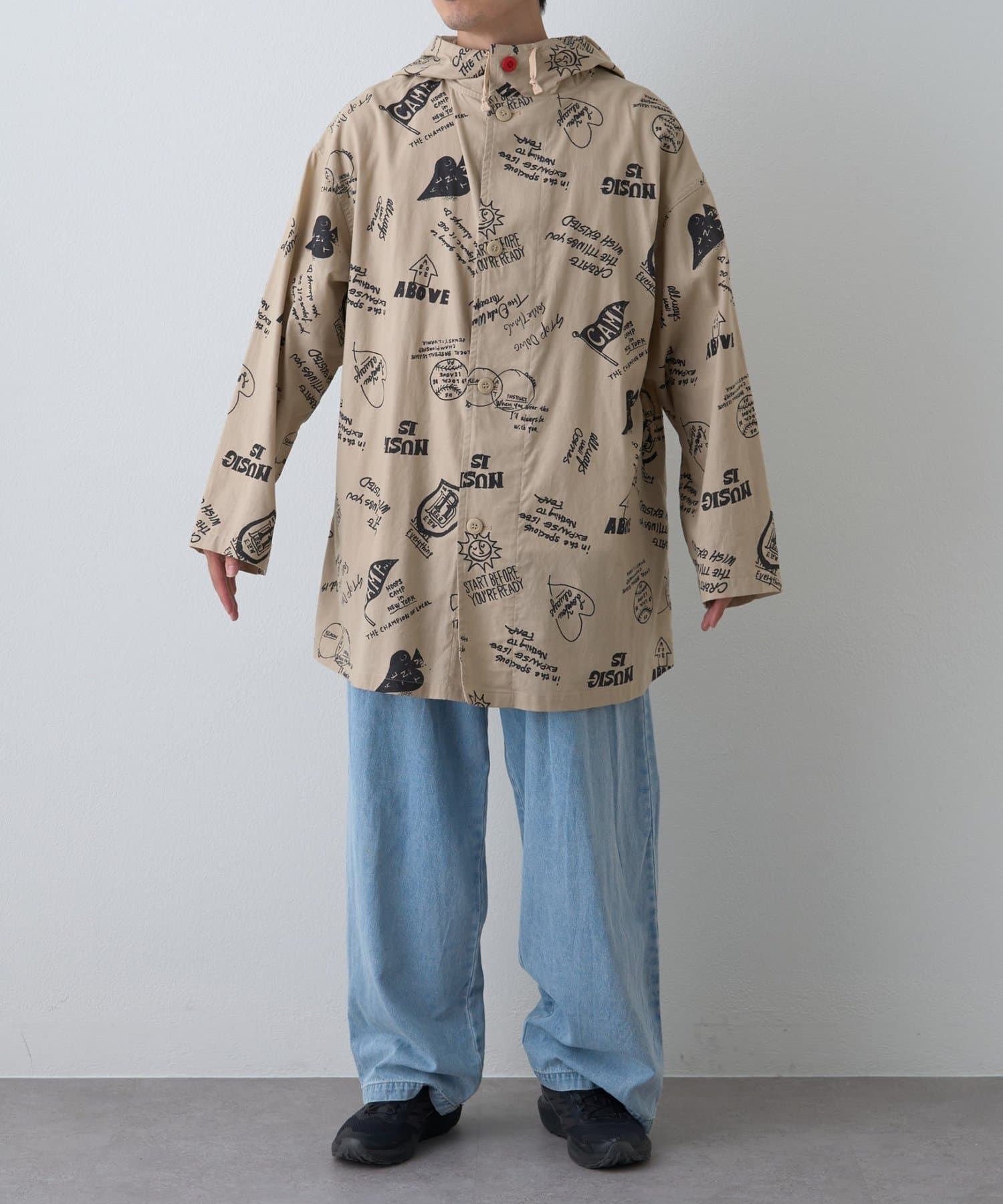 手描き風のドローイング柄が目を引く、存在感たっぷりのフード付きシャツコート