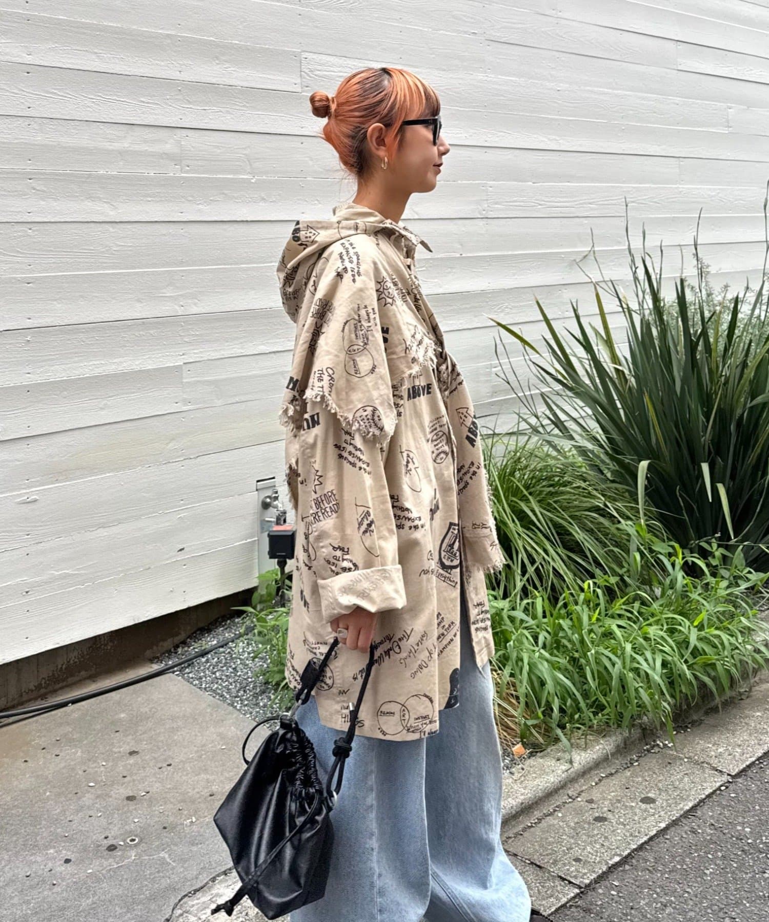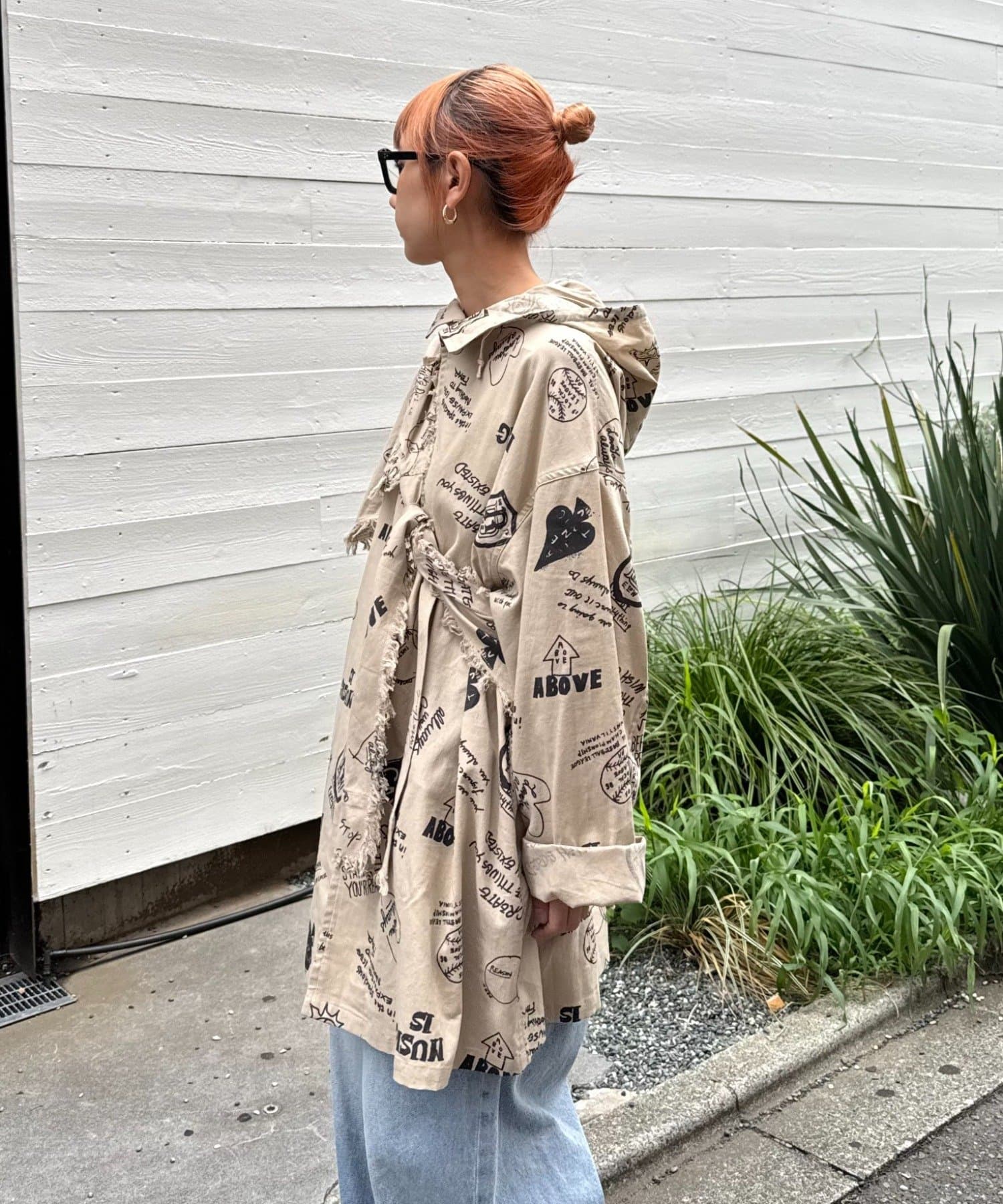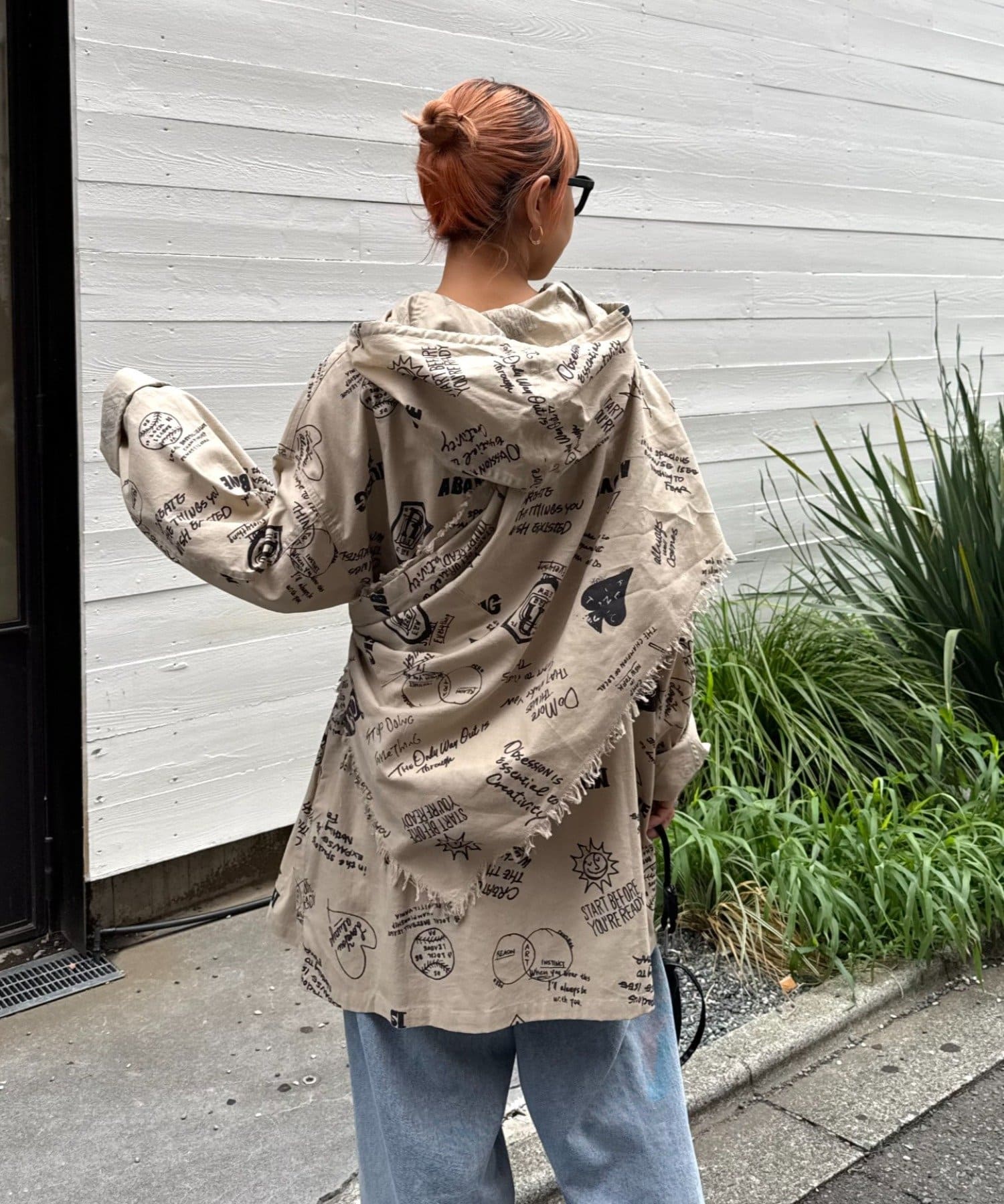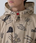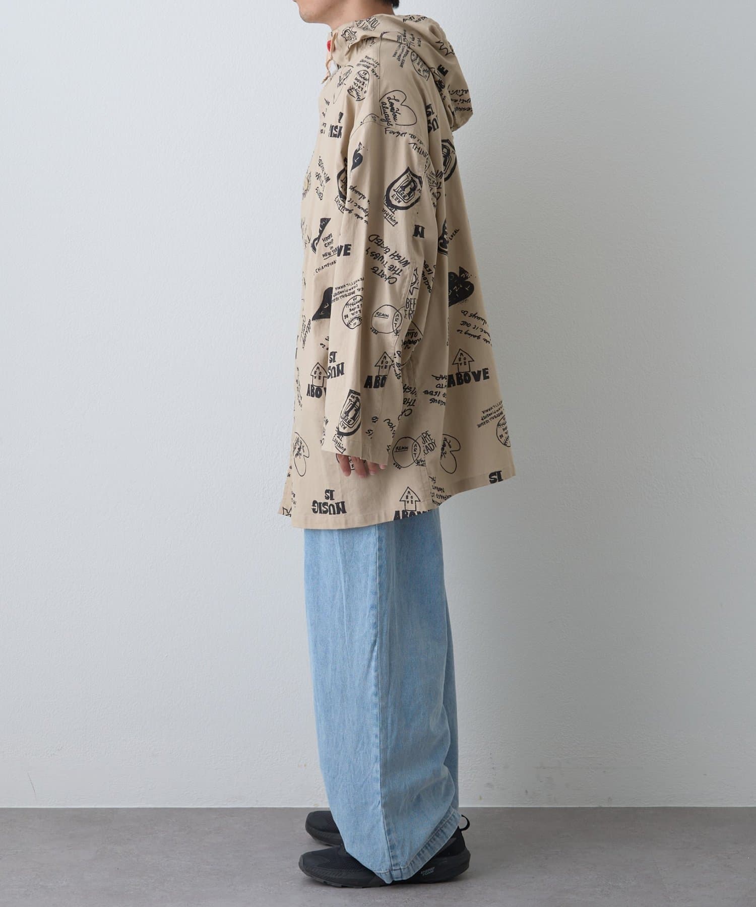 手描き風のドローイング柄が目を引く、存在感たっぷりのフード付きシャツコート
