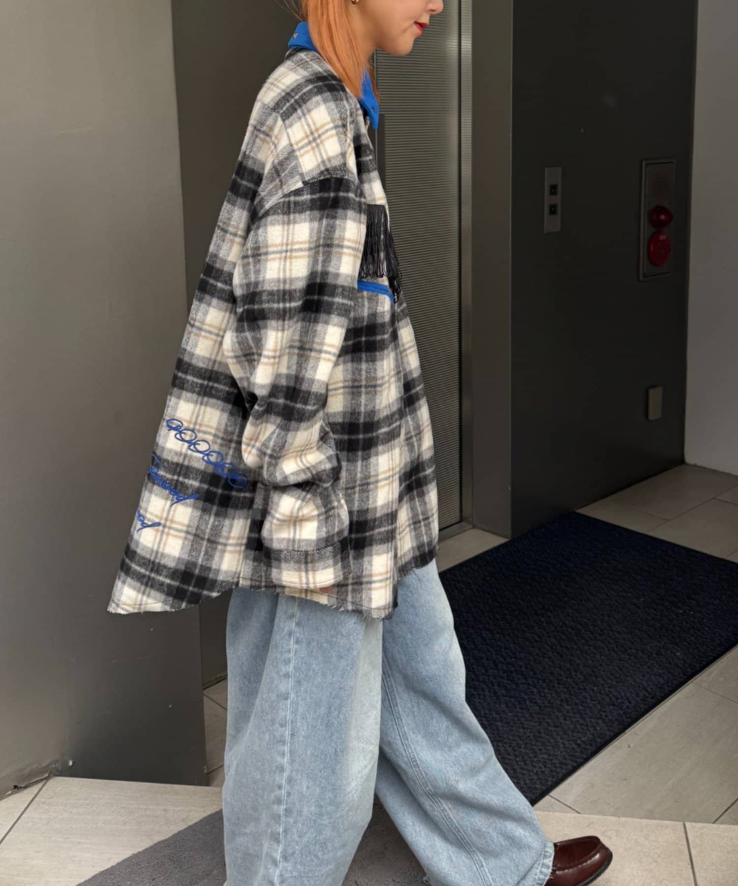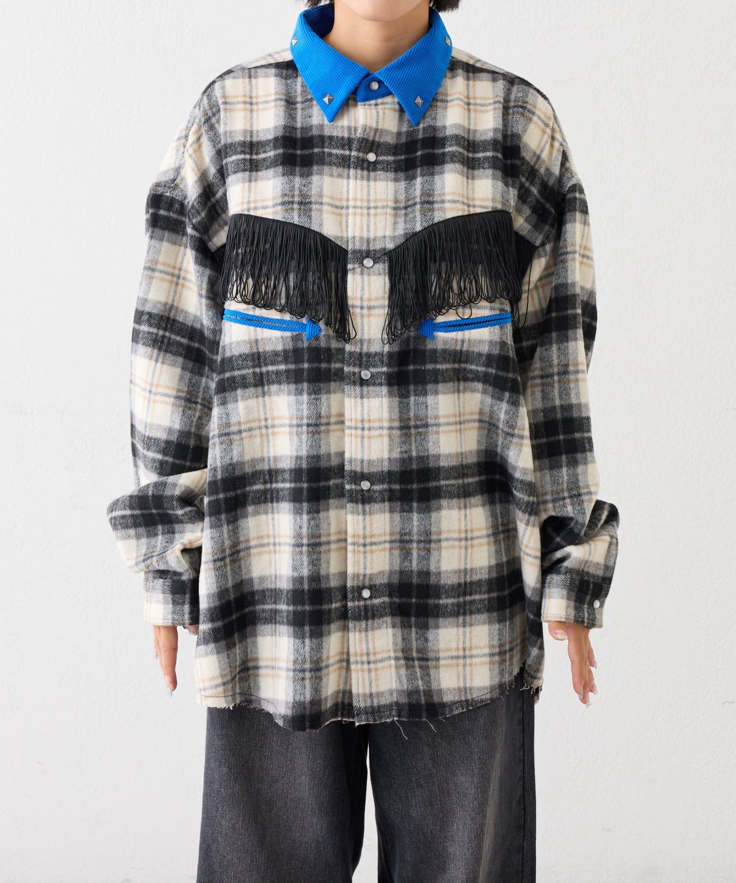 クラシックなネルチェックを、フリンジとブルーの刺繍でウエスタン調に仕上げました。