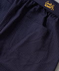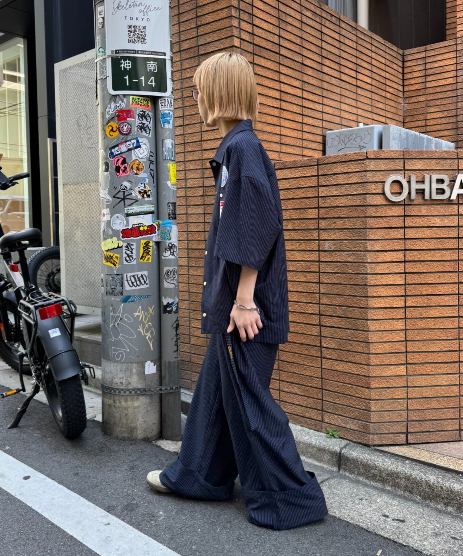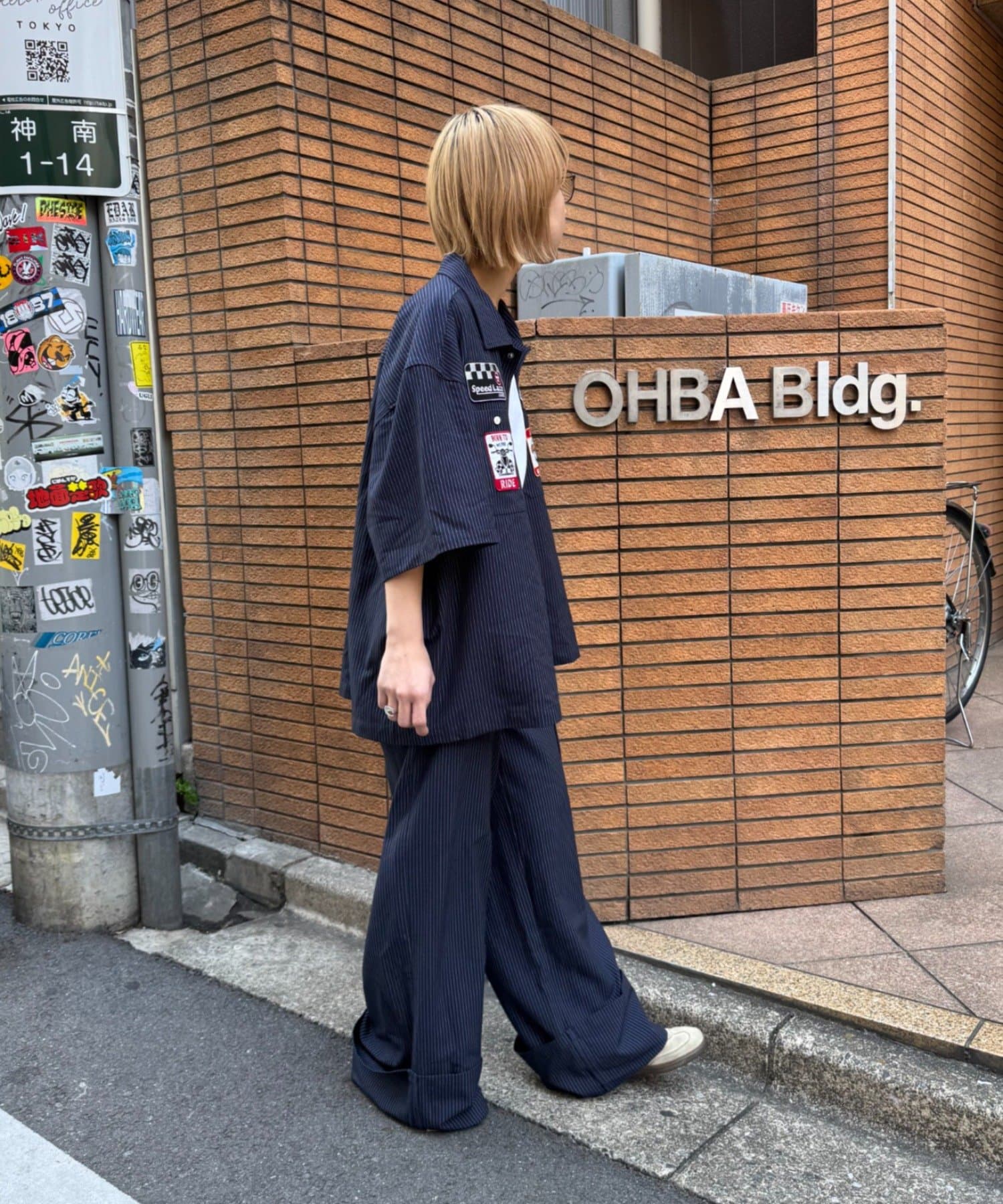 ピンストライプを活かし、シャツを羽織って少しきれいめに寄せるスタイルもお洒落。