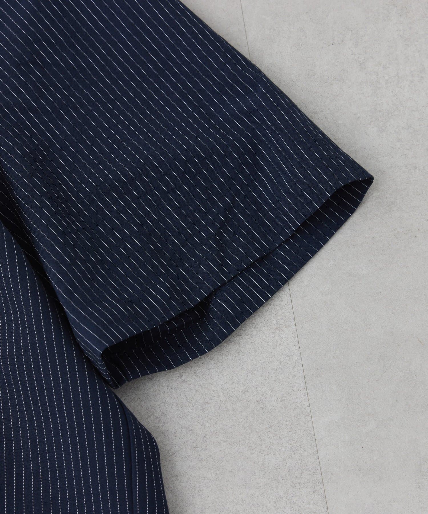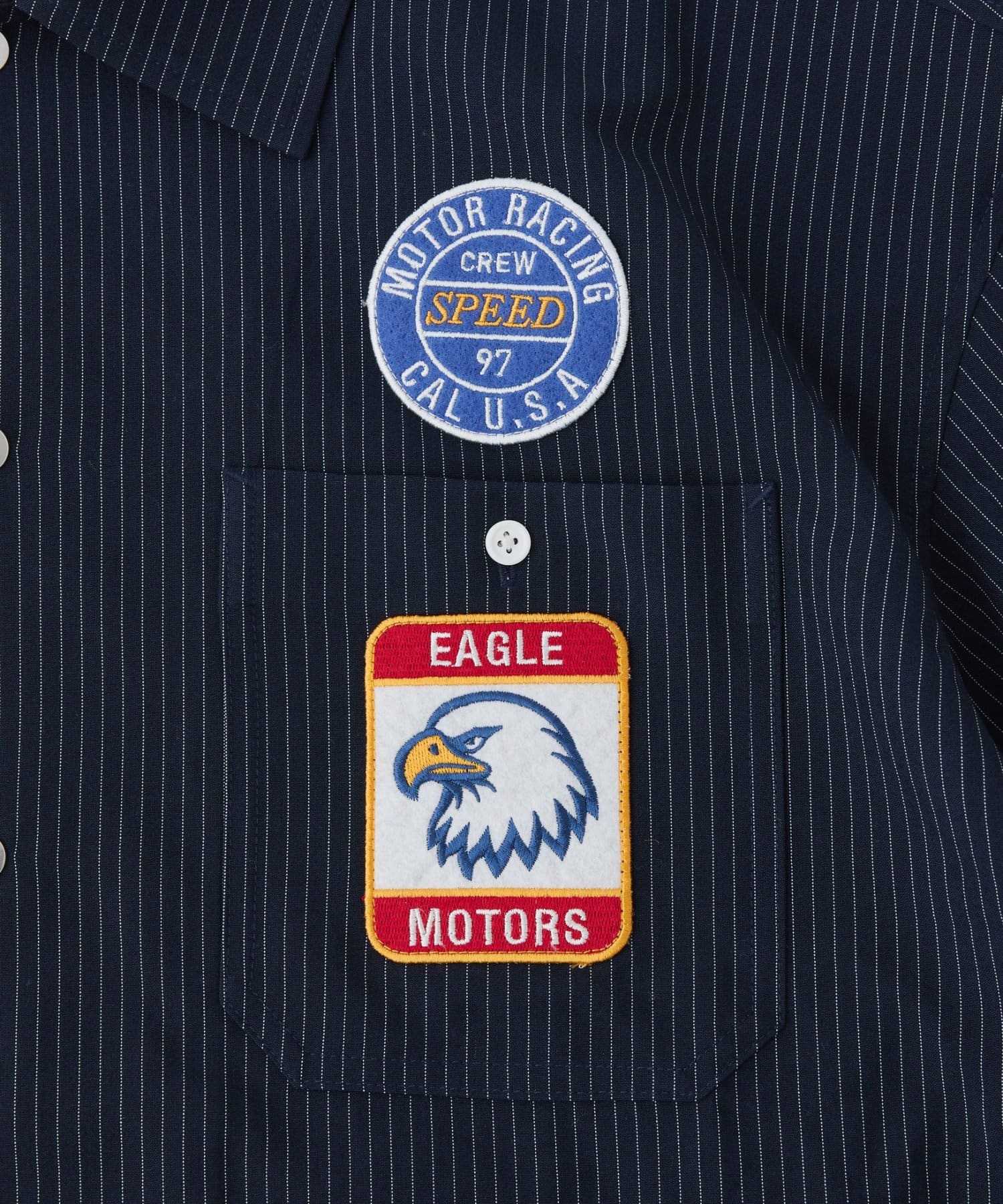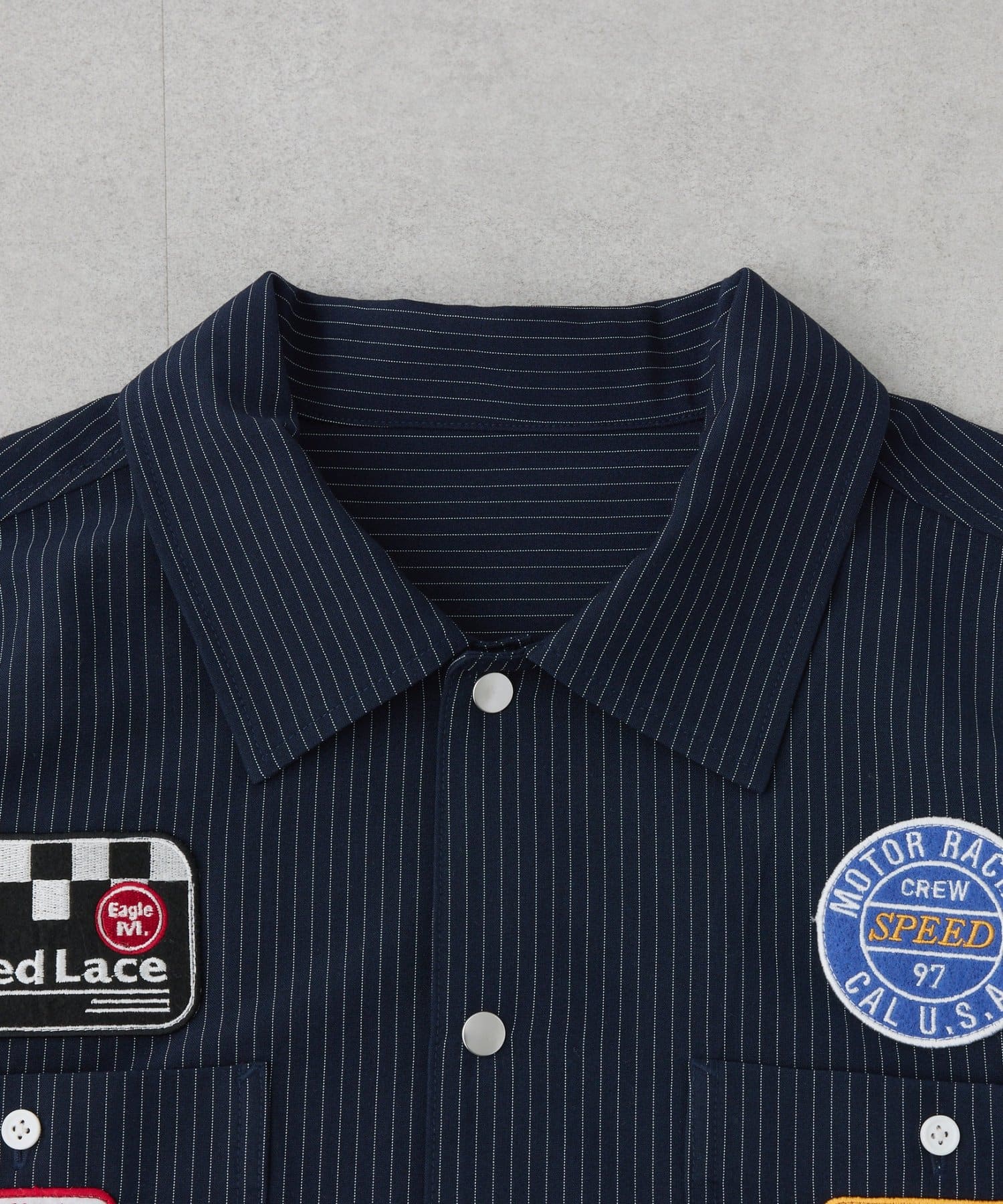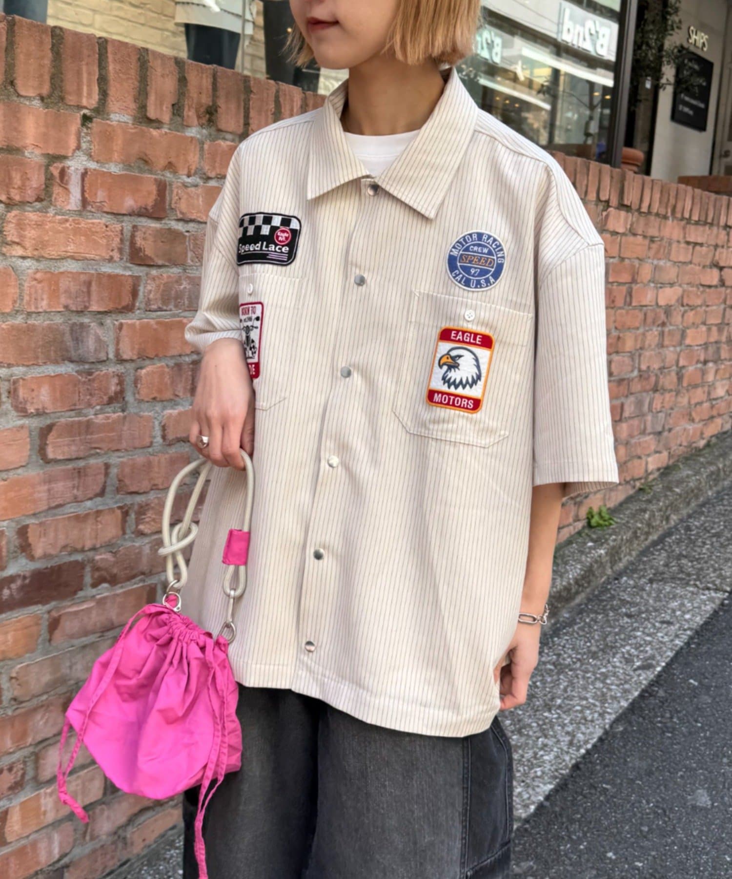 細めのピンストライプにワッペンが映えるシャツ。