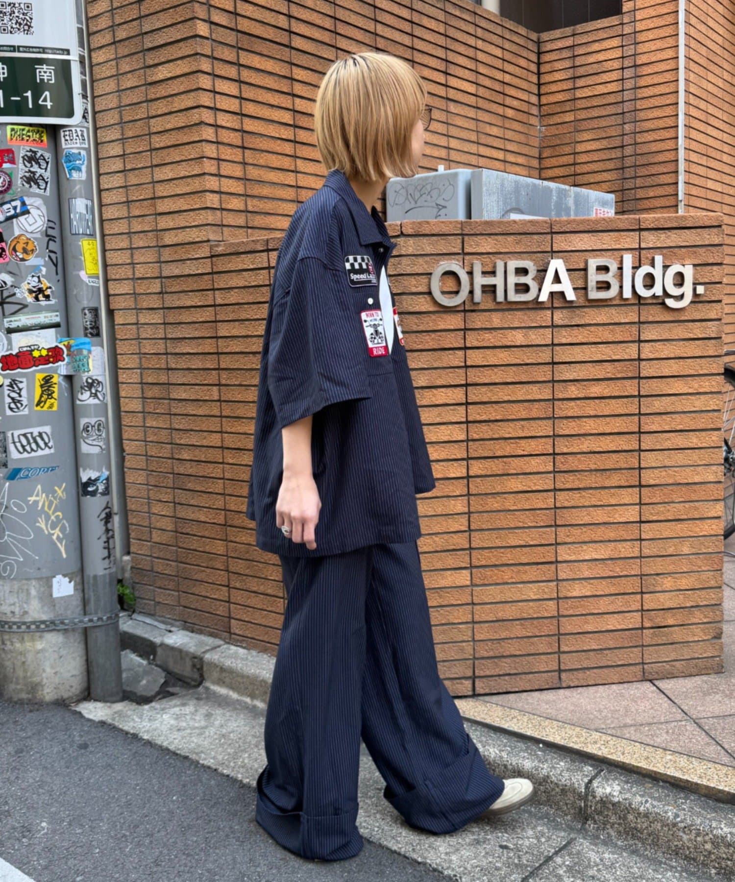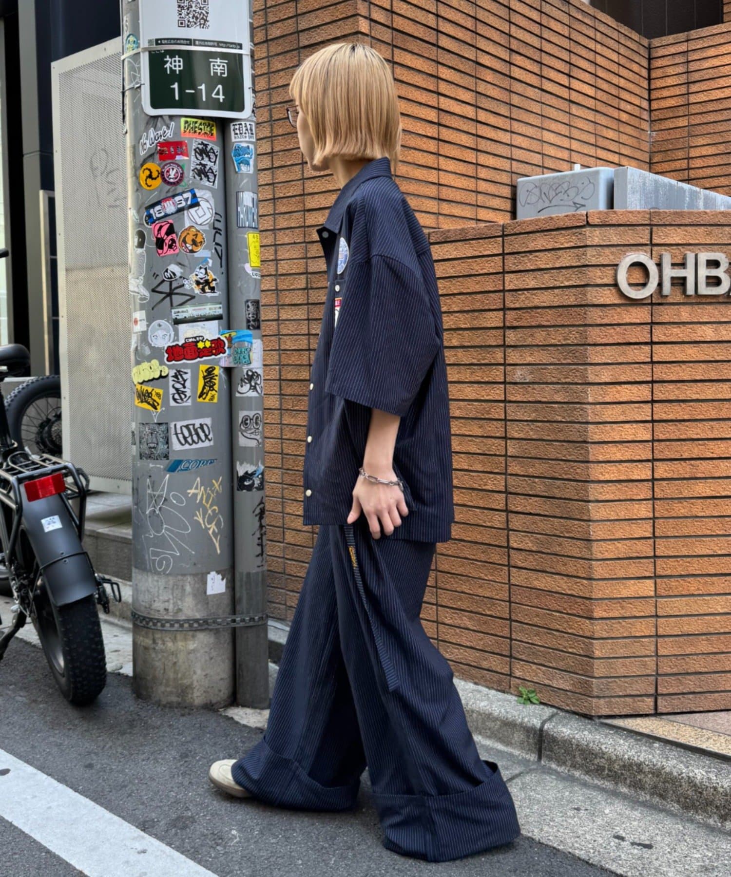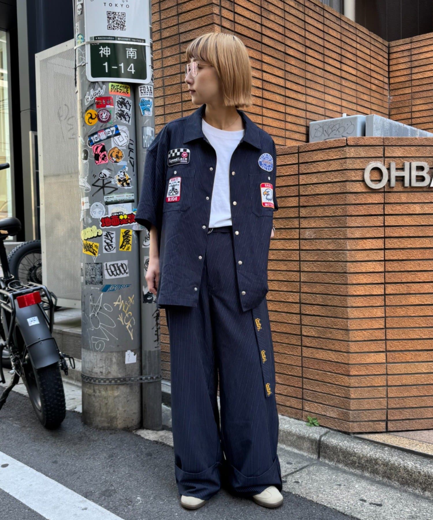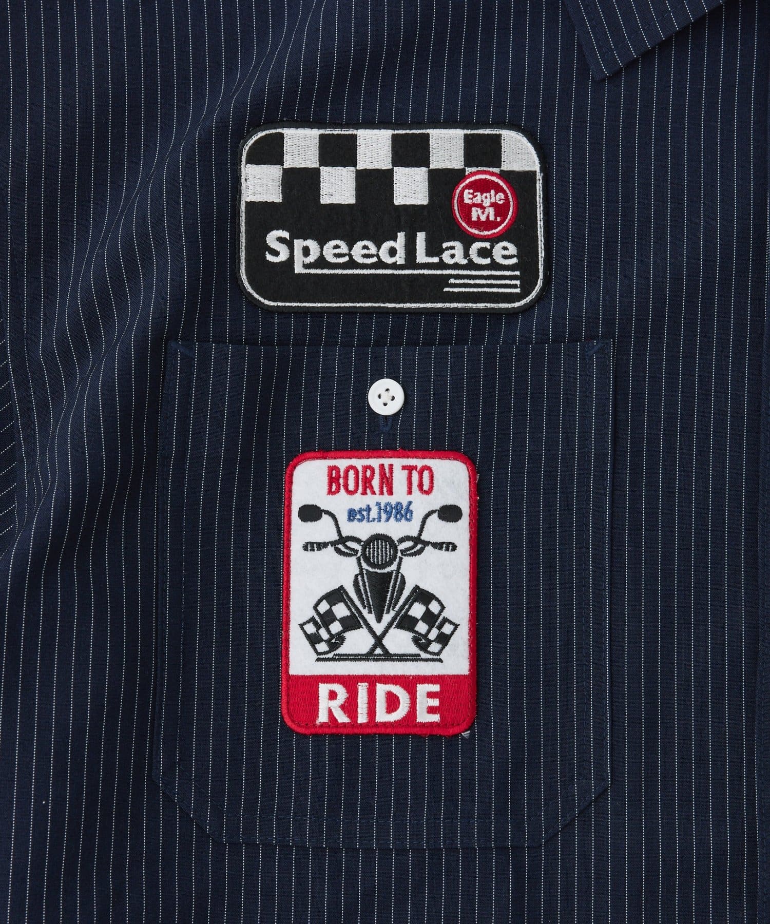 細めのピンストライプにワッペンが映えるシャツ。