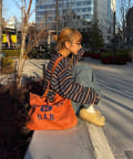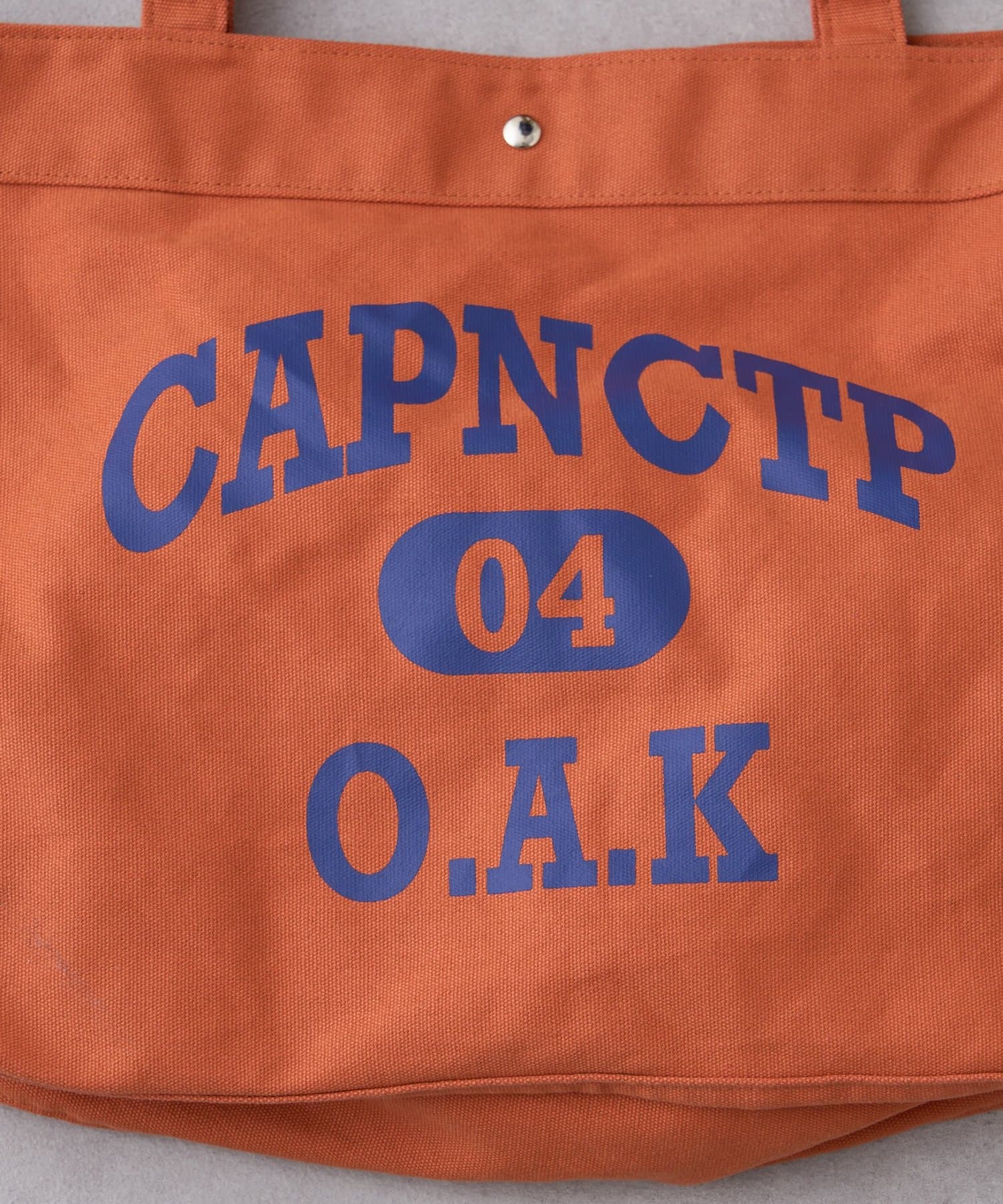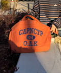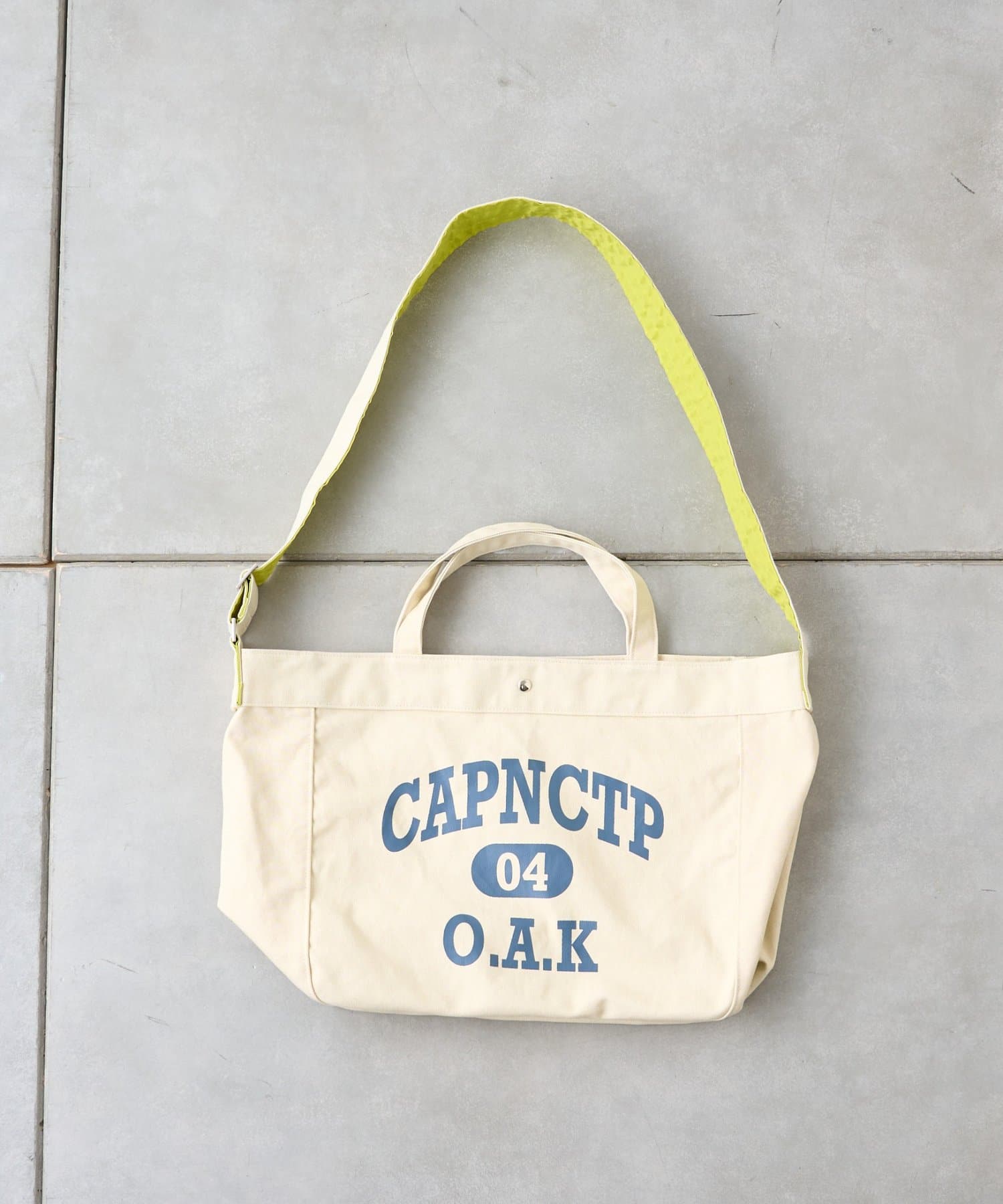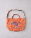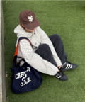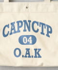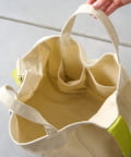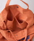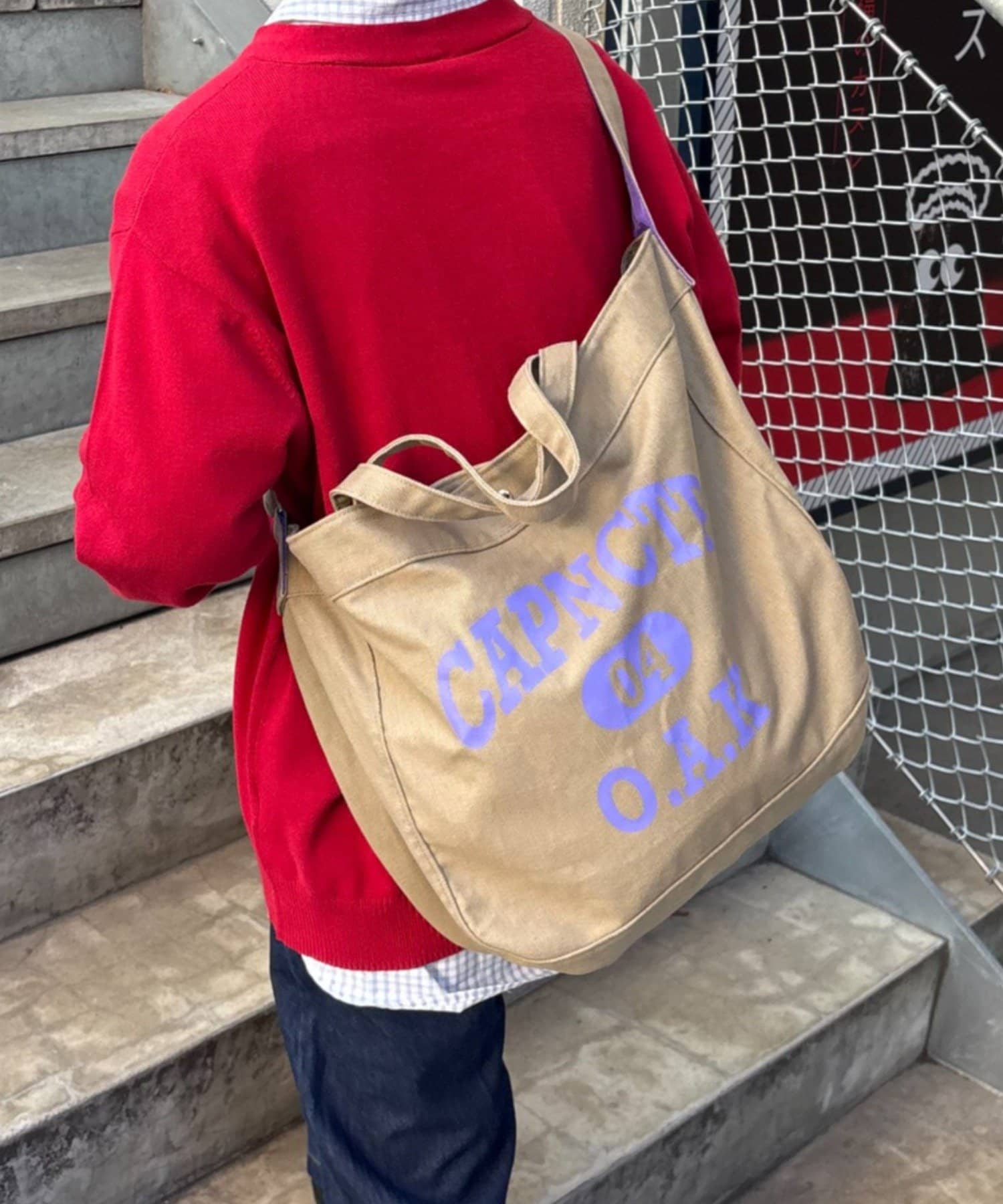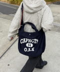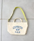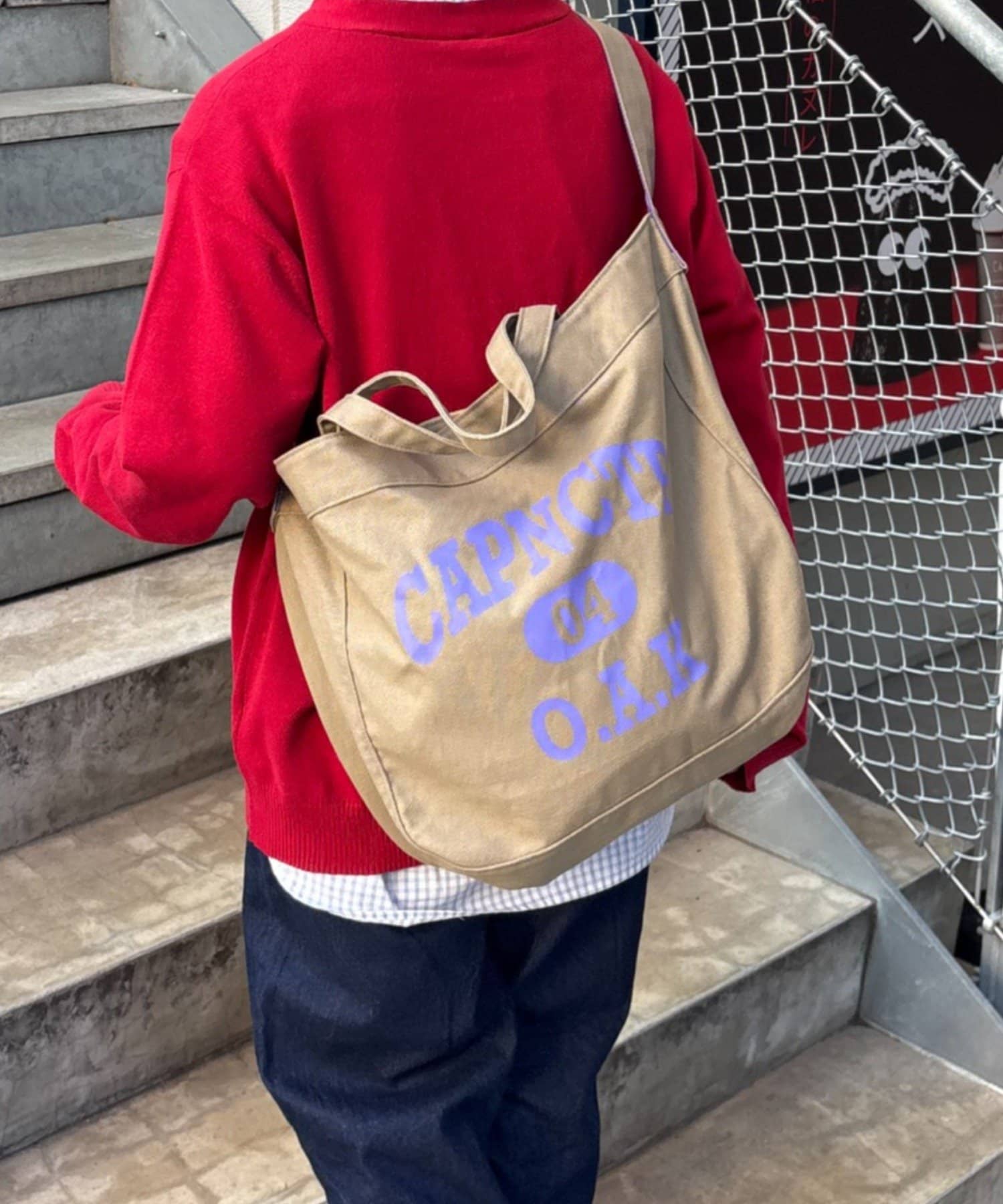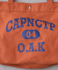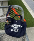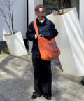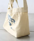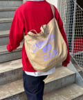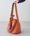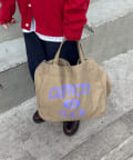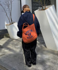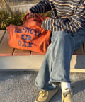 フロントに大胆にプリントされたブランドロゴが、目を引くデザイントートバッグ。