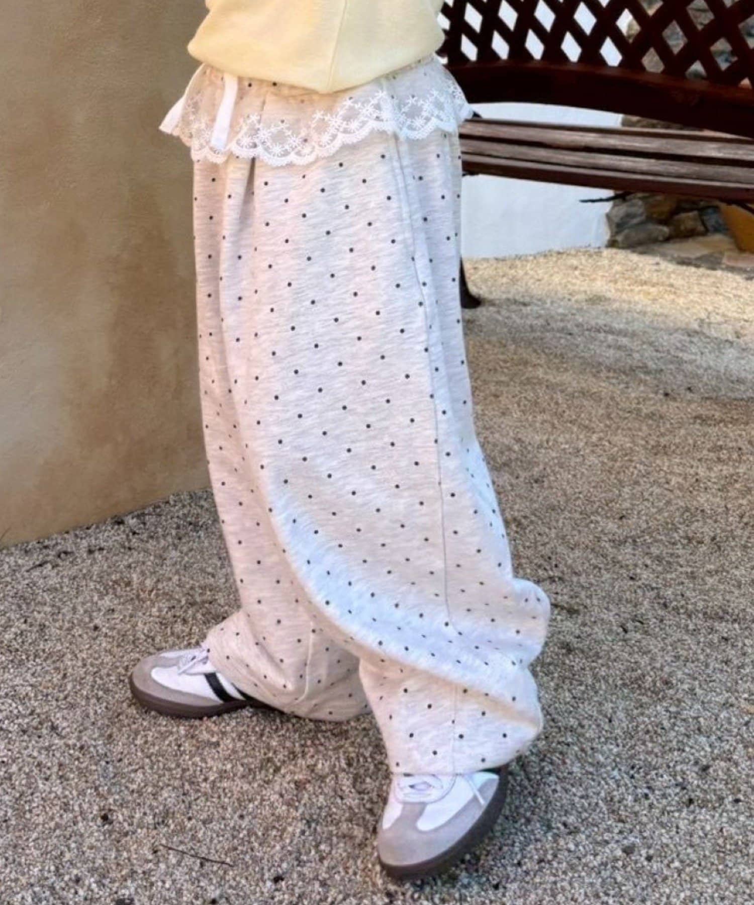 レトロポップなドット柄が目を惹くスウェットパンツ。