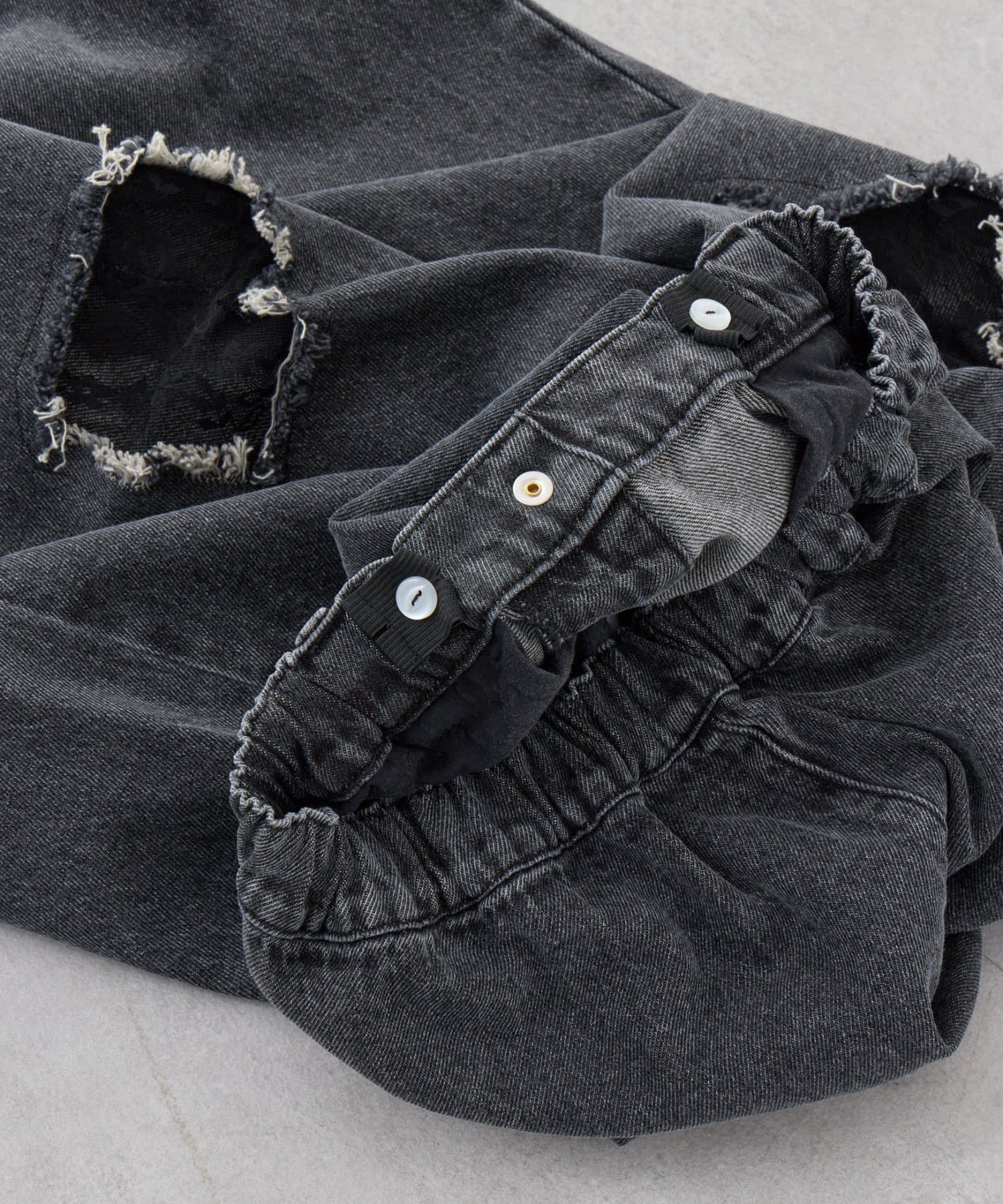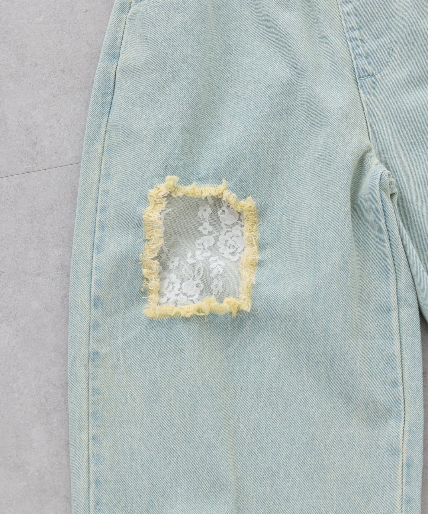 ダメージ部分に、レース素材がドッキングしたデザインです。