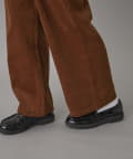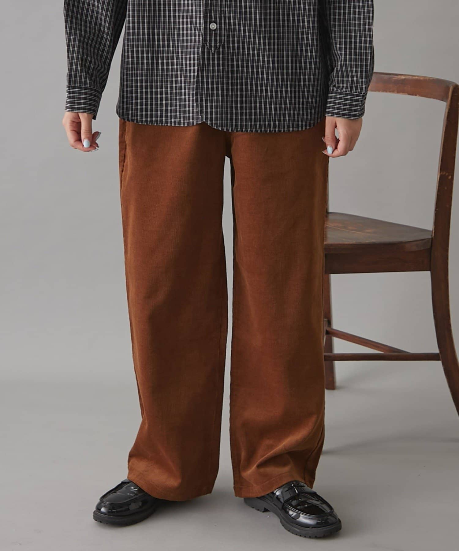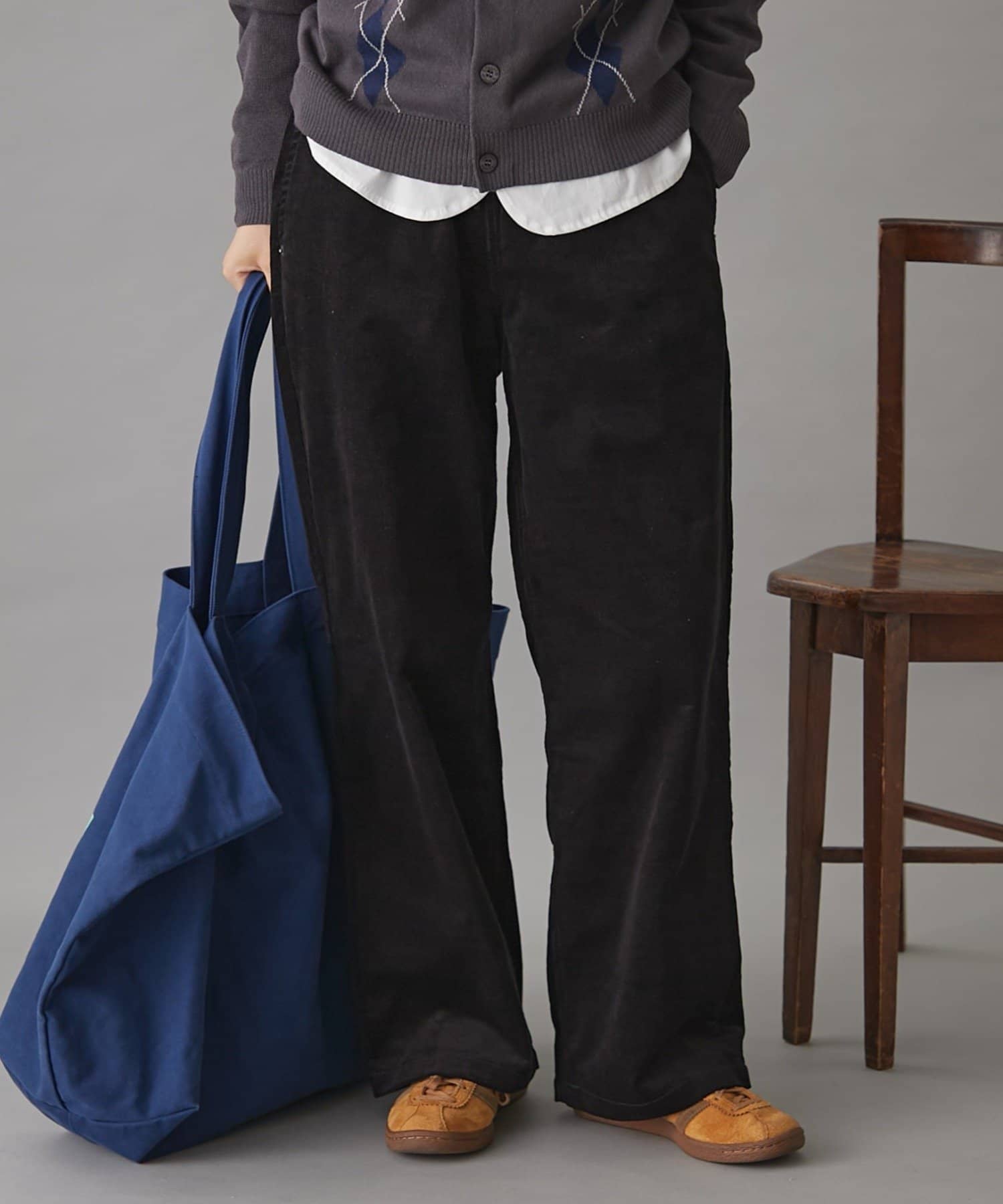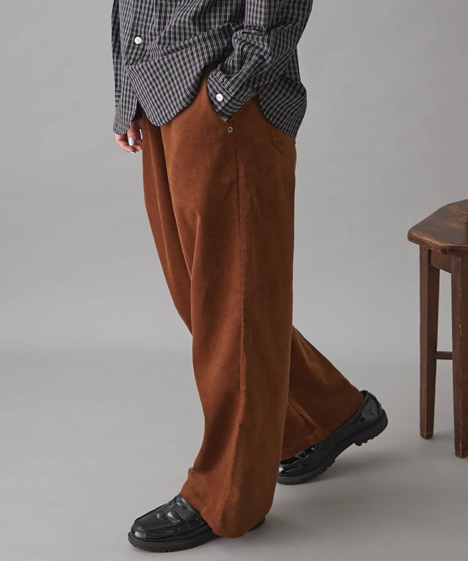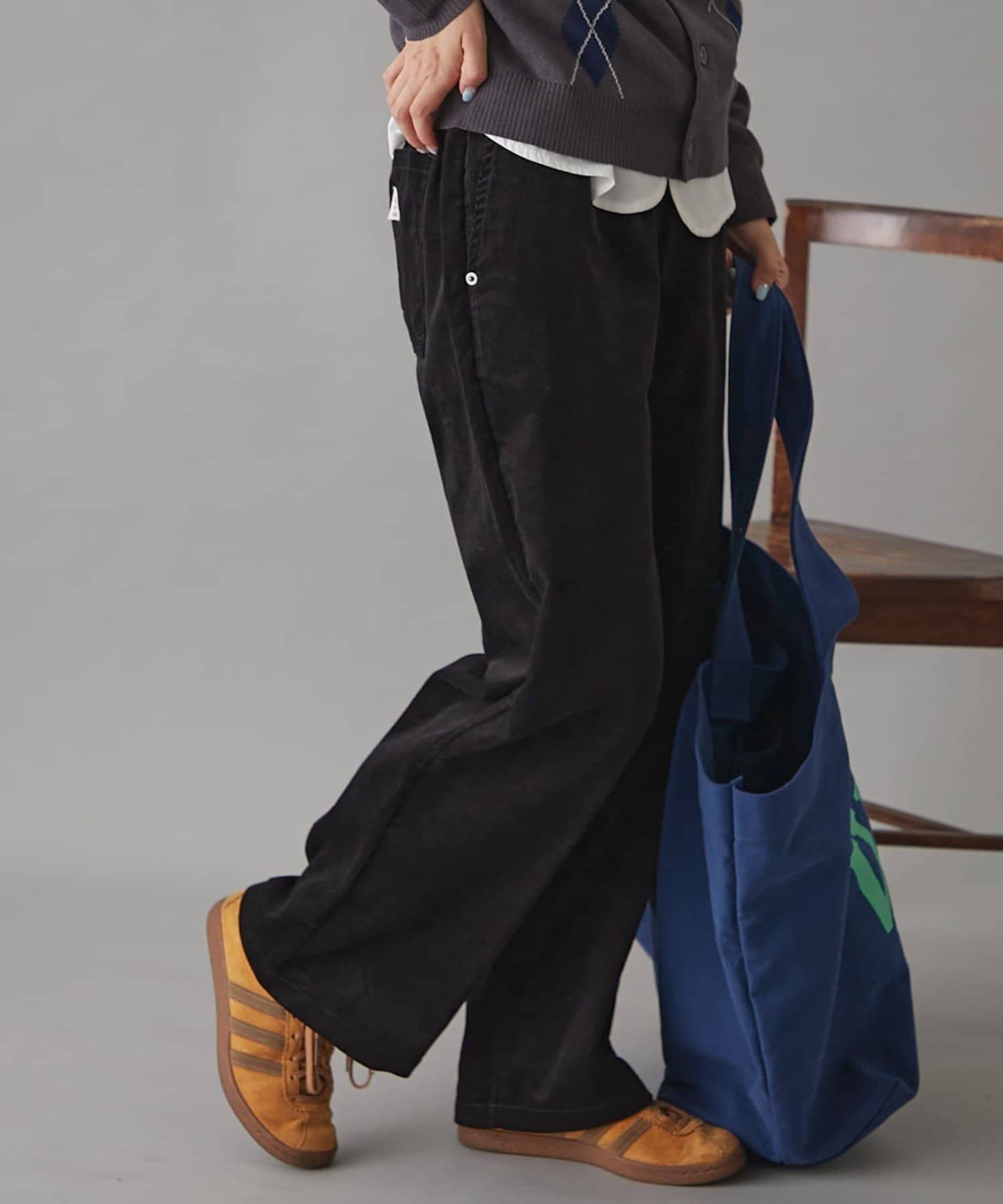 温かみのあるコーデュロイ素材が特徴的なワイドパンツ。