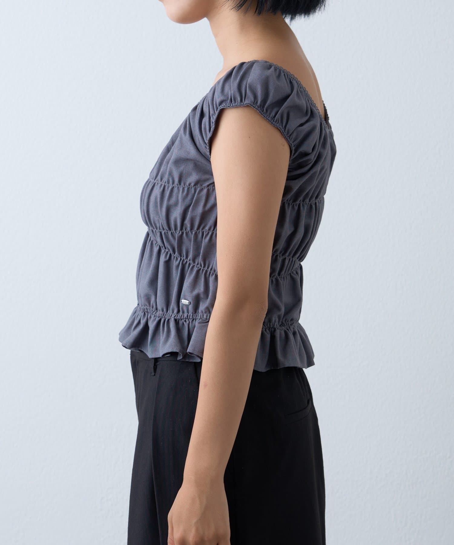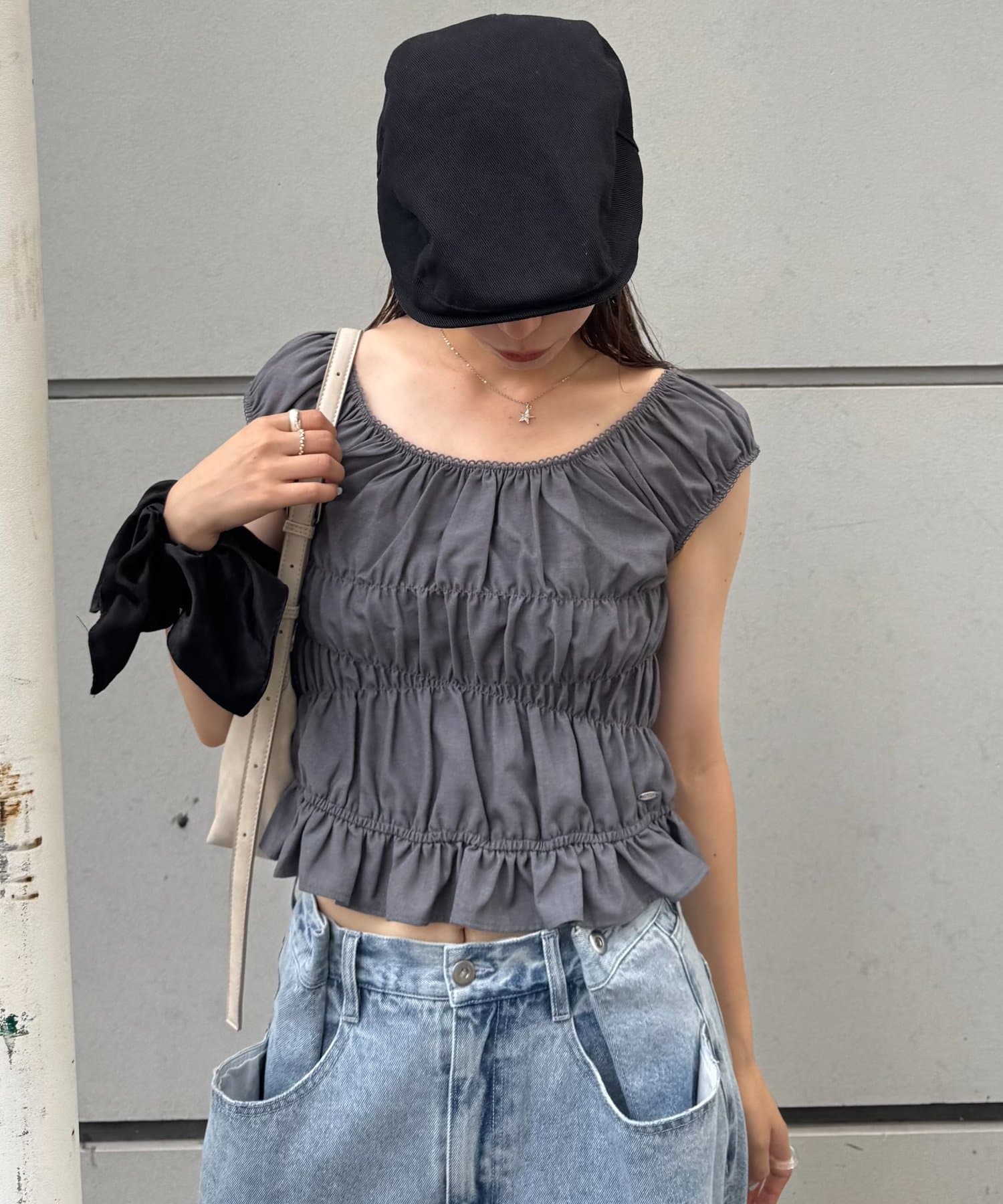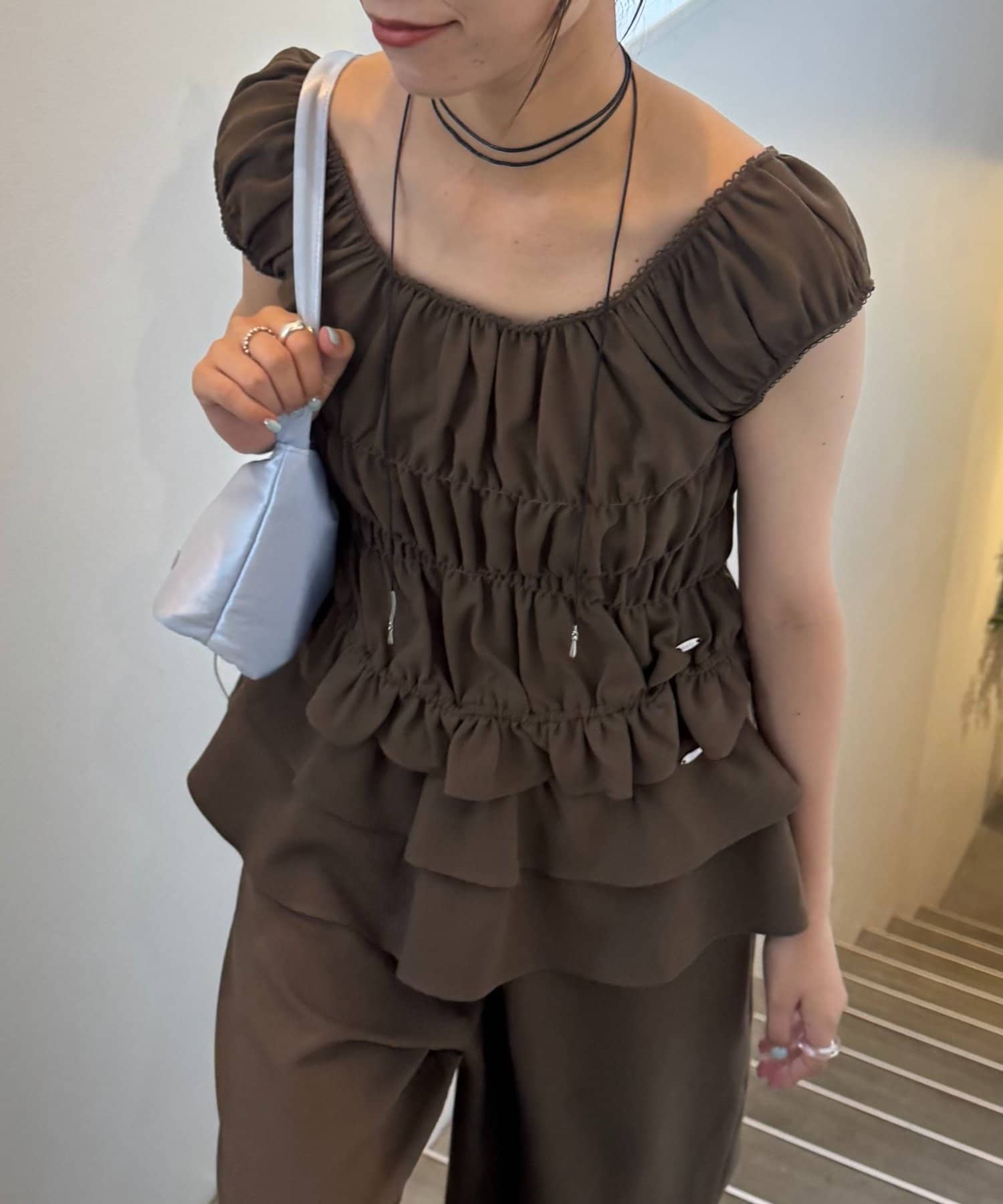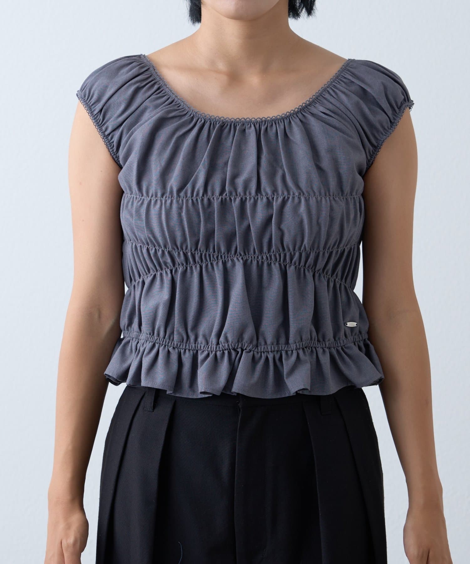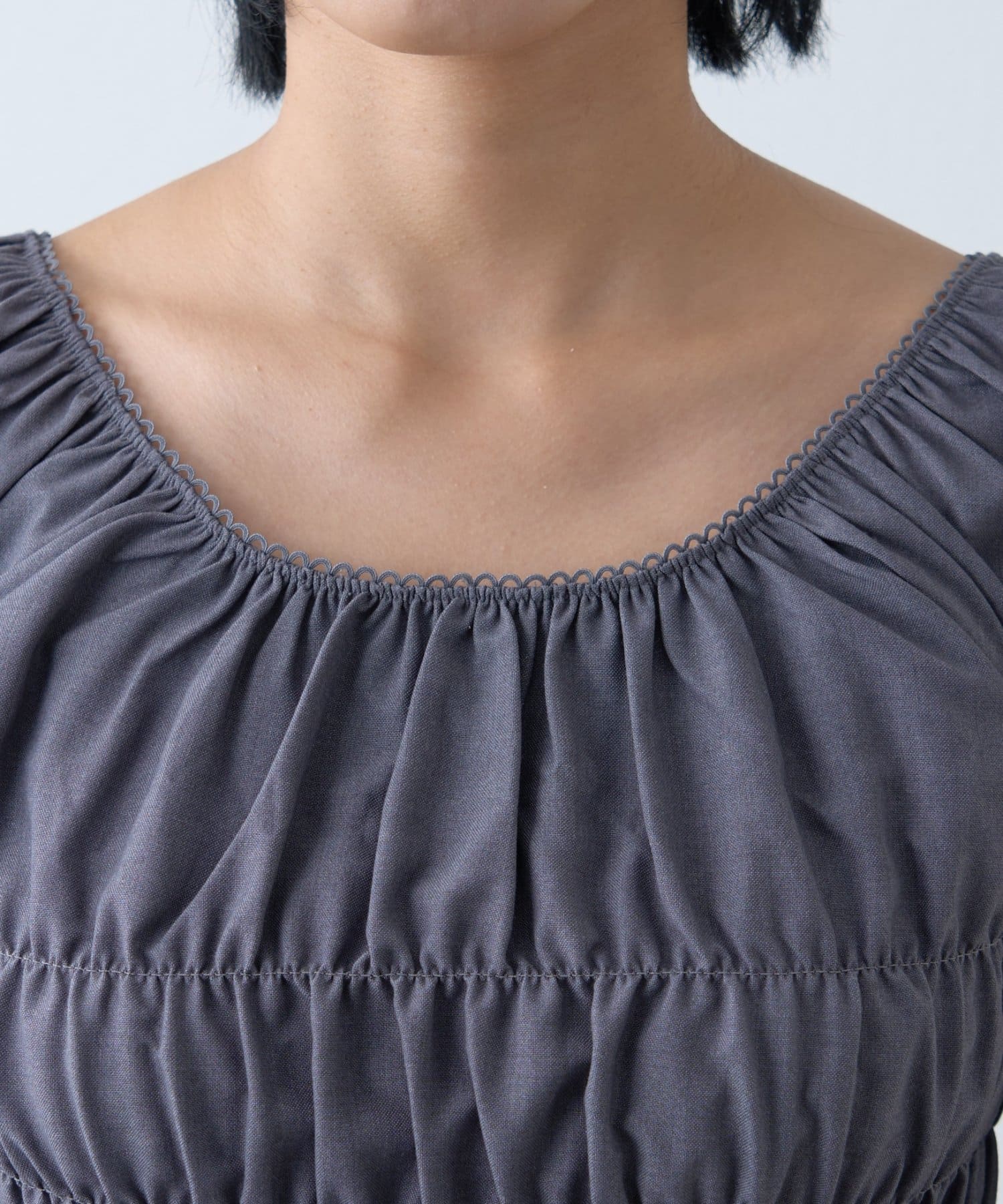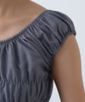 甘めなシャーリングデザインは、透け感のない程よい厚みのある素材にすることで一枚でも着ても可愛くなるように