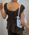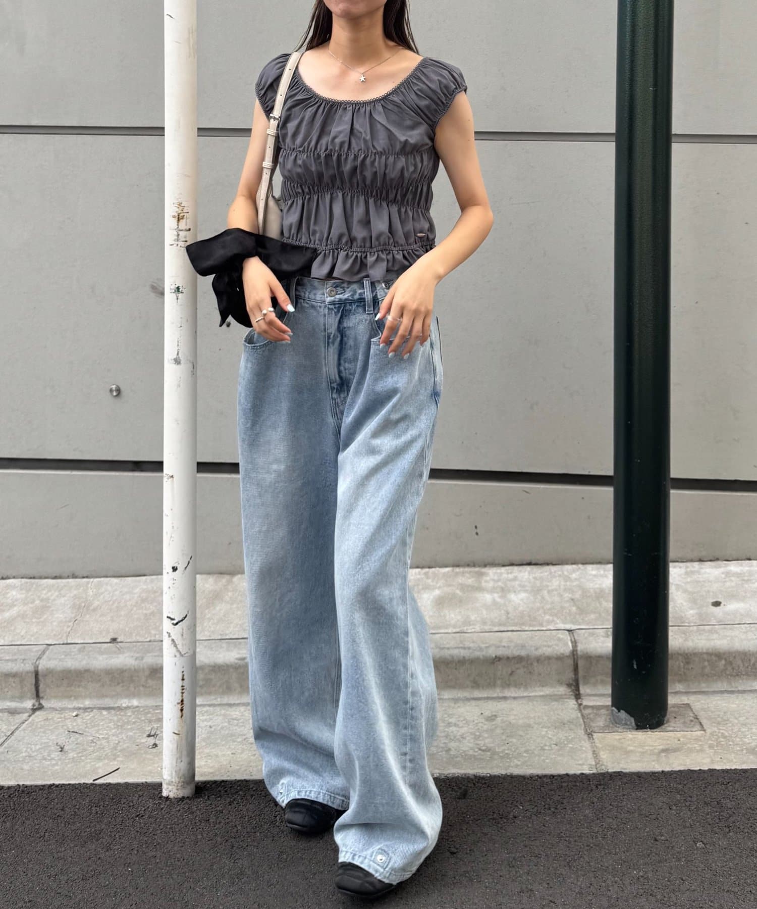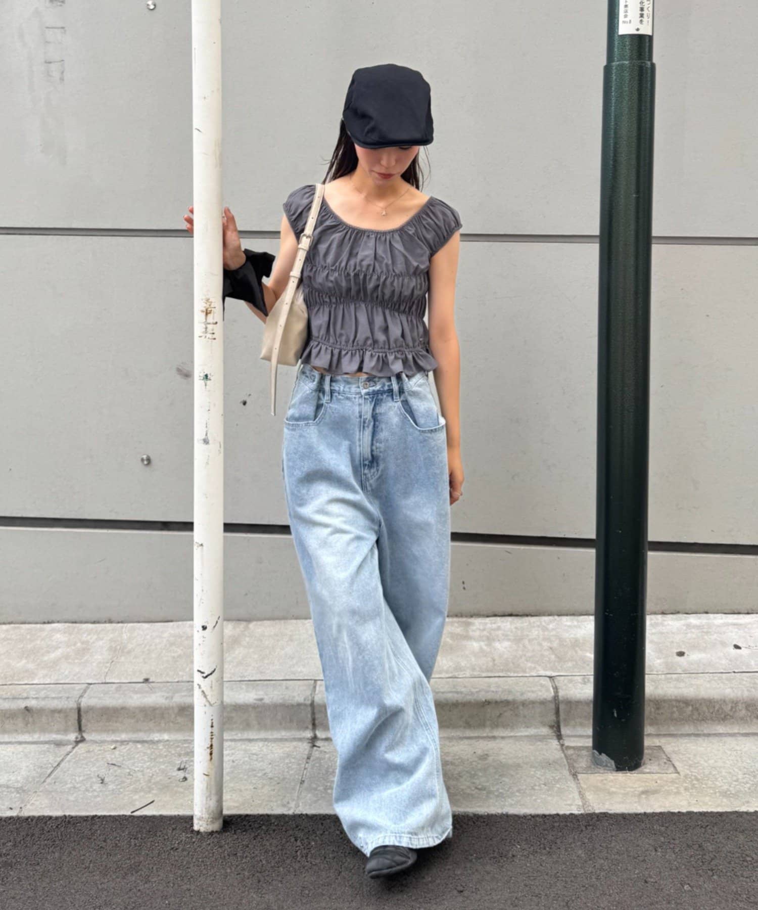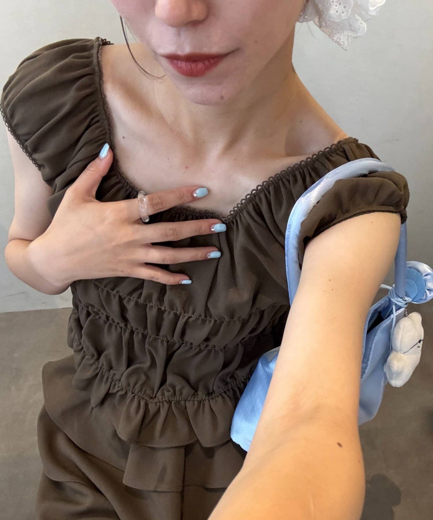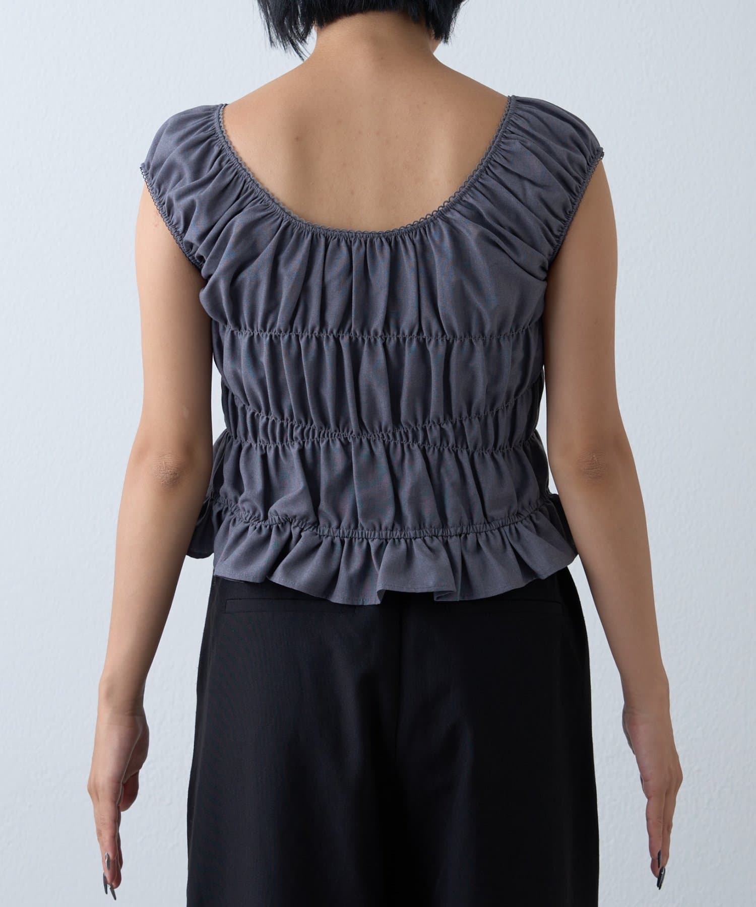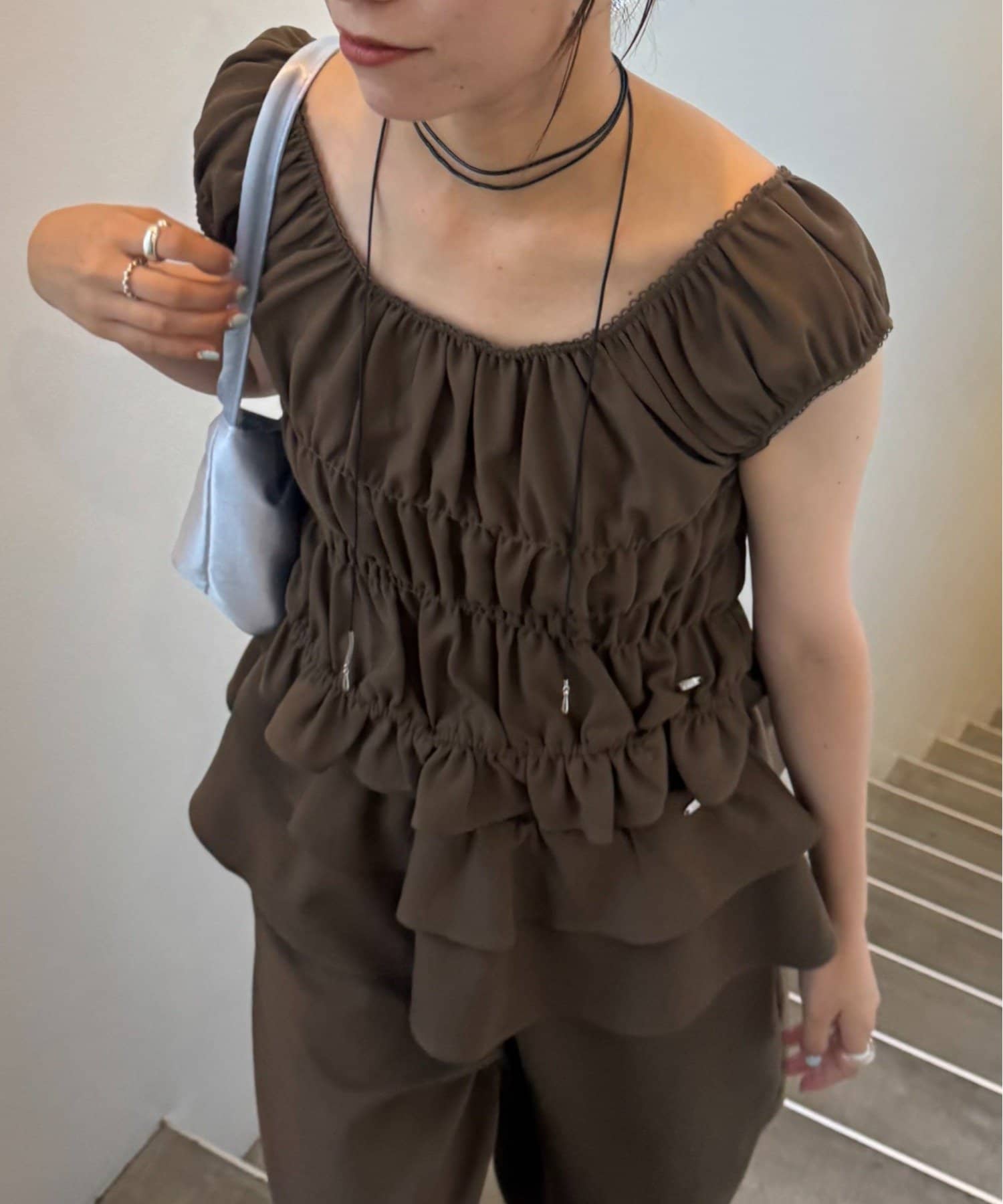 甘めなシャーリングデザインは、透け感のない程よい厚みのある素材にすることで一枚でも着ても可愛くなるように