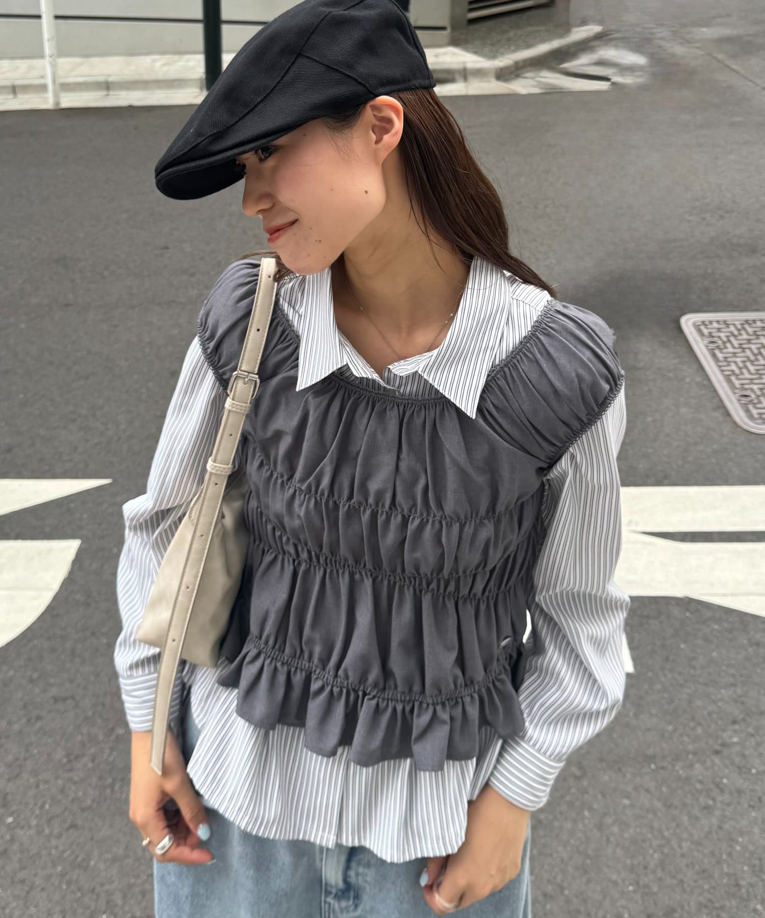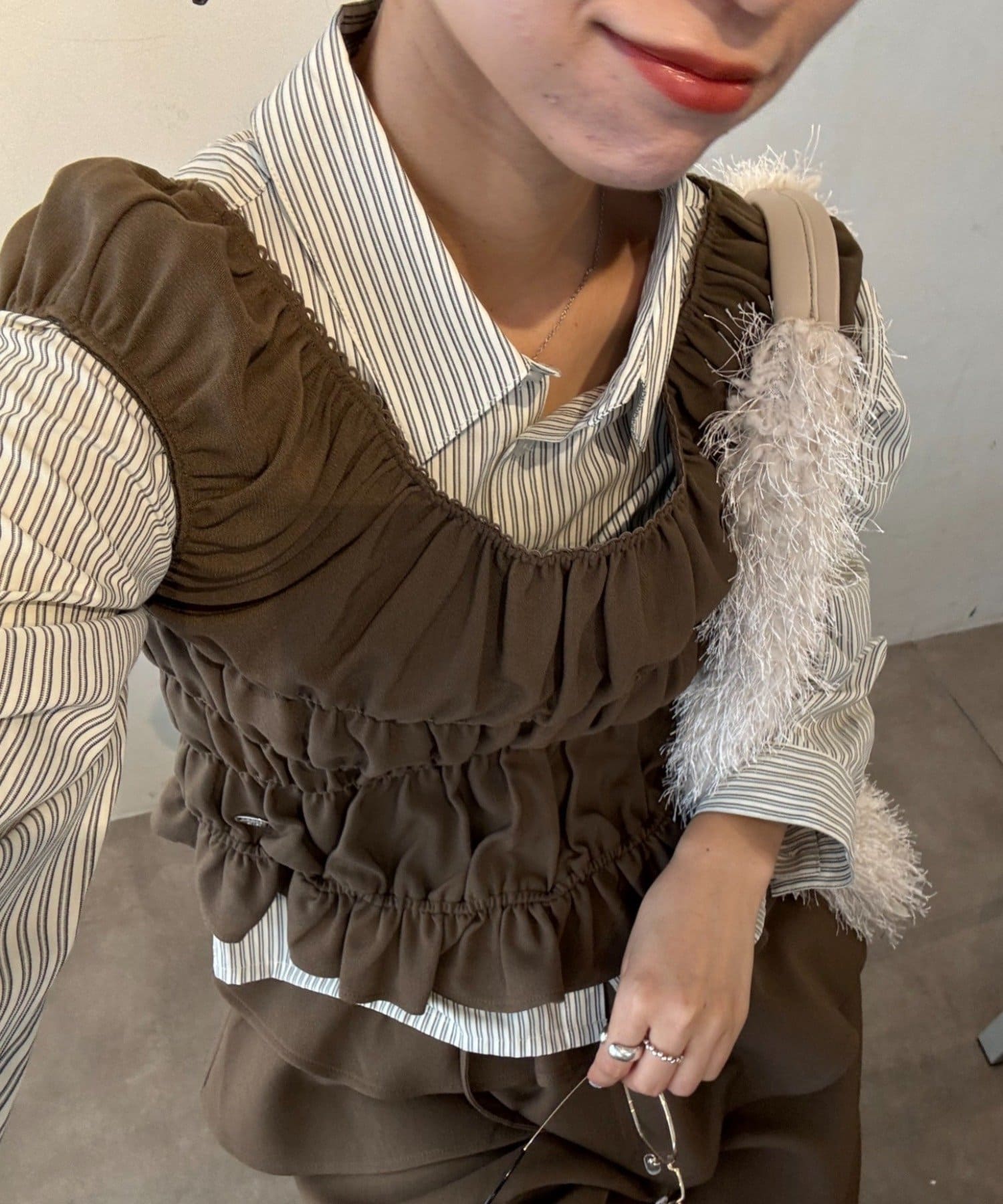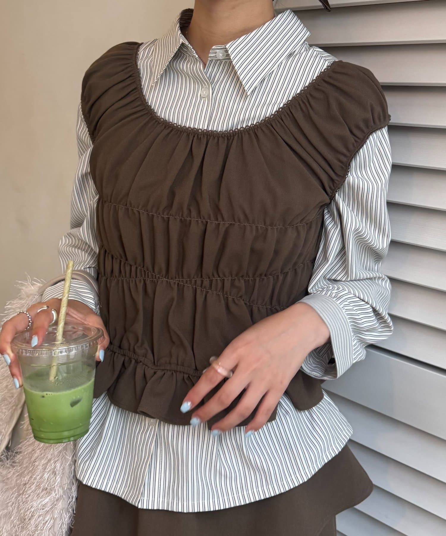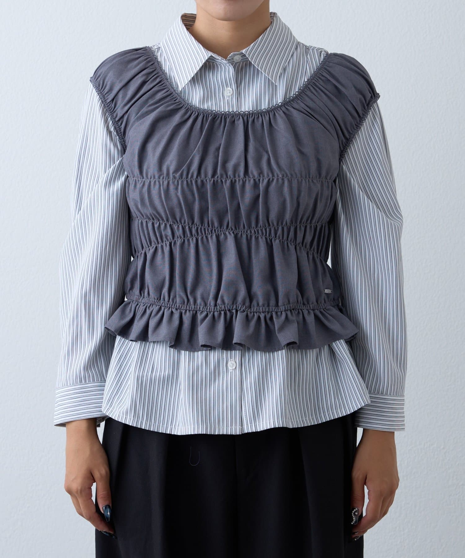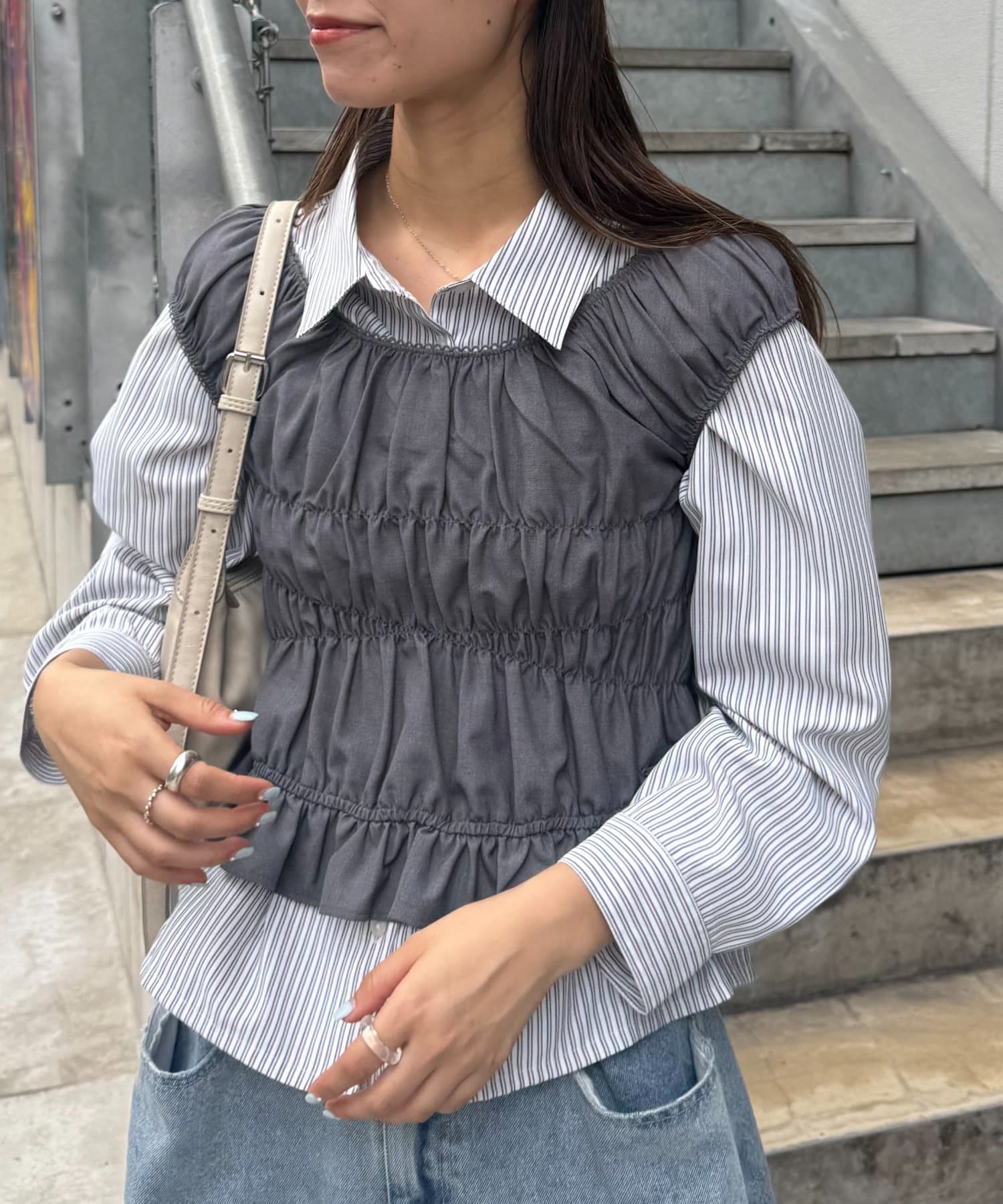 【簡単レイヤードが叶うセットアイテム】シャーリングビスチェ付きストライプシャツ