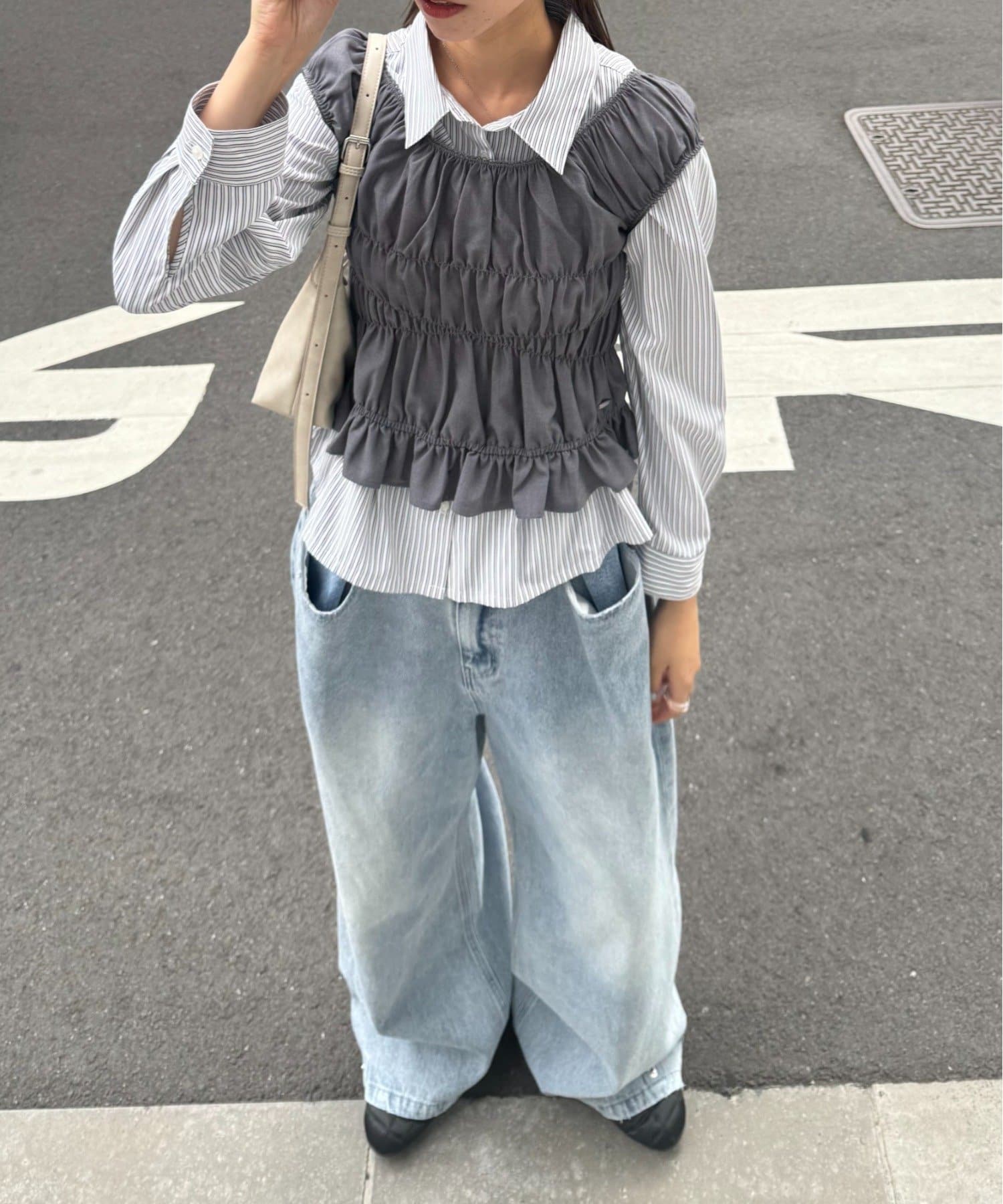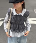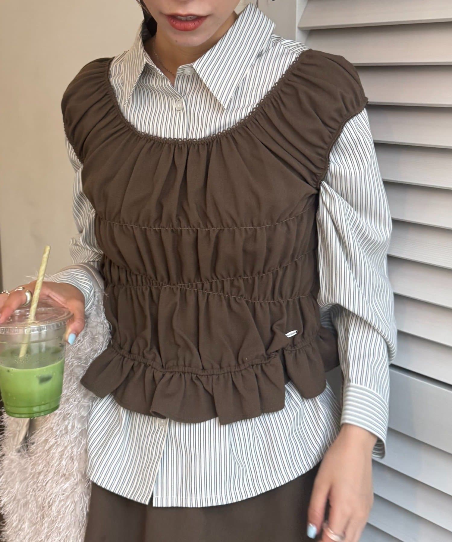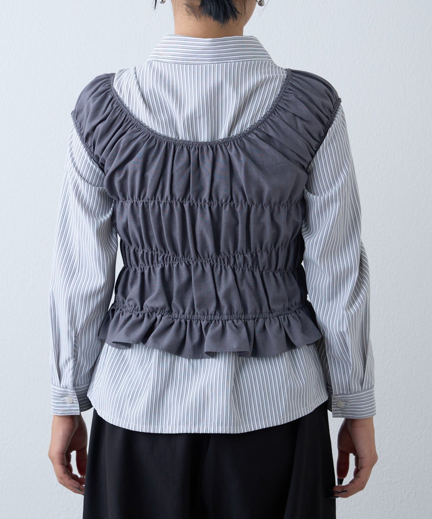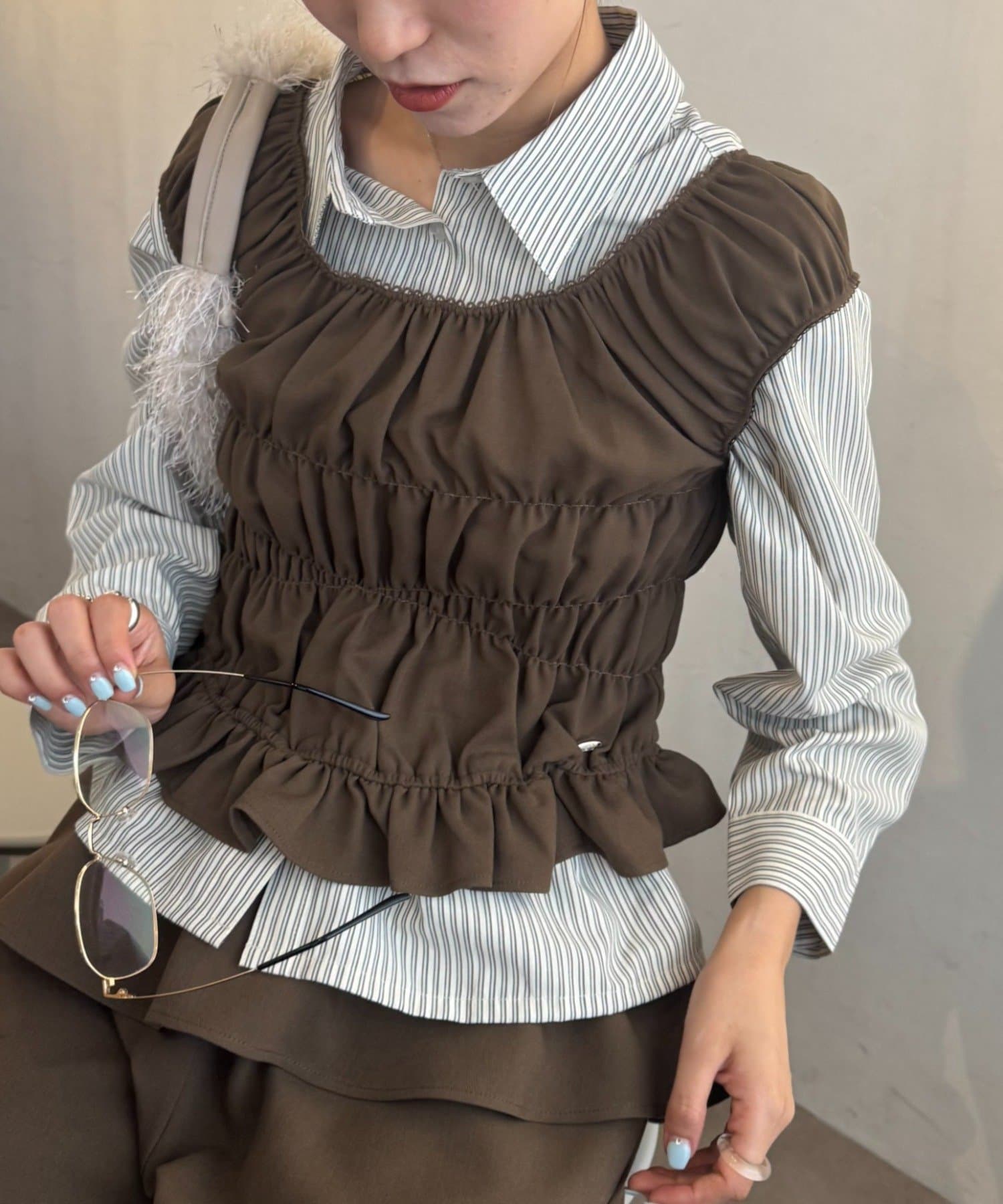 【簡単レイヤードが叶うセットアイテム】シャーリングビスチェ付きストライプシャツ
