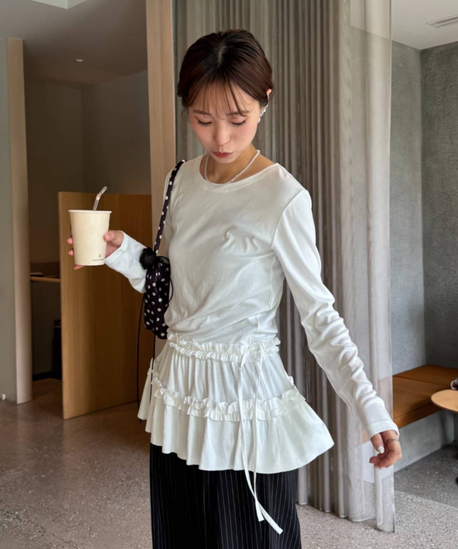 裾フリルトップス(ホワイト)はサイドのリボンを結べば、さらにウエストマークでき、スタイルアップ効果も期待できます。