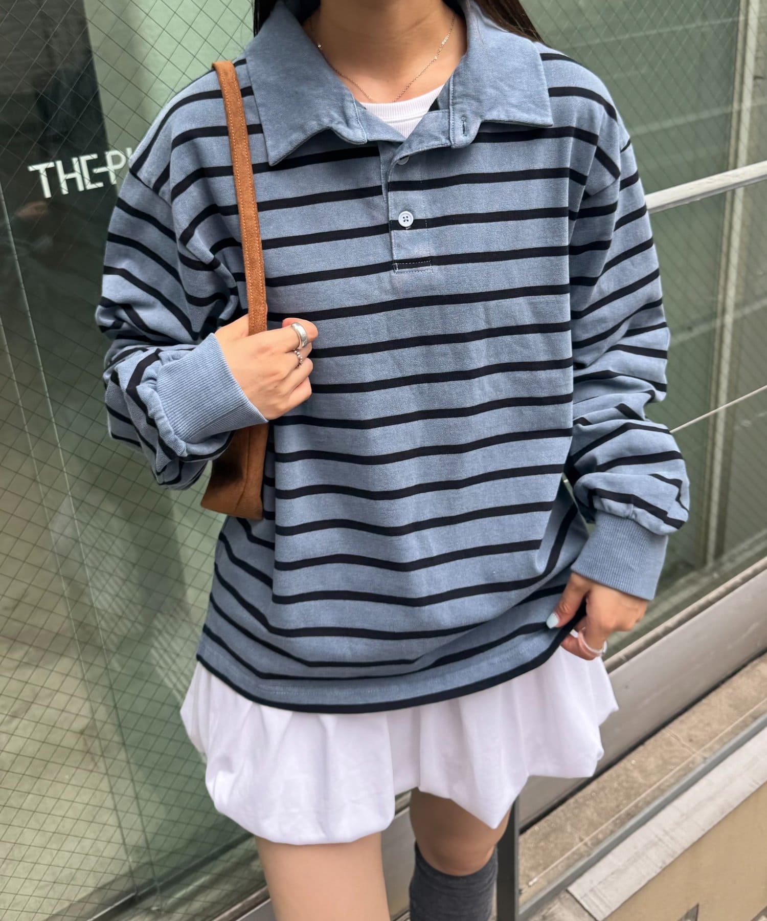 スウェットやカーディガンなどの下にレイヤードするとトレンドライクなコーデに。