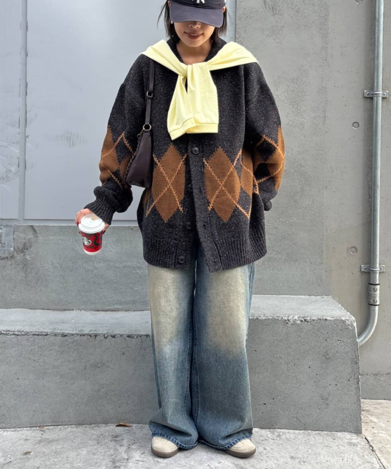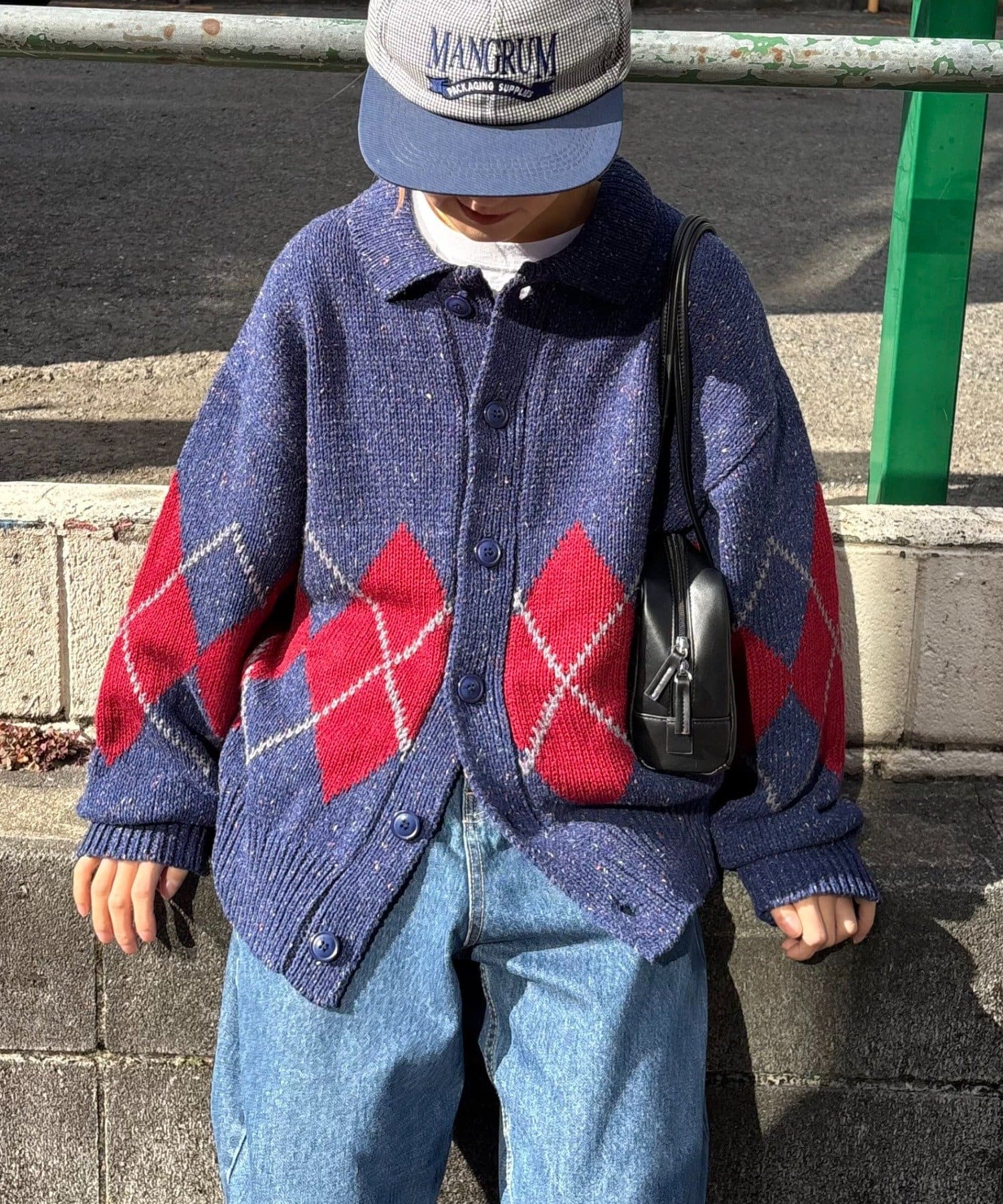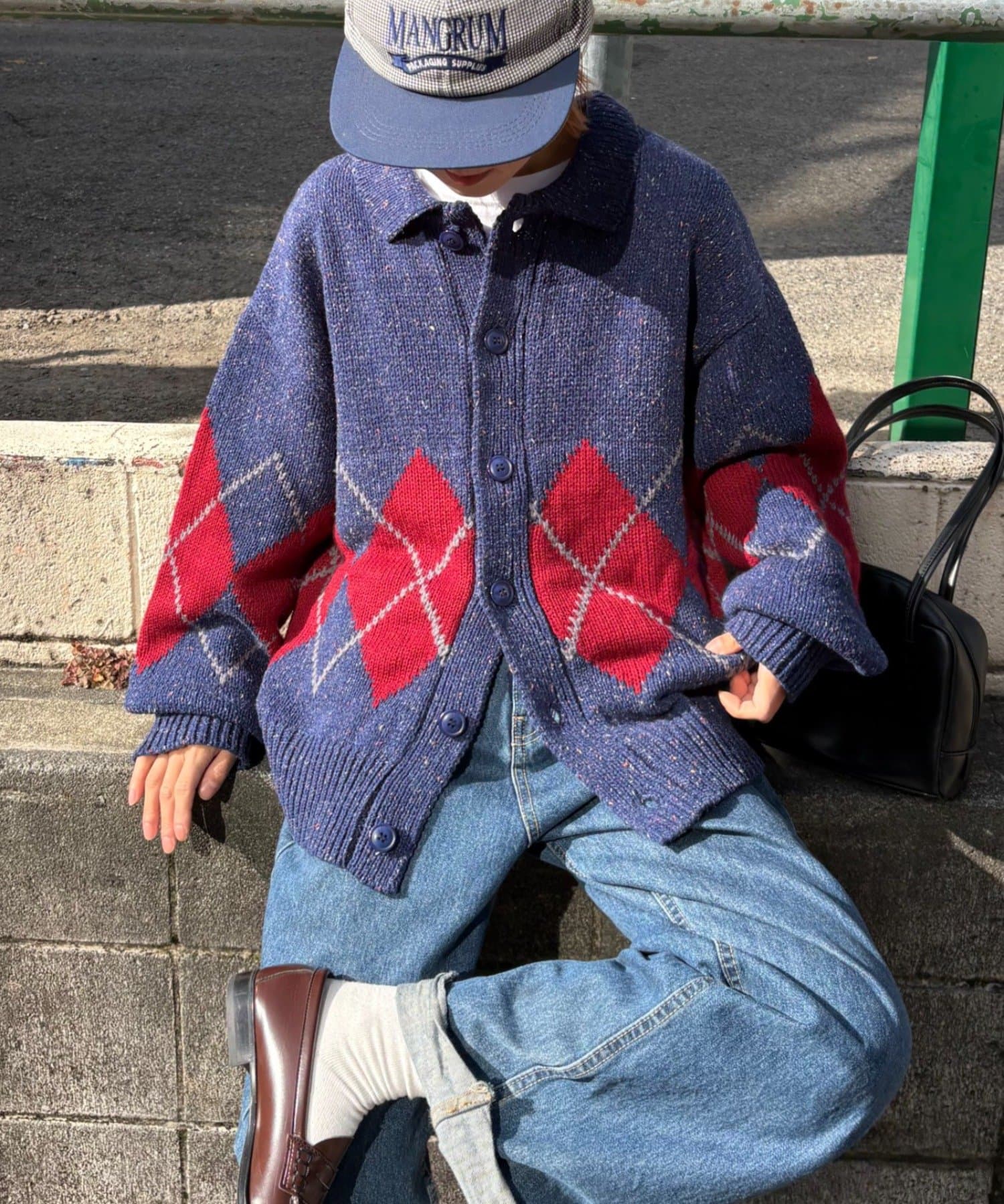 どこか懐かしい雰囲気のアーガイル柄ニット。