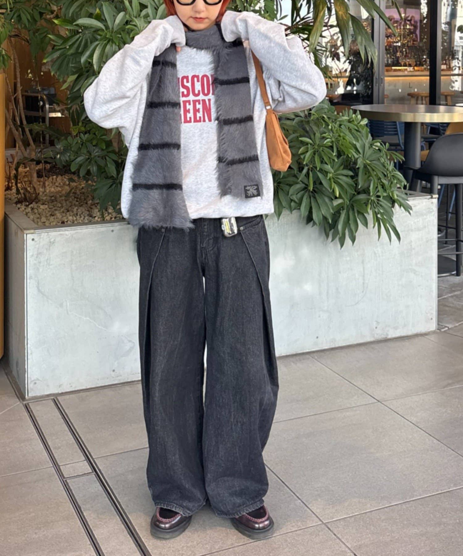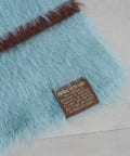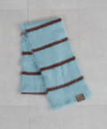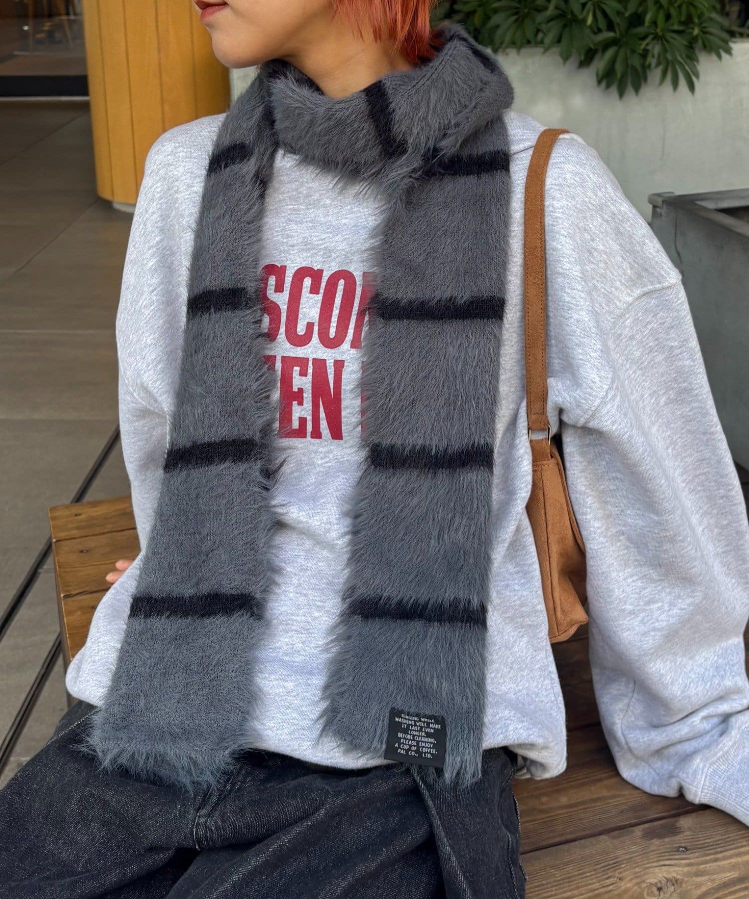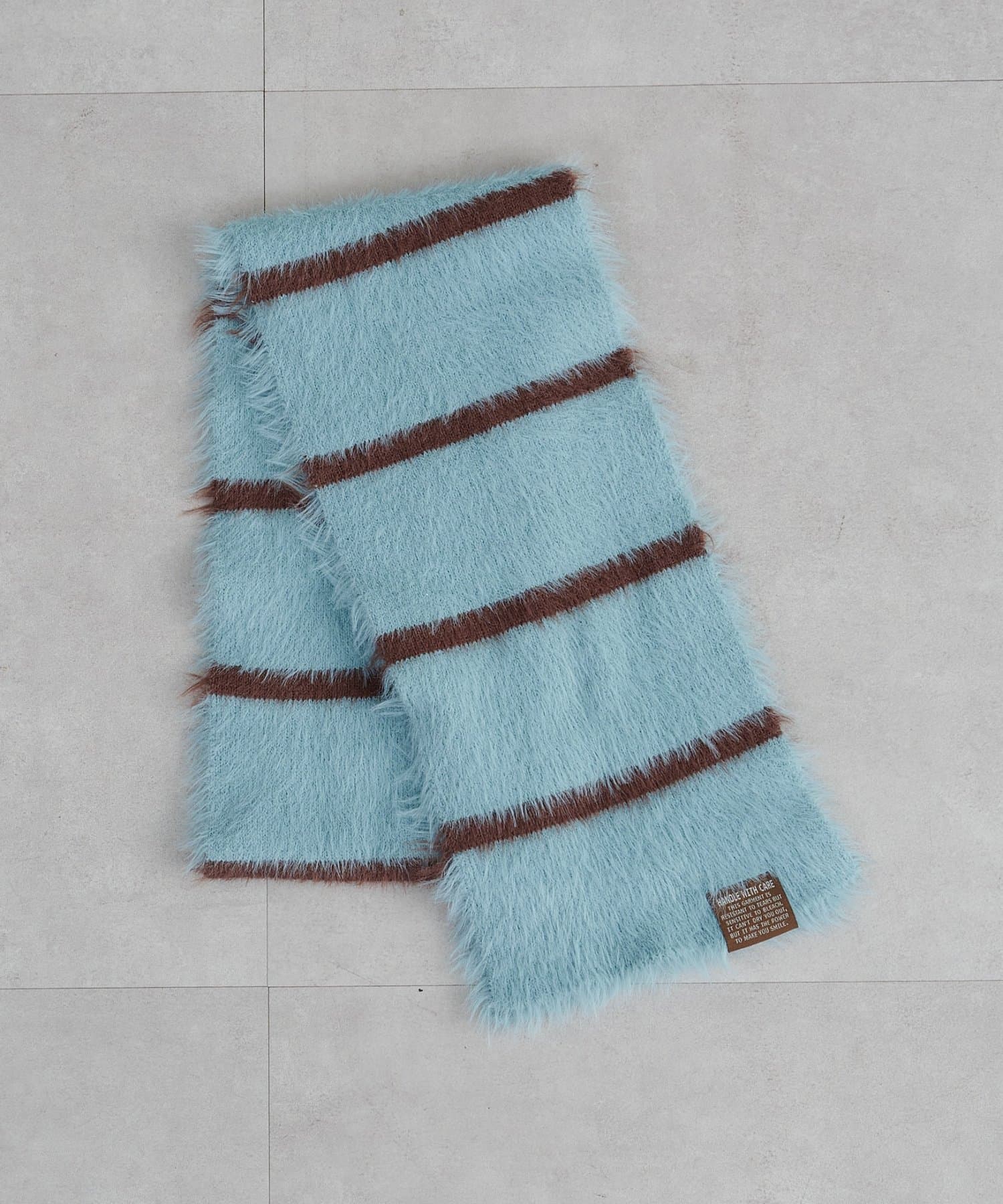 ふわふわのシャギー素材が、首元を優しく包み込む、レトロな雰囲気漂うボーダーマフラーです。