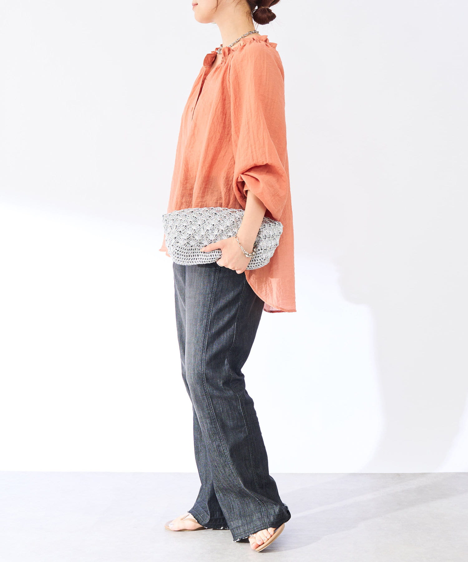 甘さもあるデザインなのでデニムやカーゴパンツなど、メンズライクなボトムでバランスを取っても◎