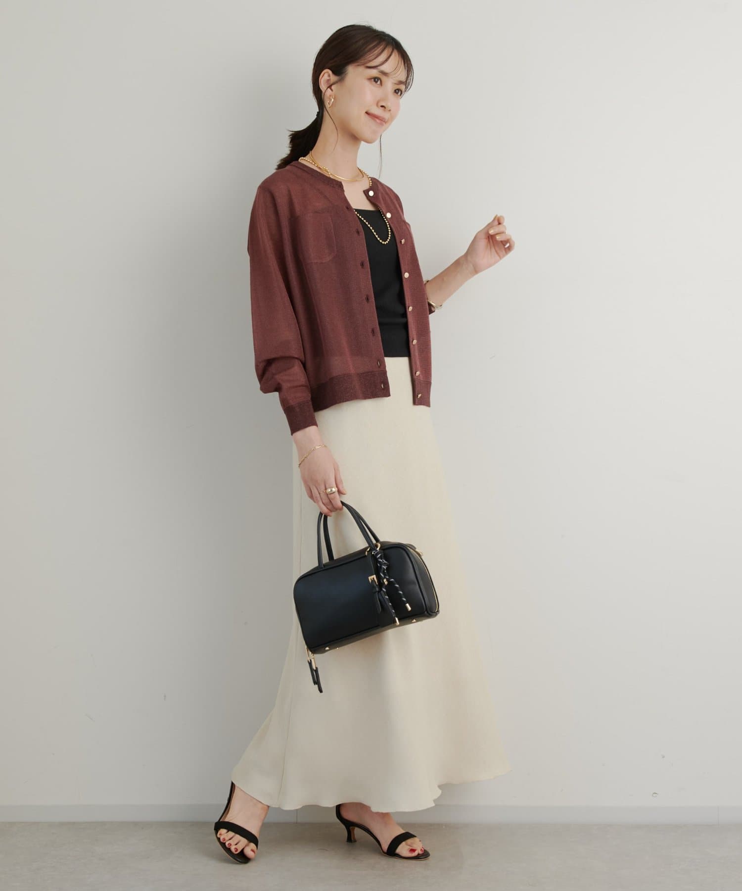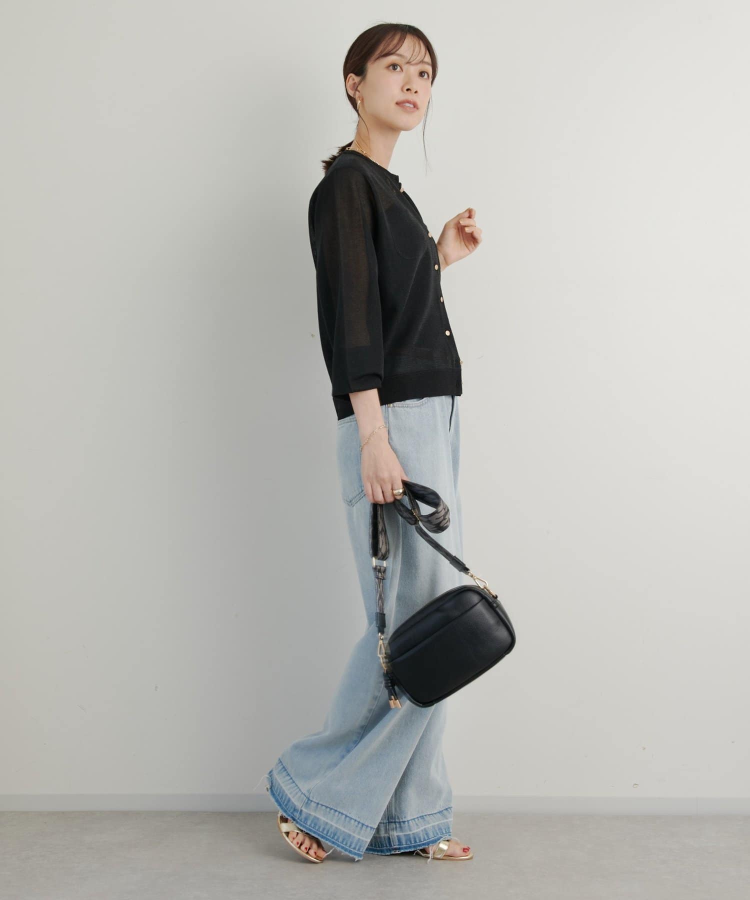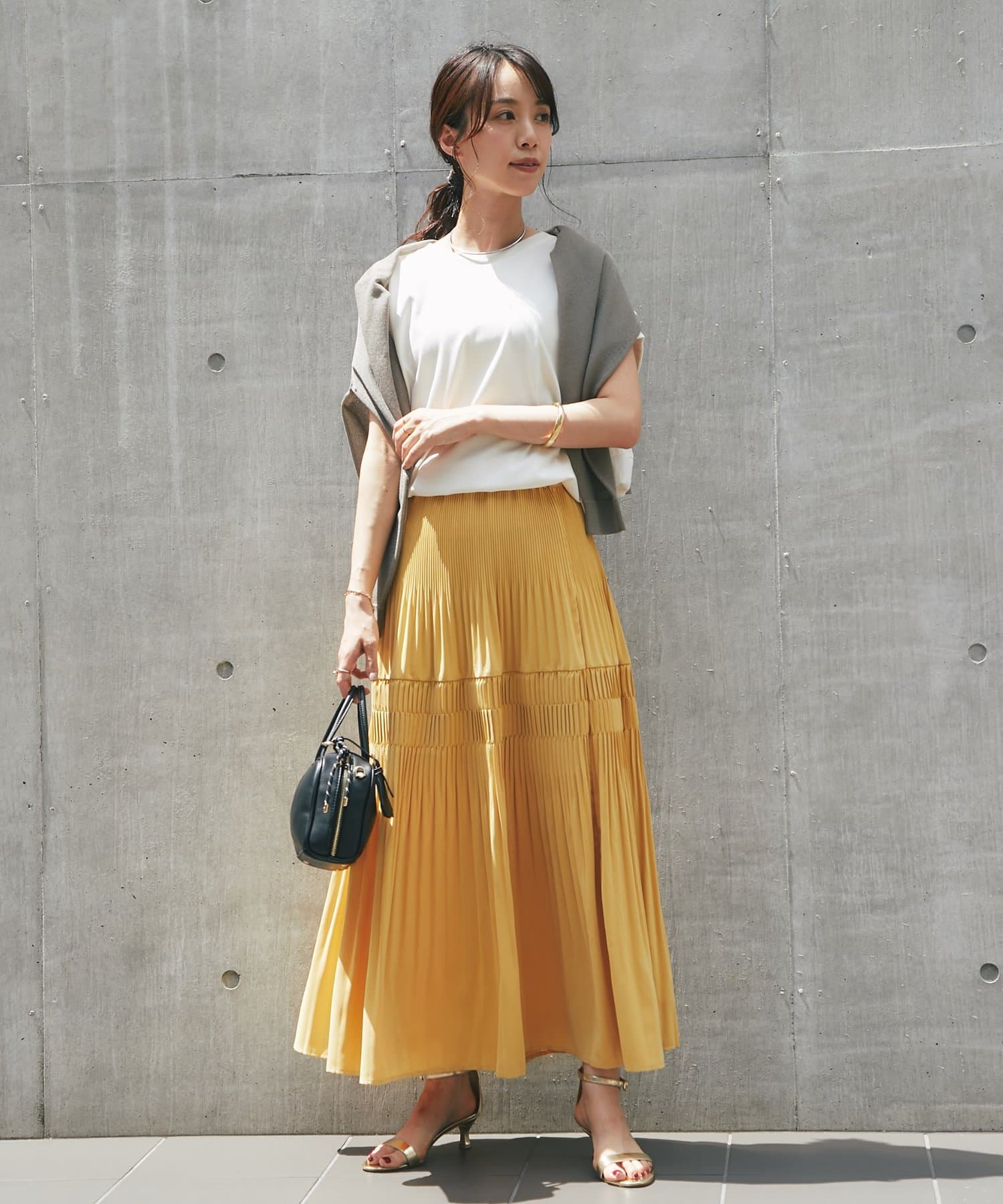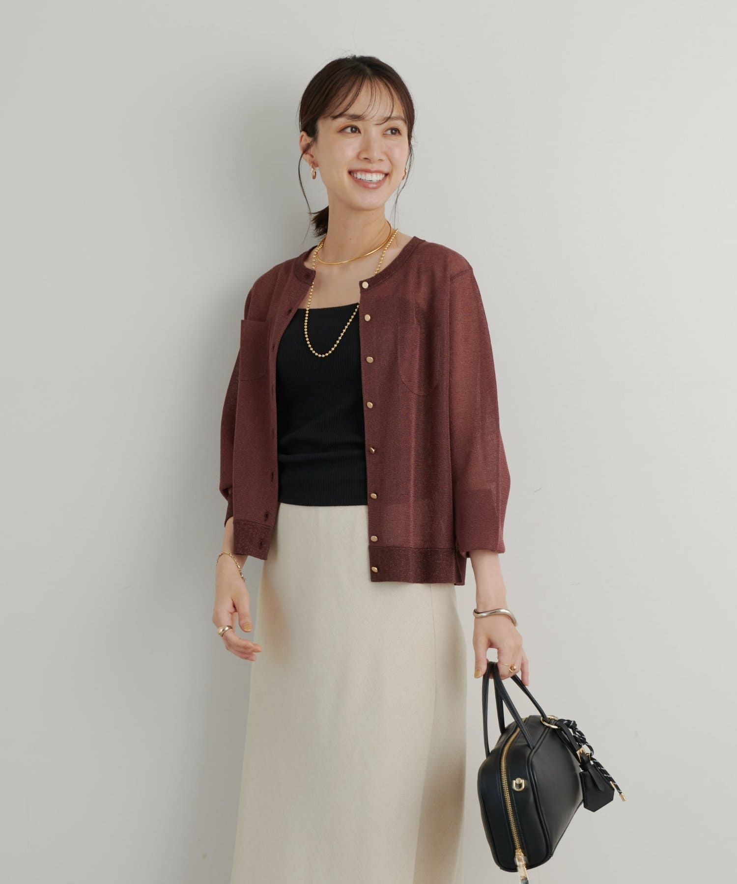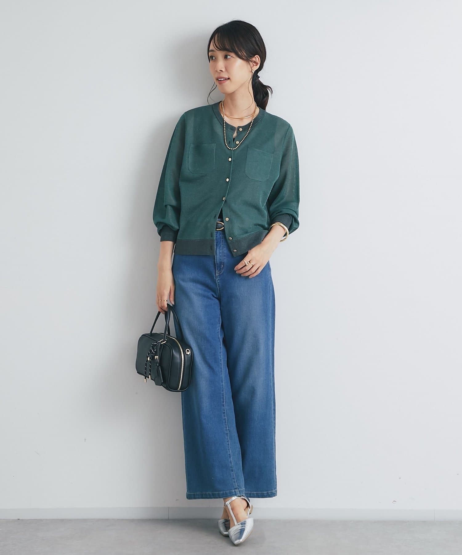 ゴールドのボタンに合わせてゴールドカラーのアクセサリーをつけていただくとより上品な印象に。