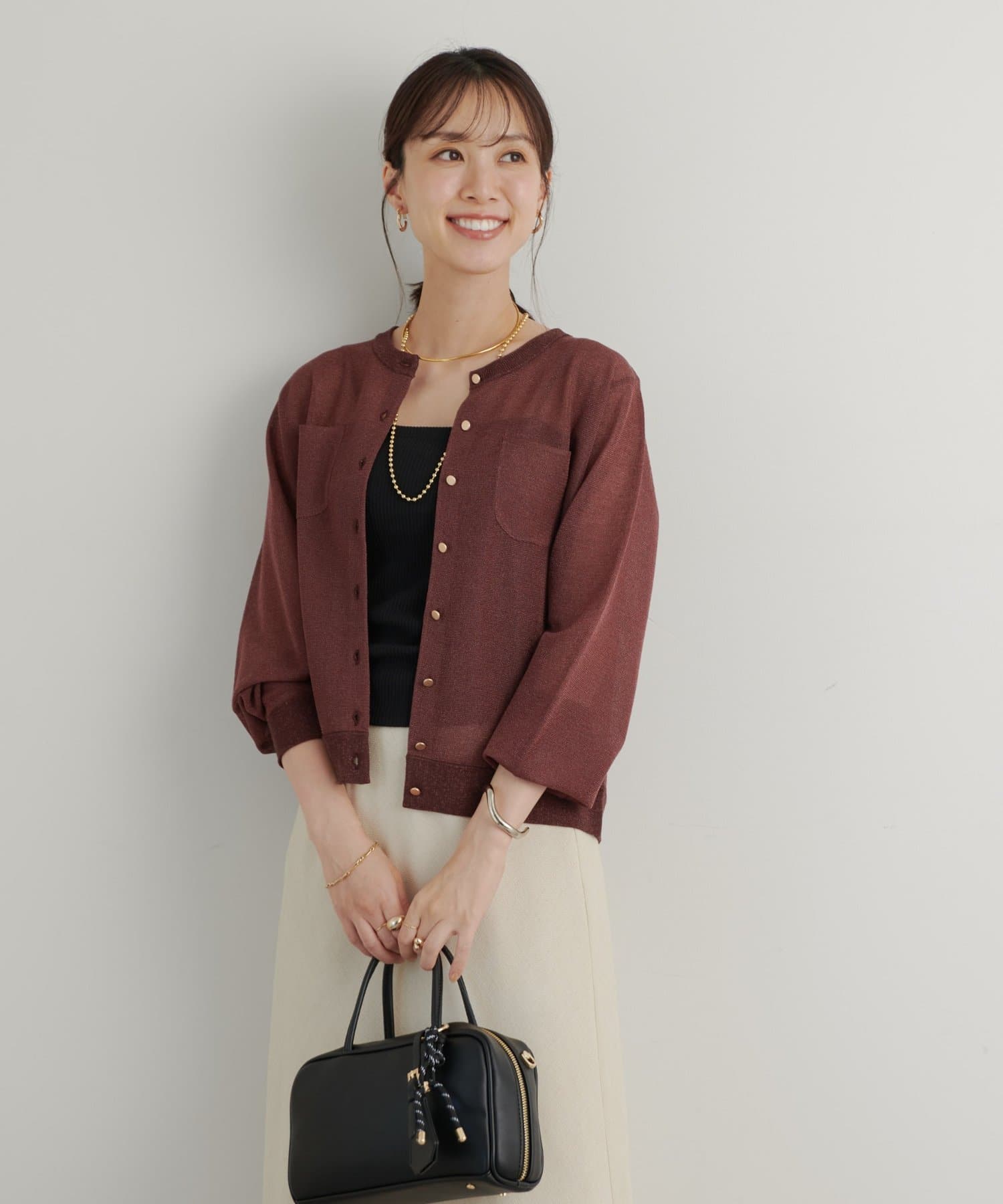 《大人可愛くきちんと見え》クルーネックラメニットカーディガン
