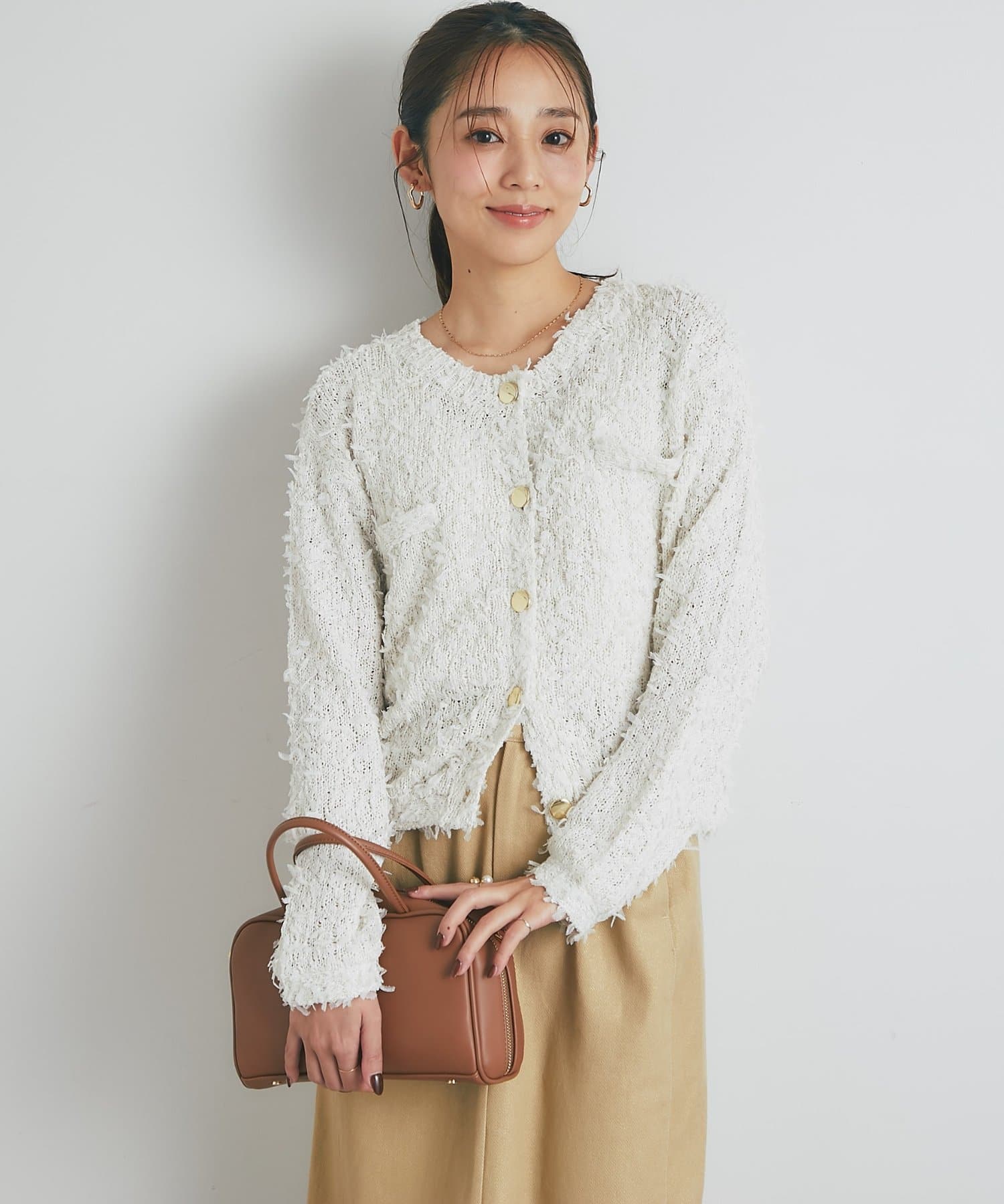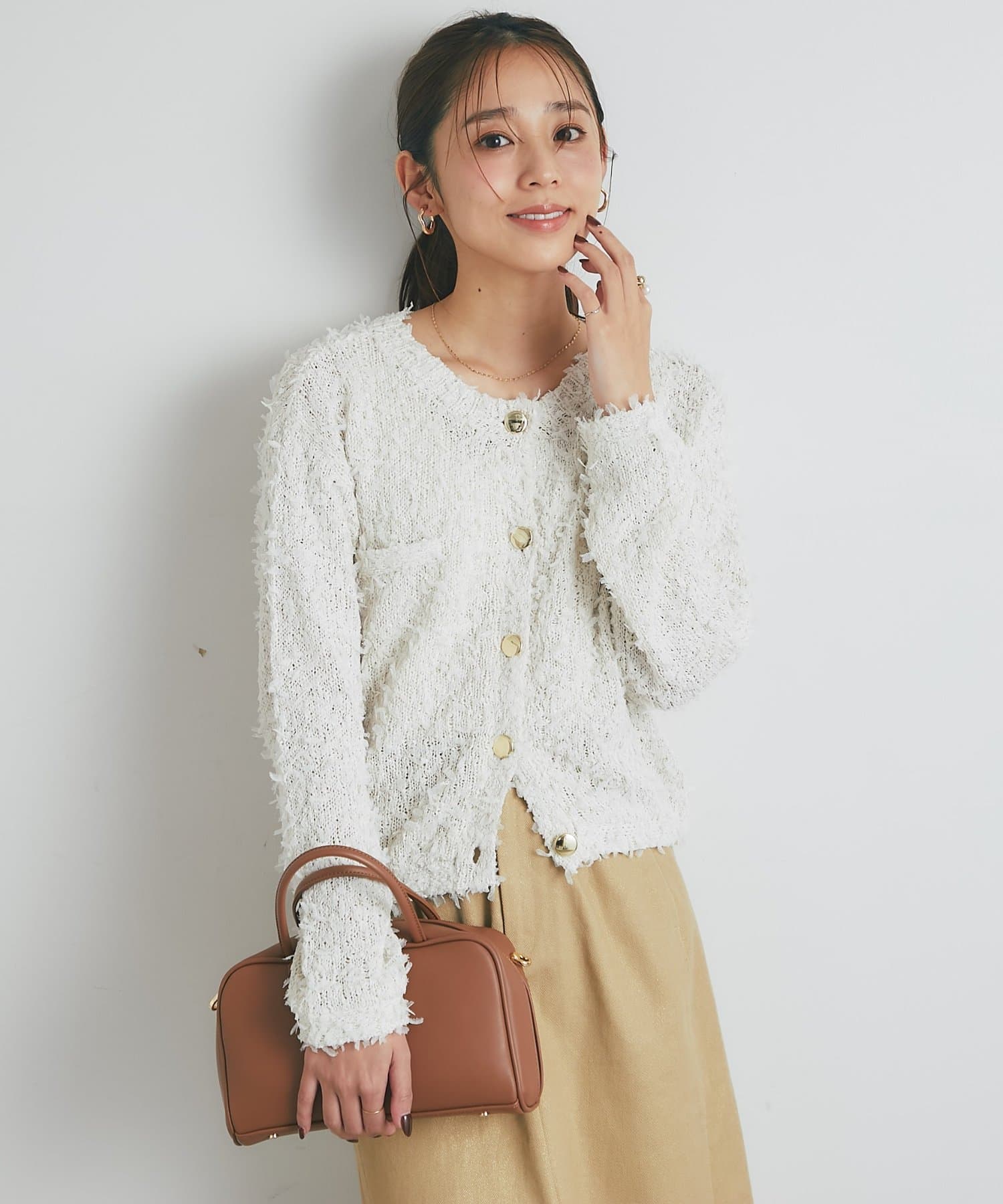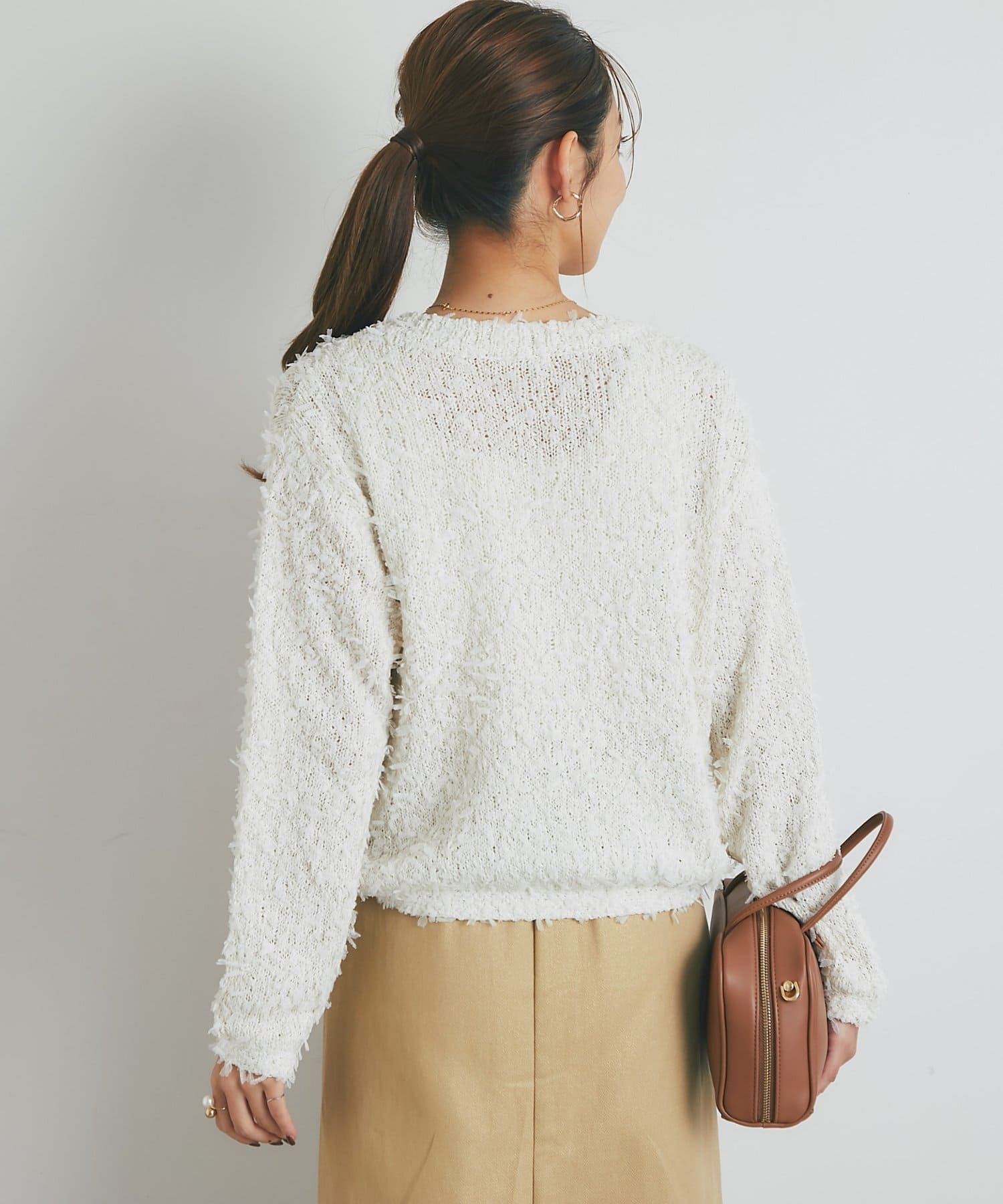 ・ほんのりラメ感がポイントの、チュールテープヤーン素材で抜け感を演出してくれるカーディガン。