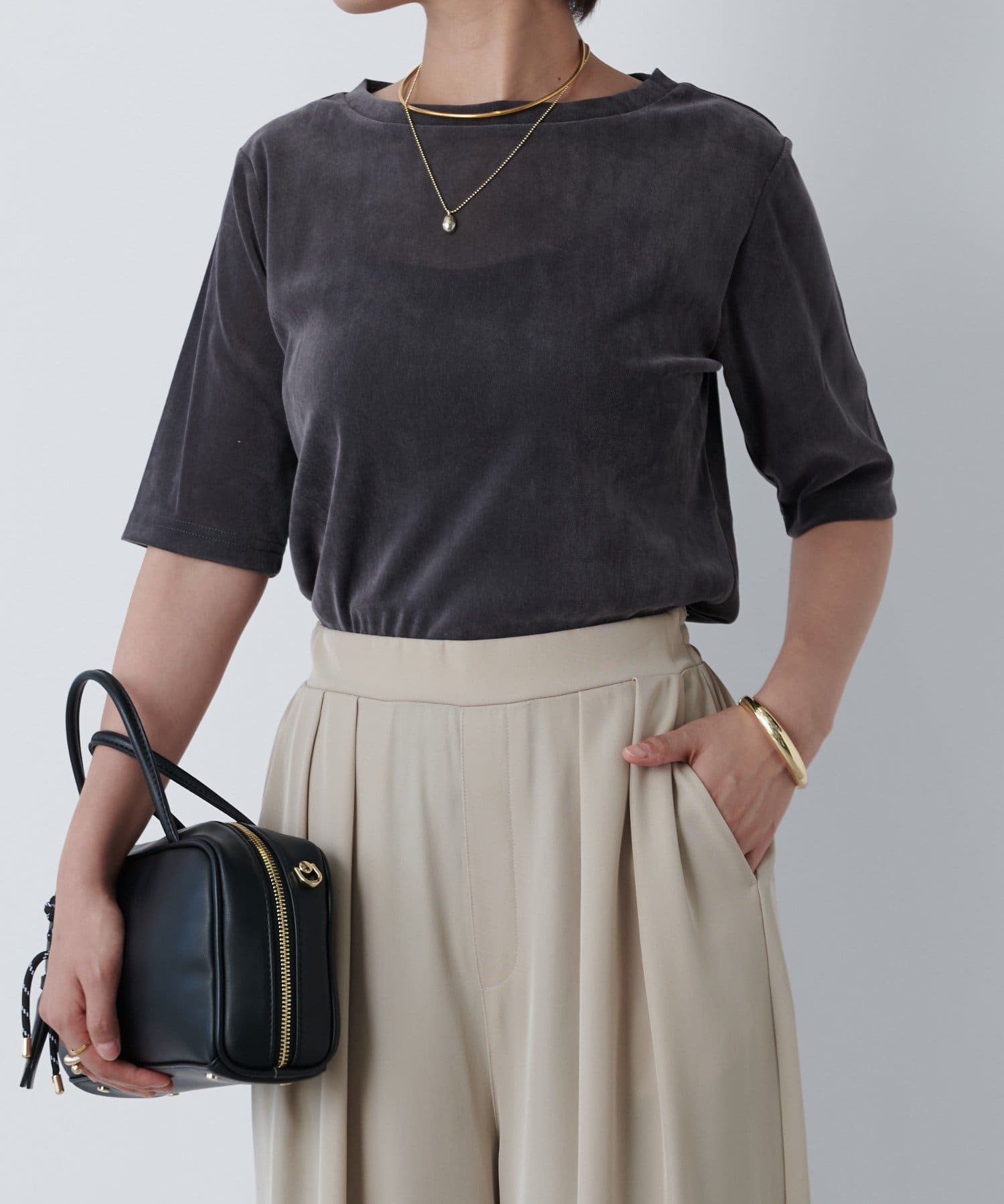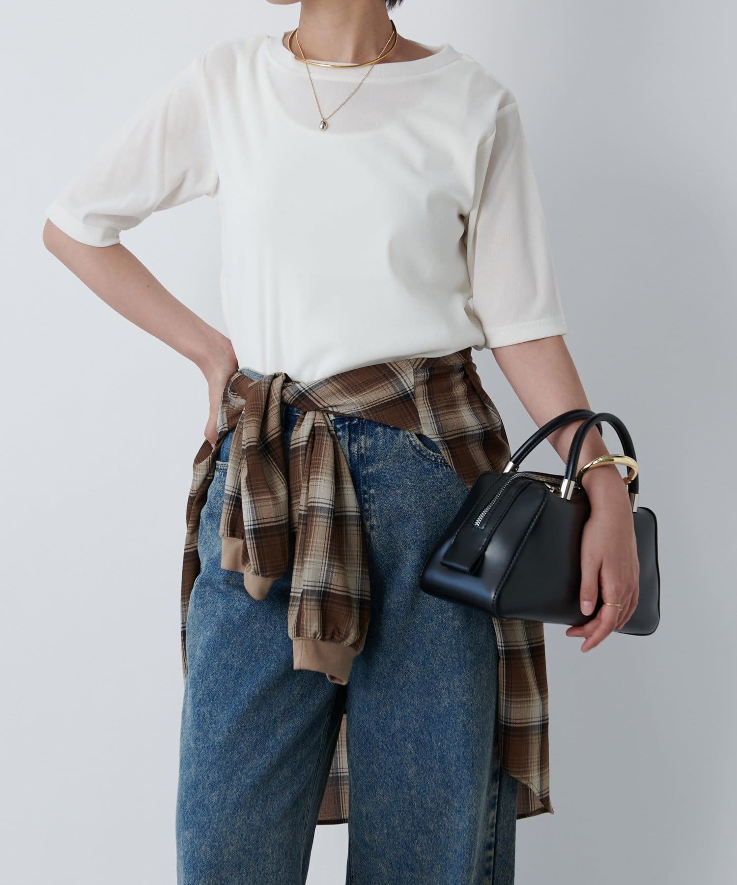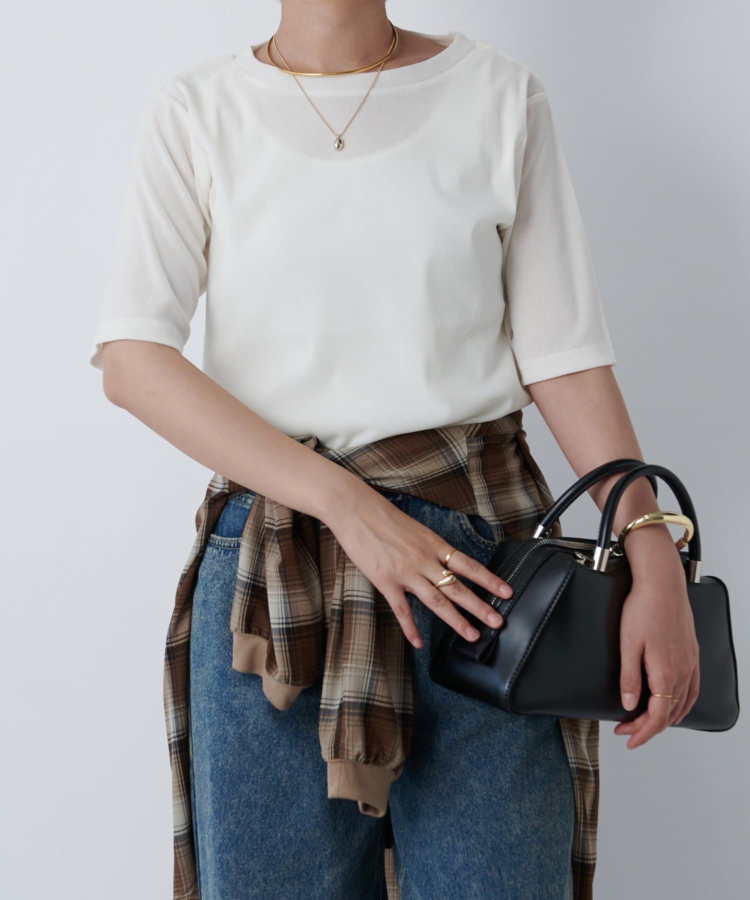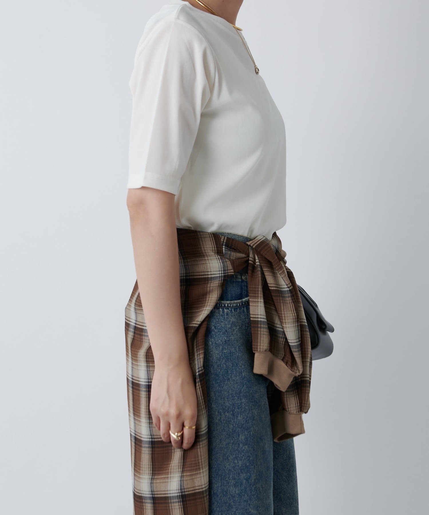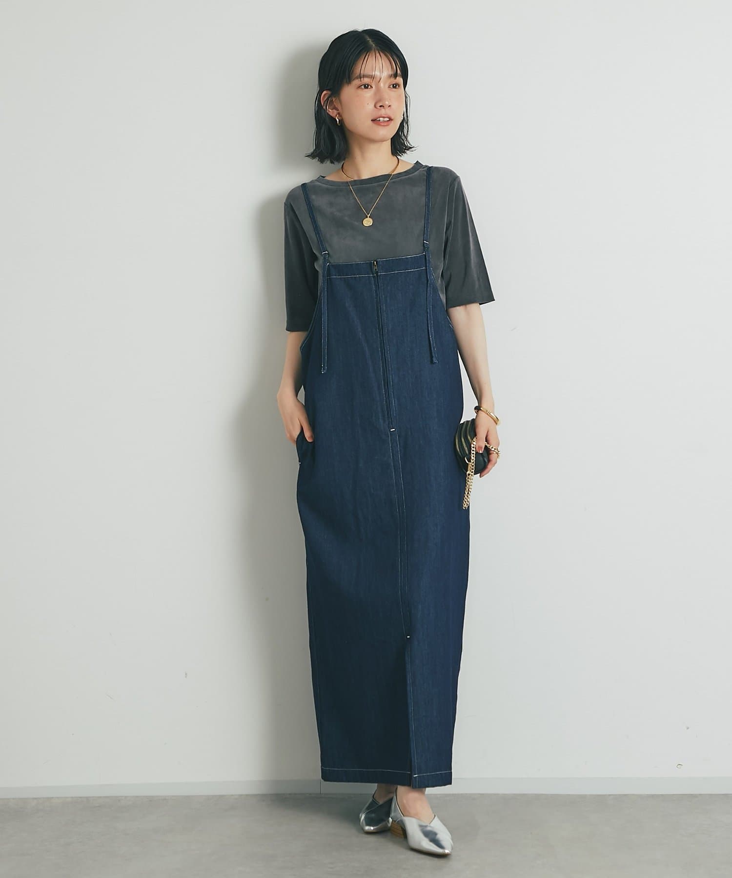 一枚で着るときは長めのネックレスを付けるとスタイルアップして着られます!
