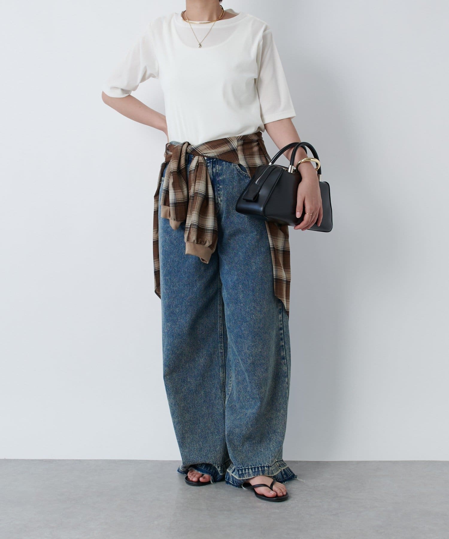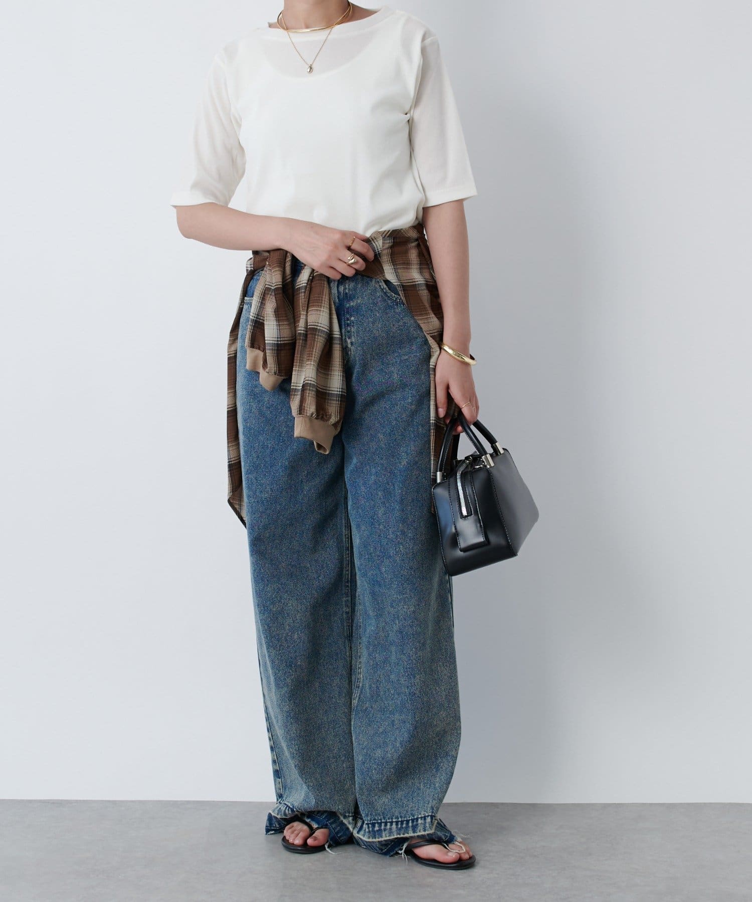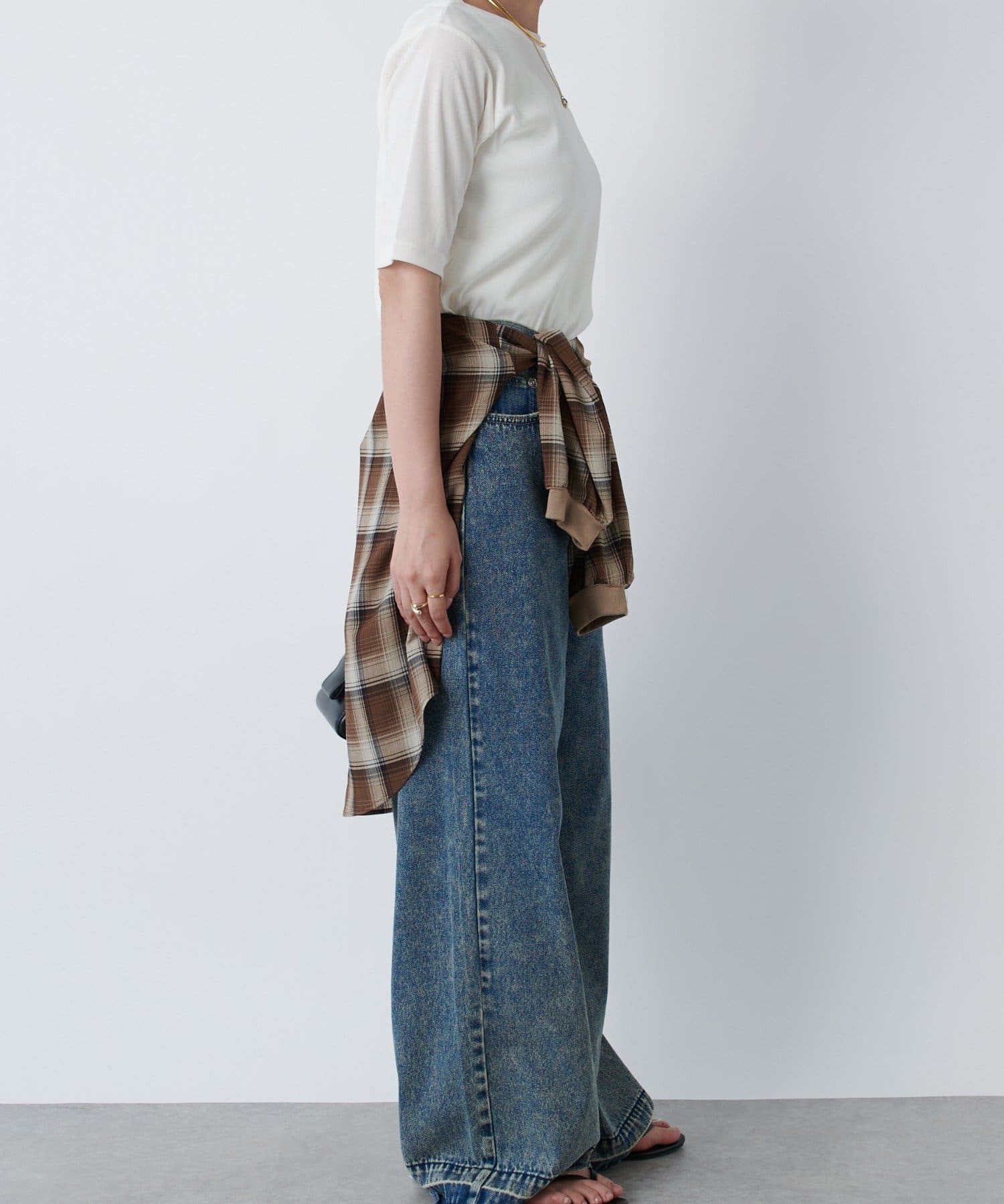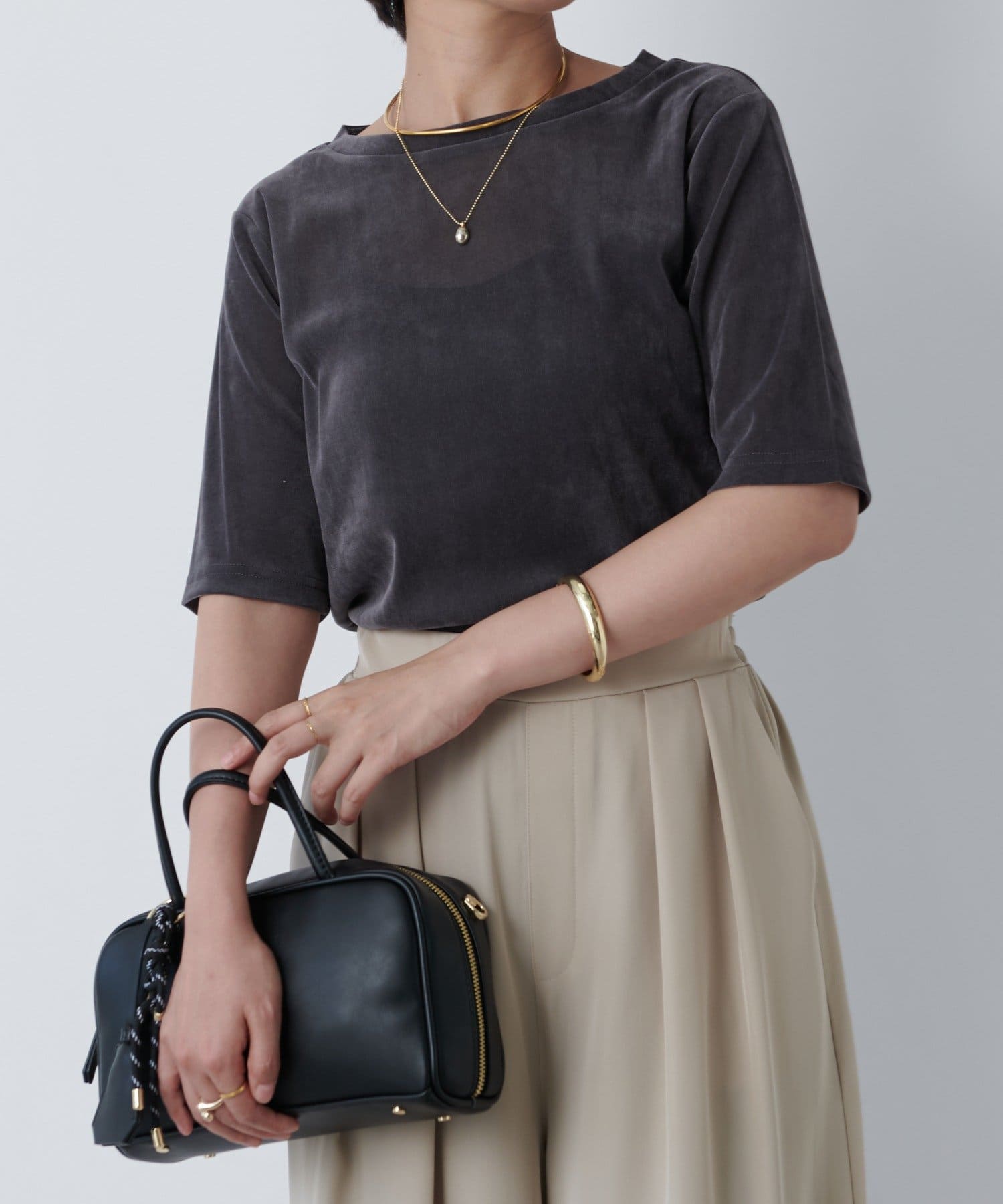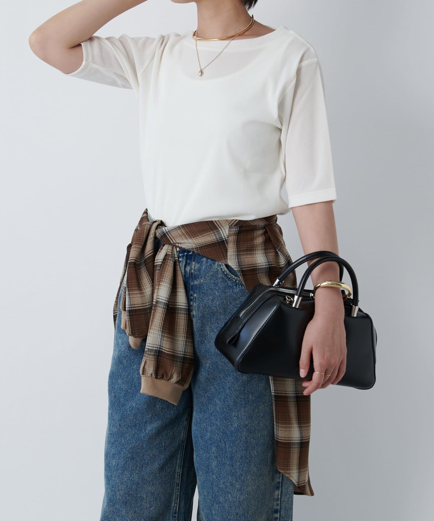 一枚で着るときは長めのネックレスを付けるとスタイルアップして着られます!