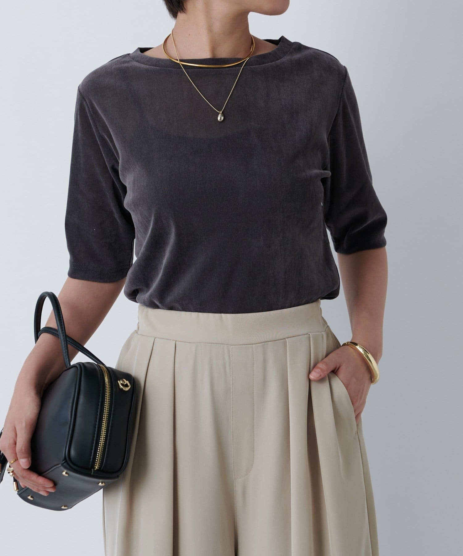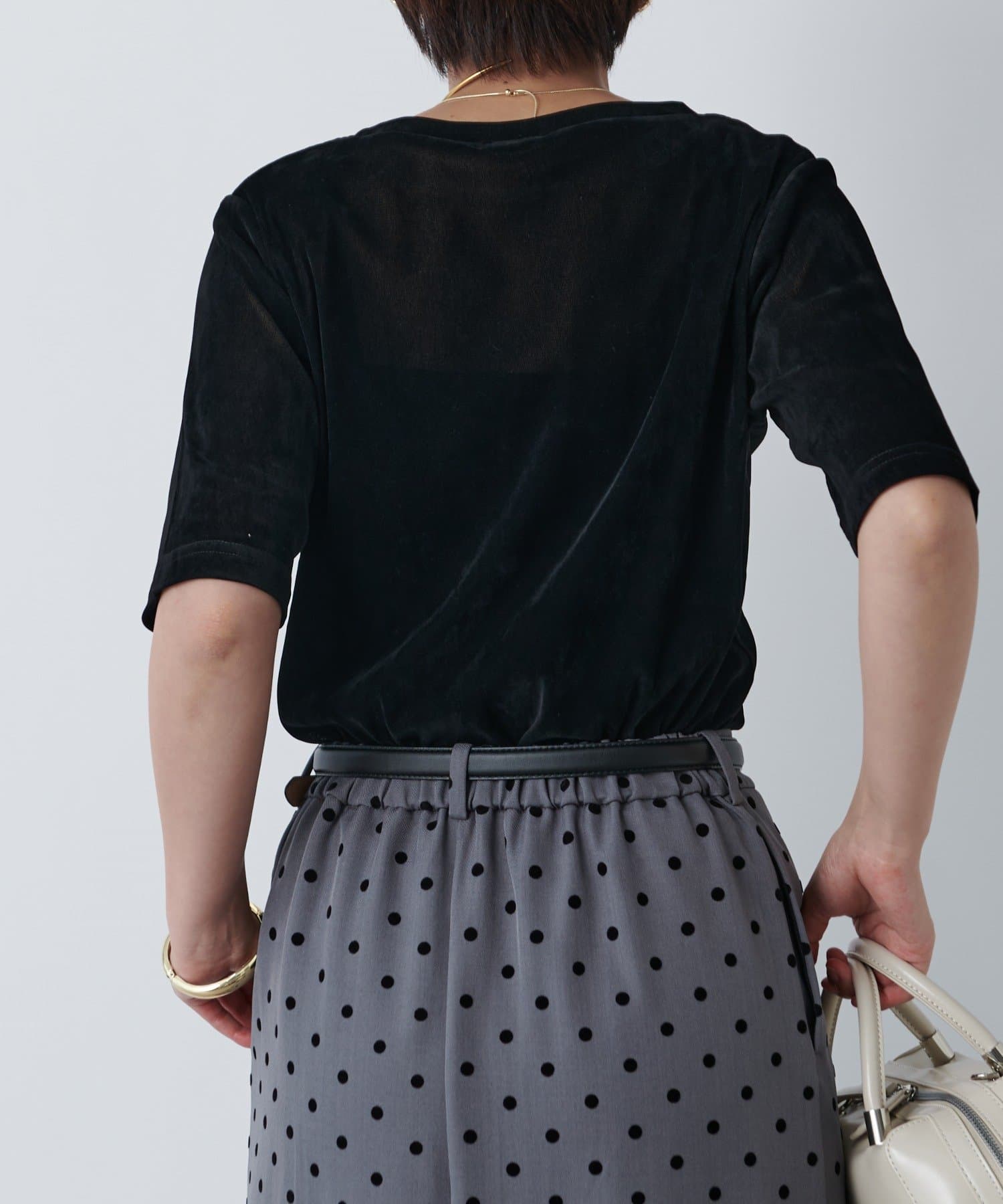 《さりげない透け感・着回し万能》シアーベロア5分袖プルオーバー