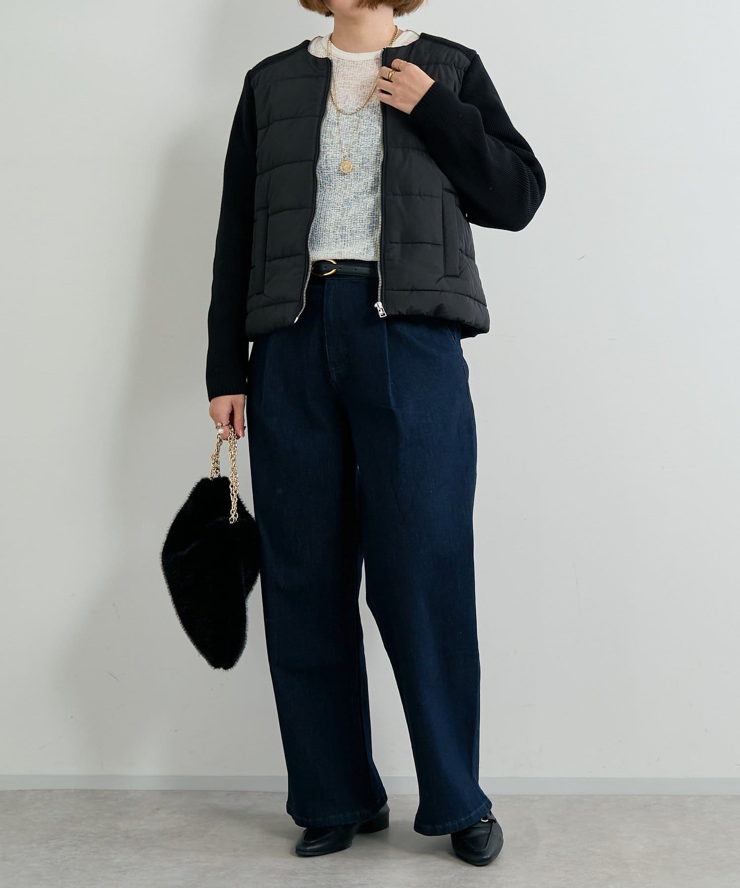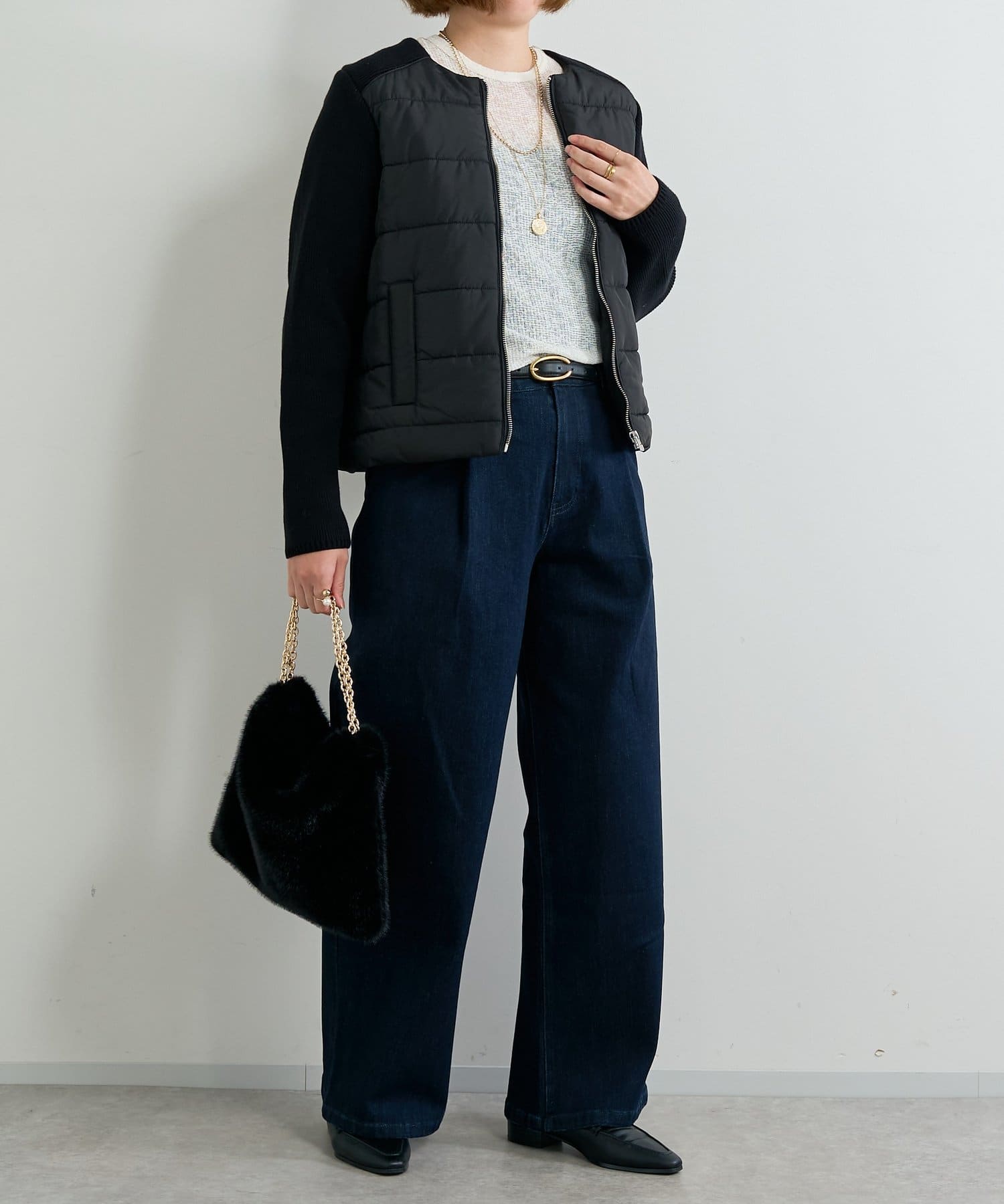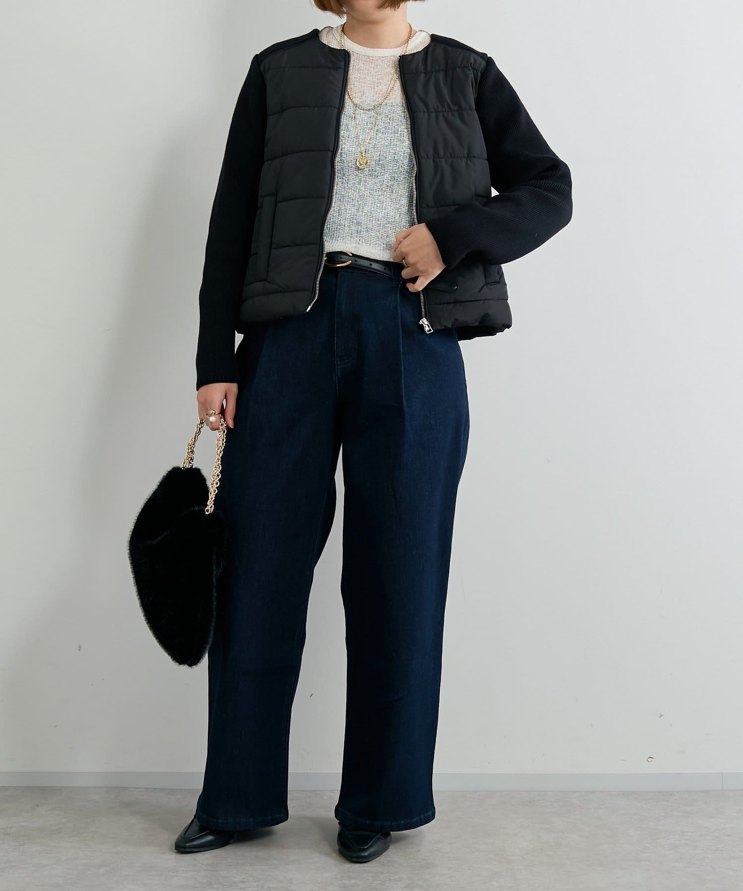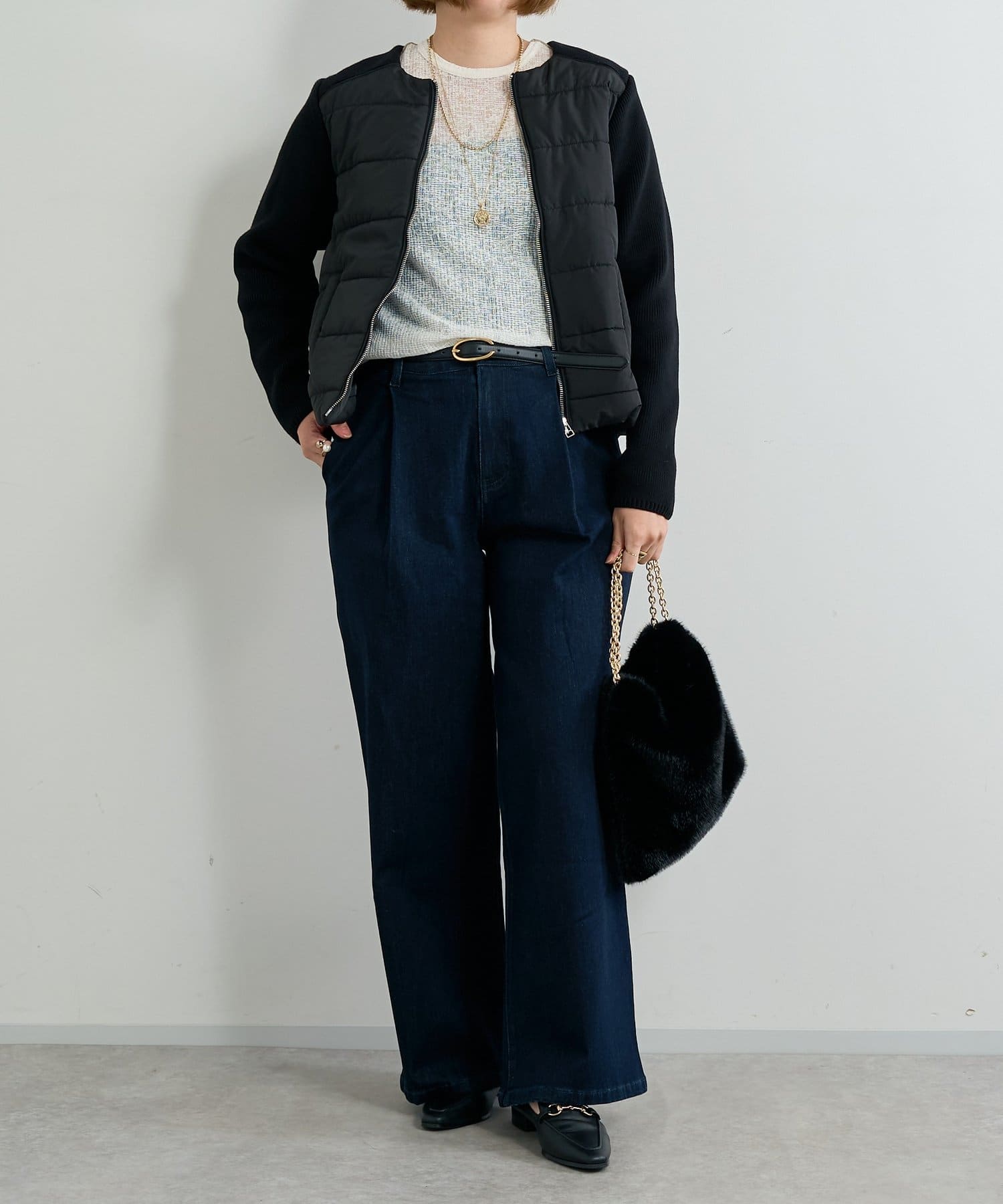 あえて色のトーンが異なるインナーを合わせることで、個性が光るスタイリングに。
