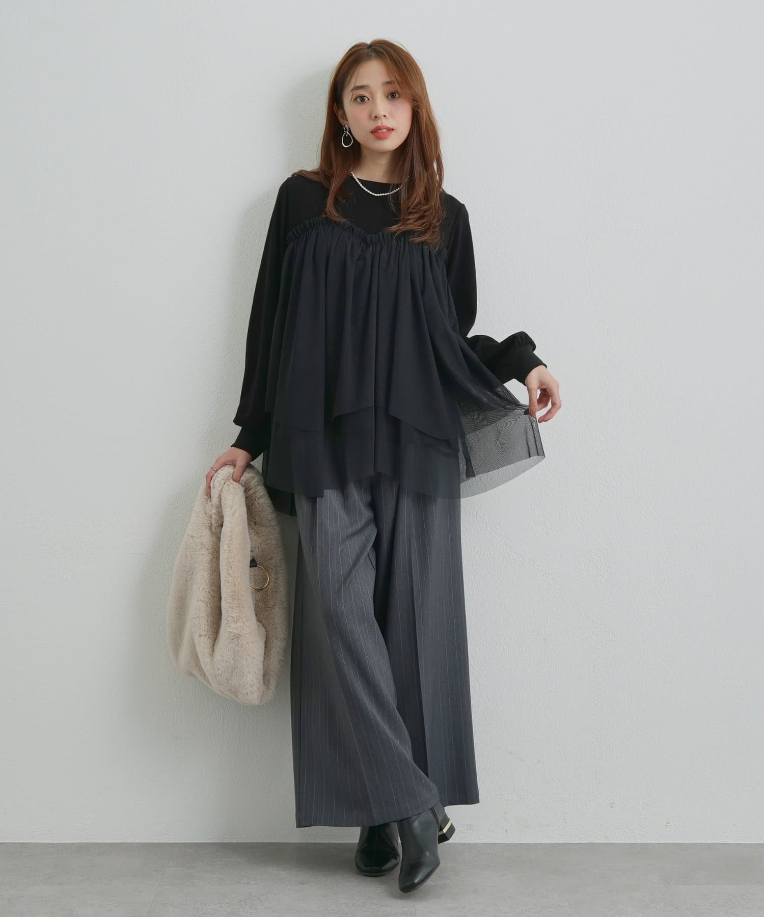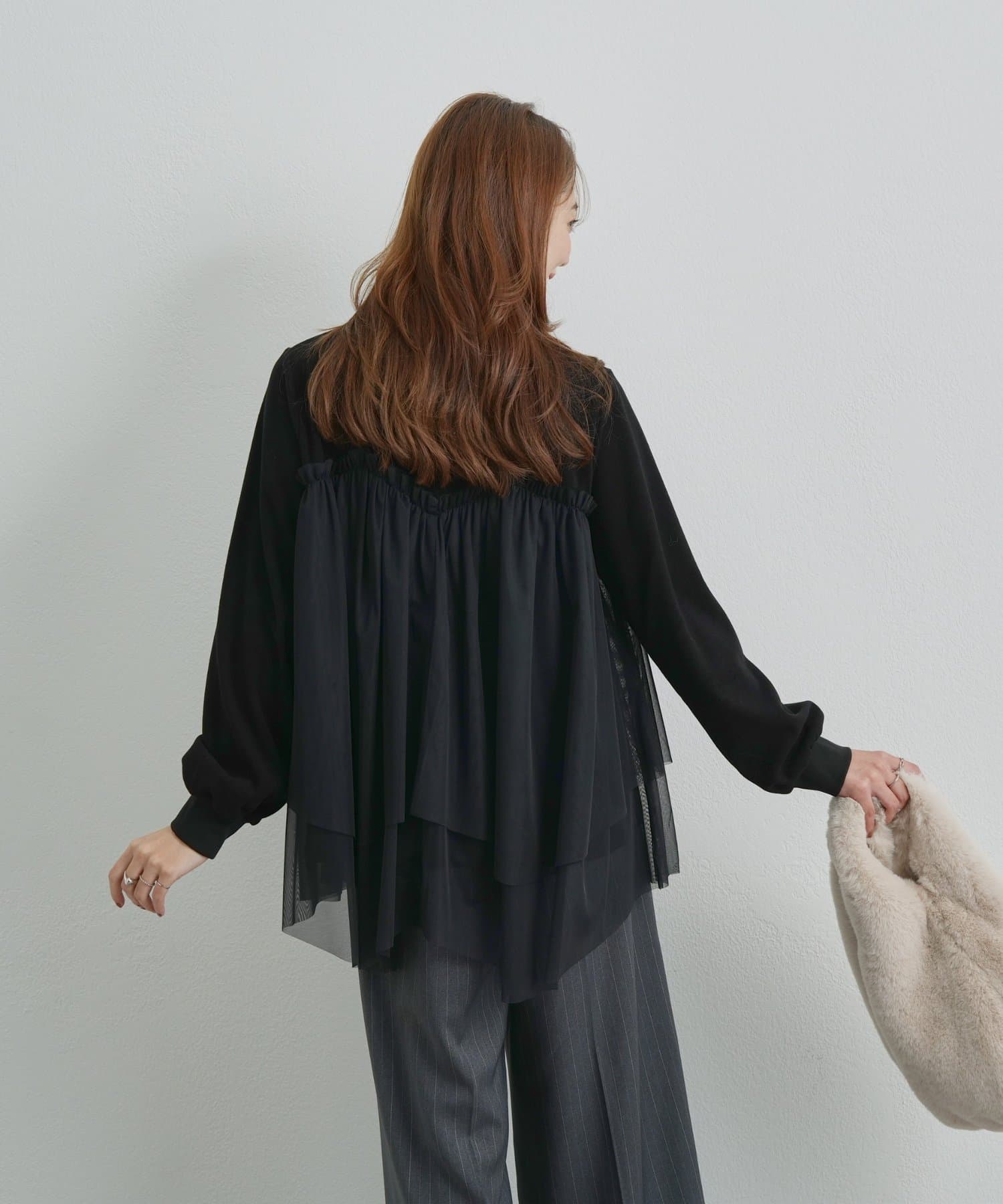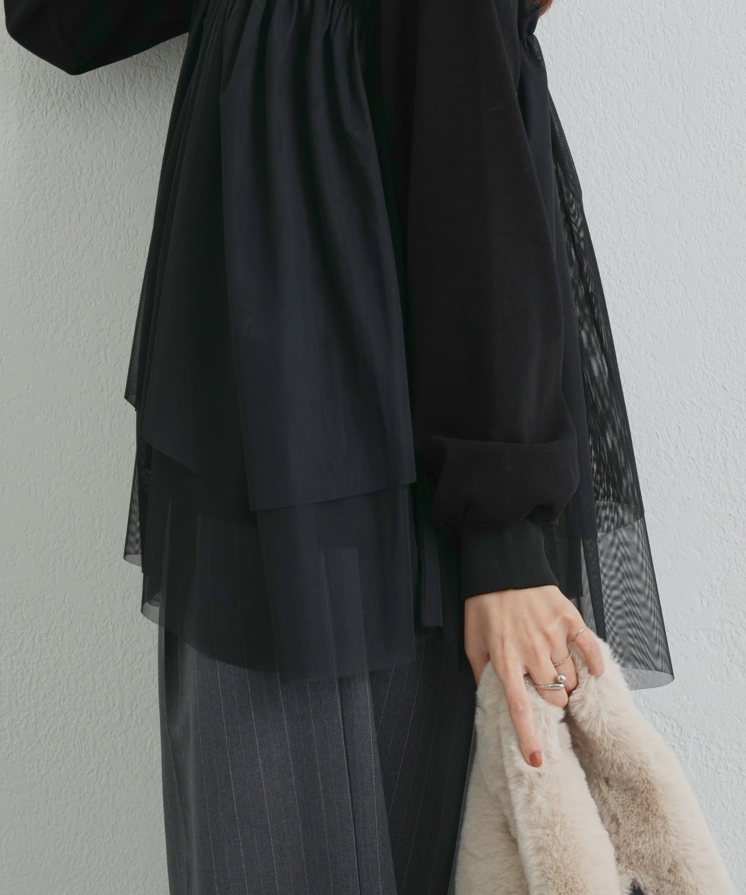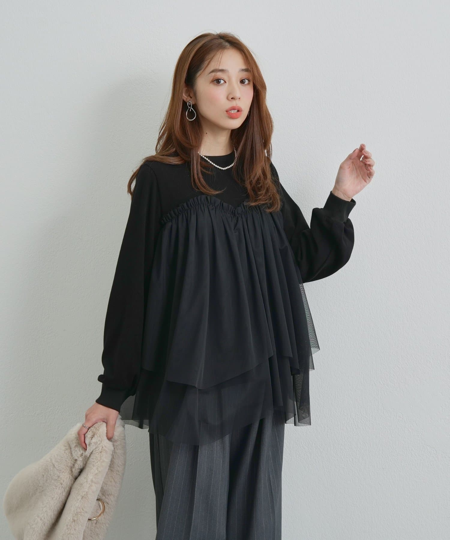 ・身頃にあしらわれたボリューミーなチュールが目を惹く、大人可愛いムードを盛り上げるプルオーバー。