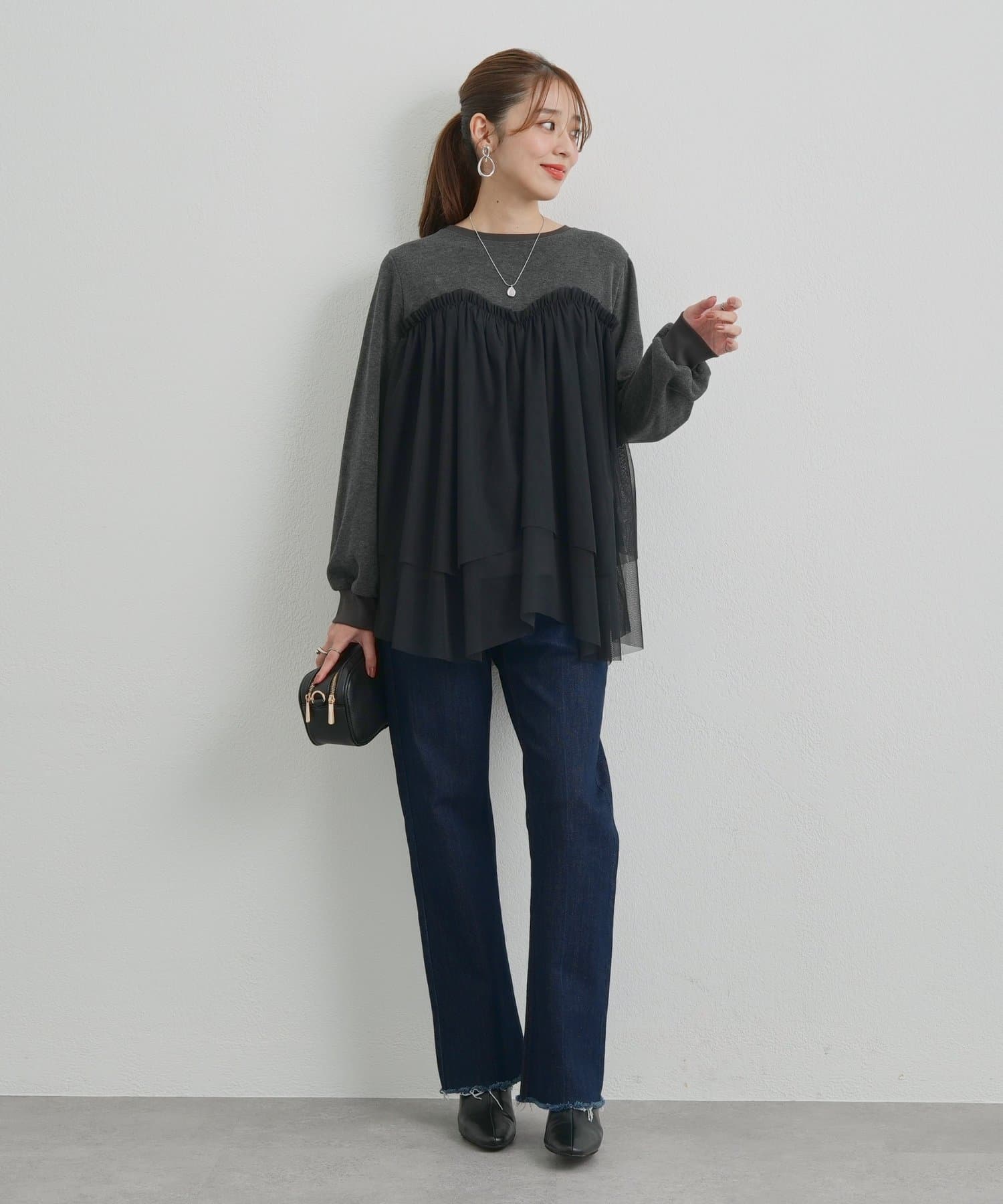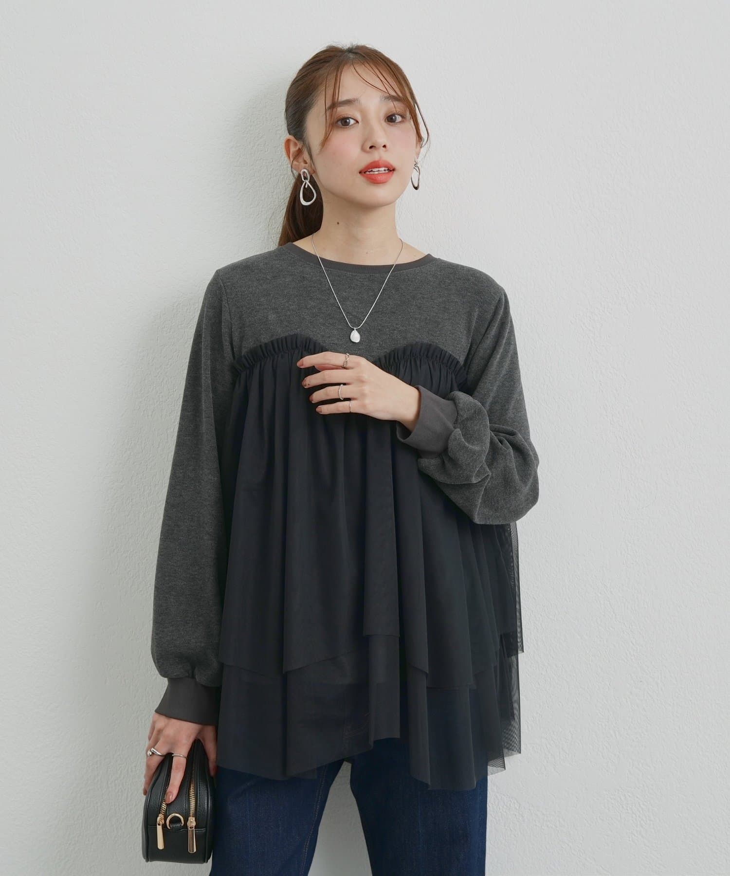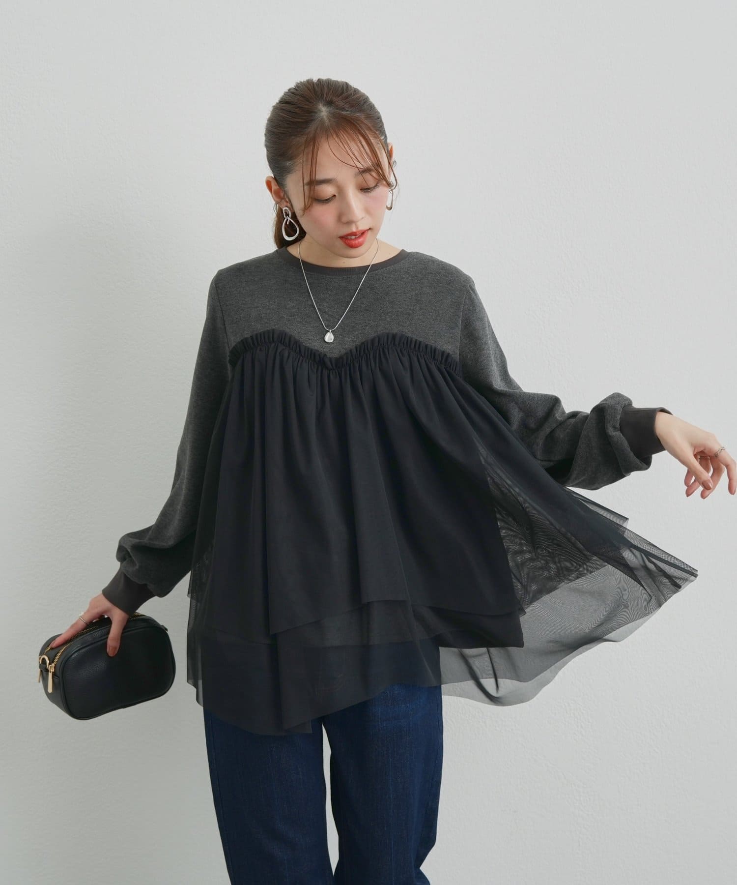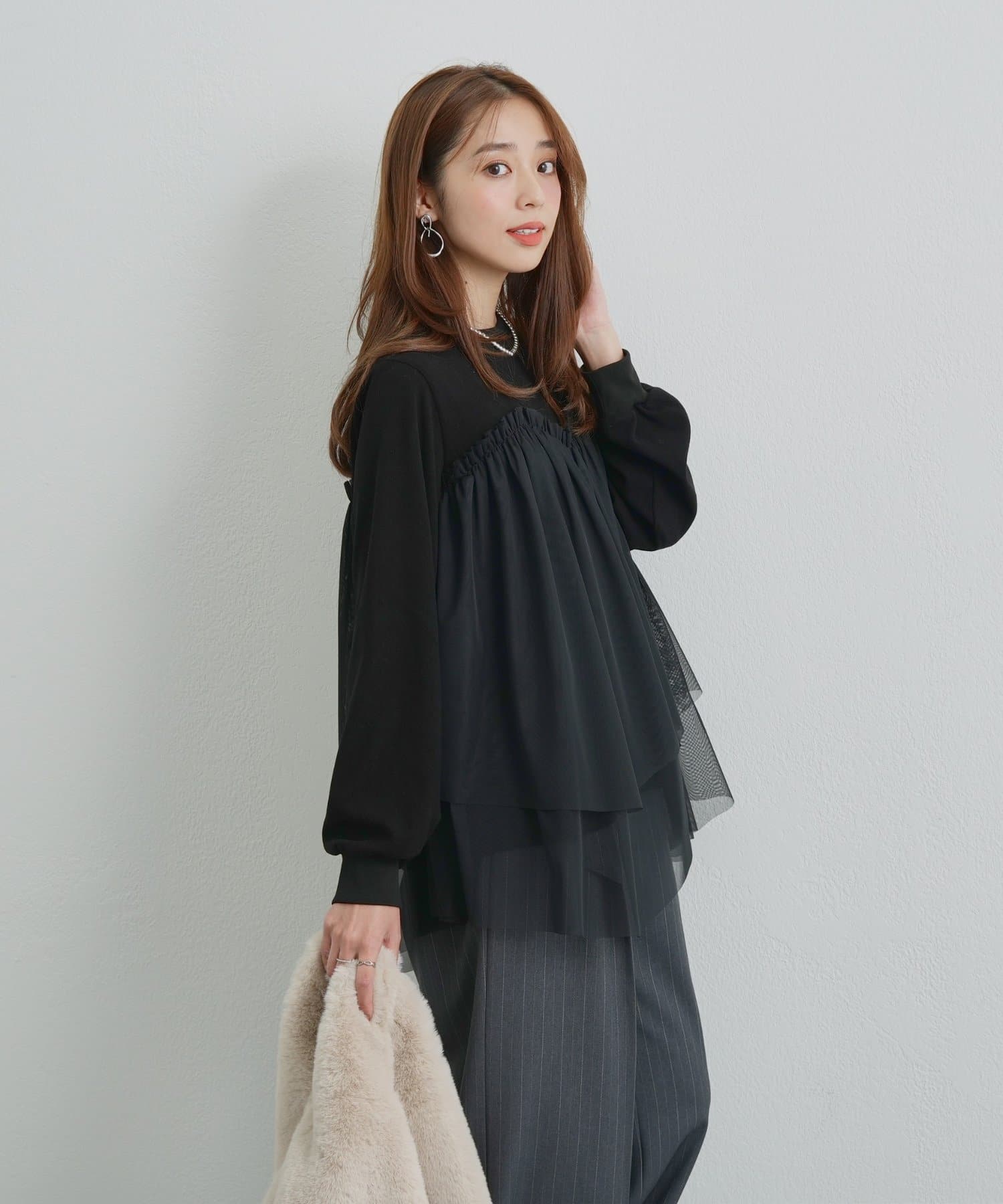 ・身頃にあしらわれたボリューミーなチュールが目を惹く、大人可愛いムードを盛り上げるプルオーバー。