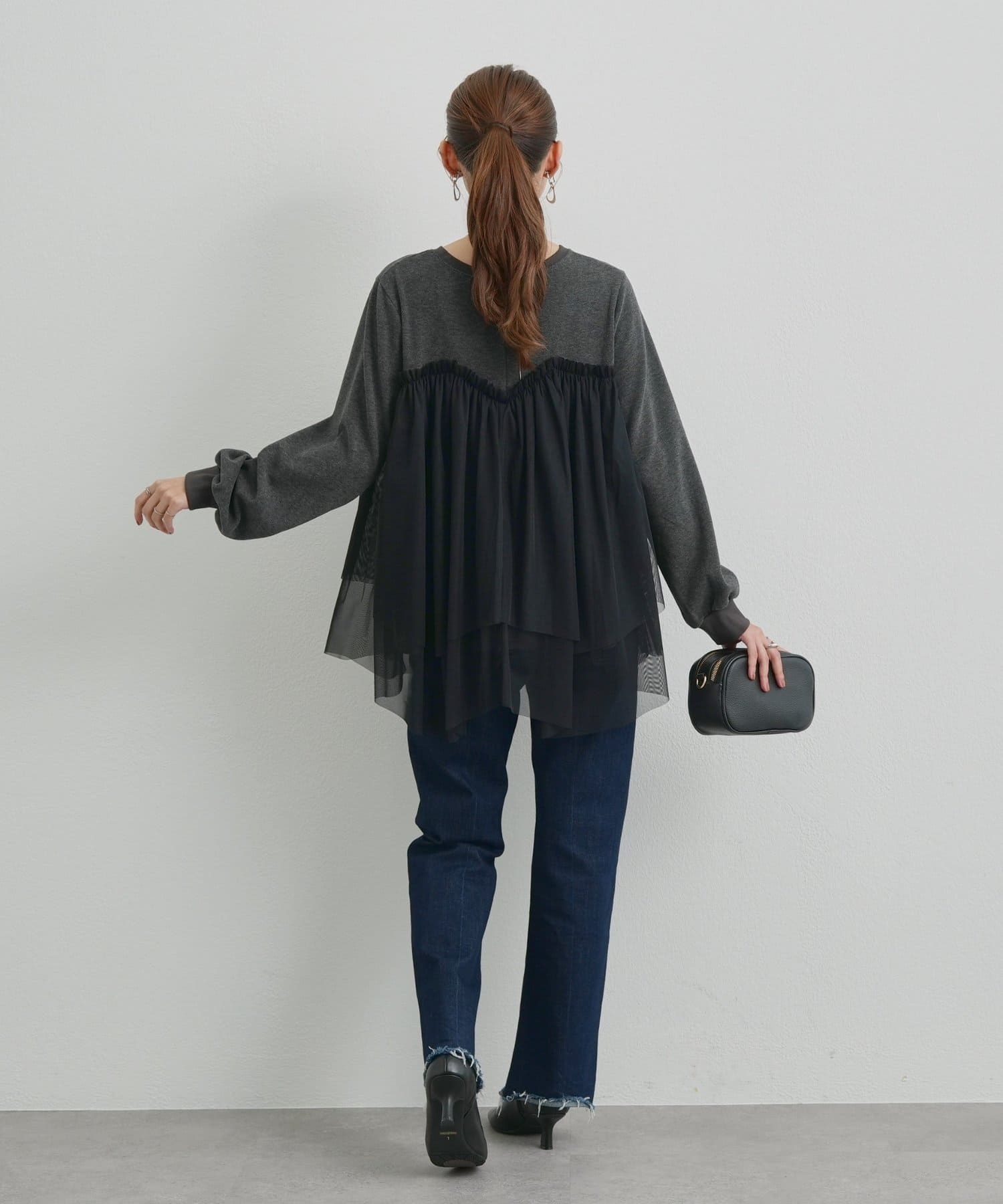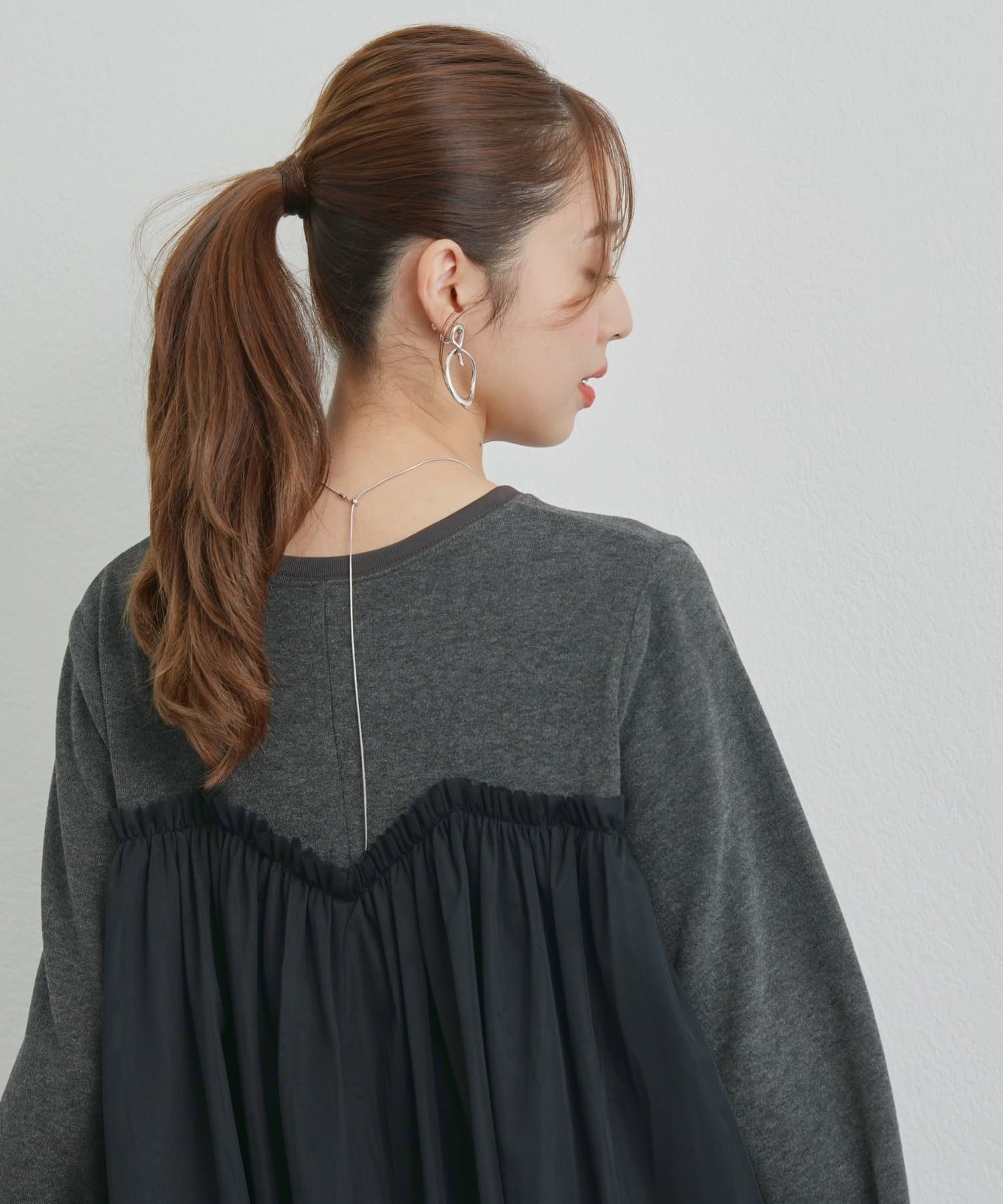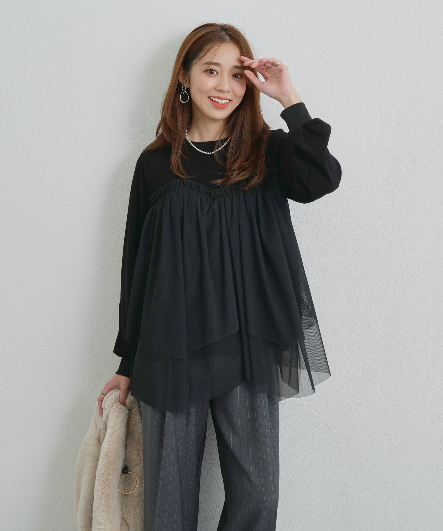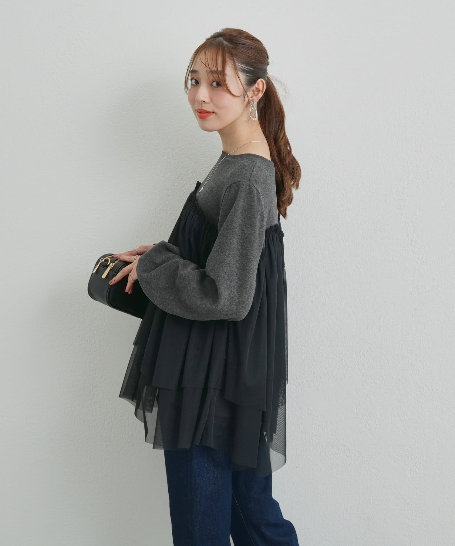 ・身頃にあしらわれたボリューミーなチュールが目を惹く、大人可愛いムードを盛り上げるプルオーバー。