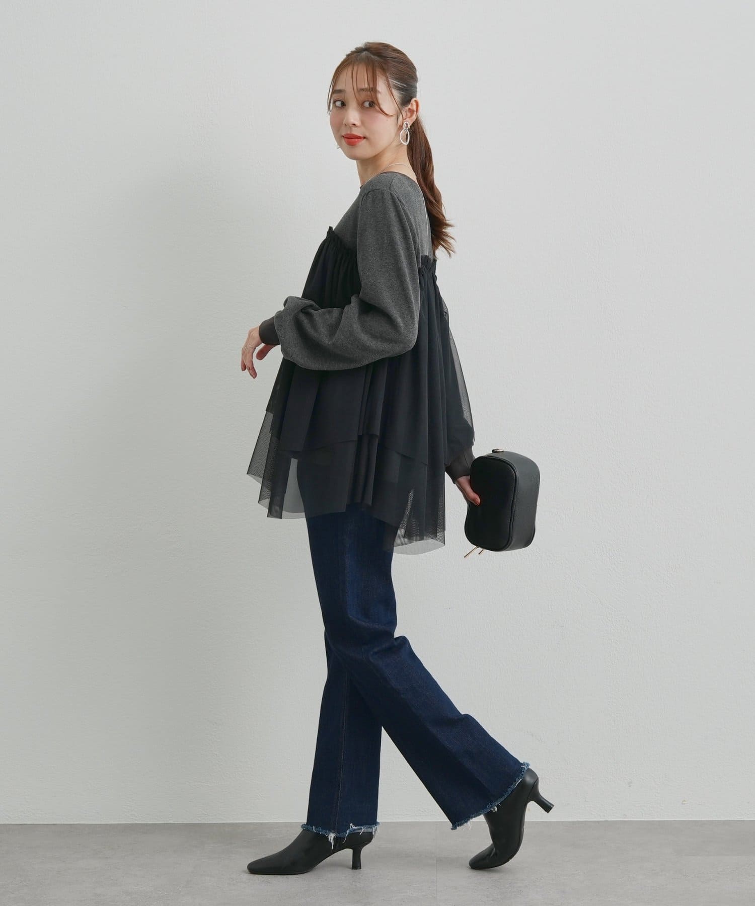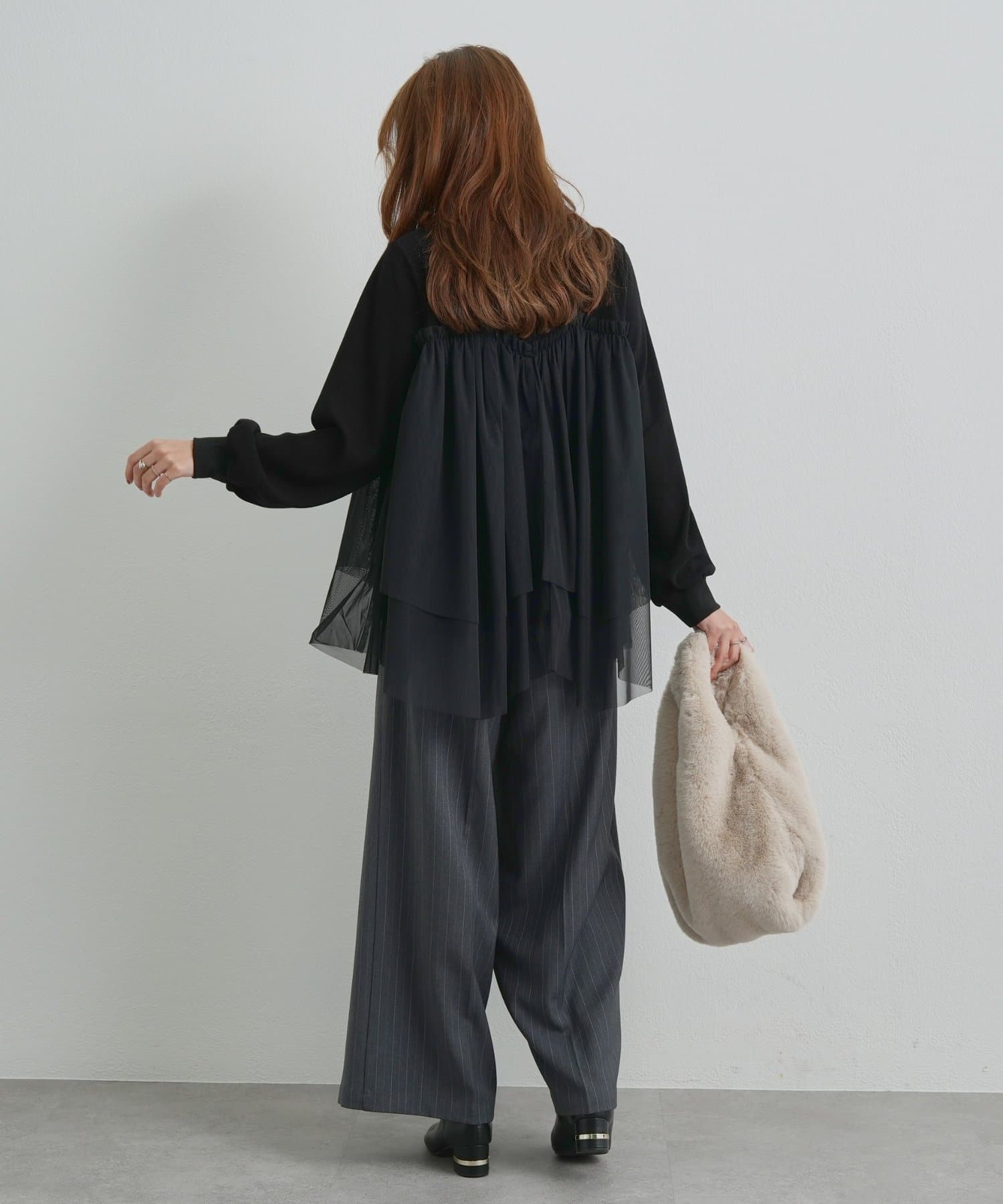 ボトムはタイトめのものを合わせると、トップスのふんわりとしたシルエットがより活きます。