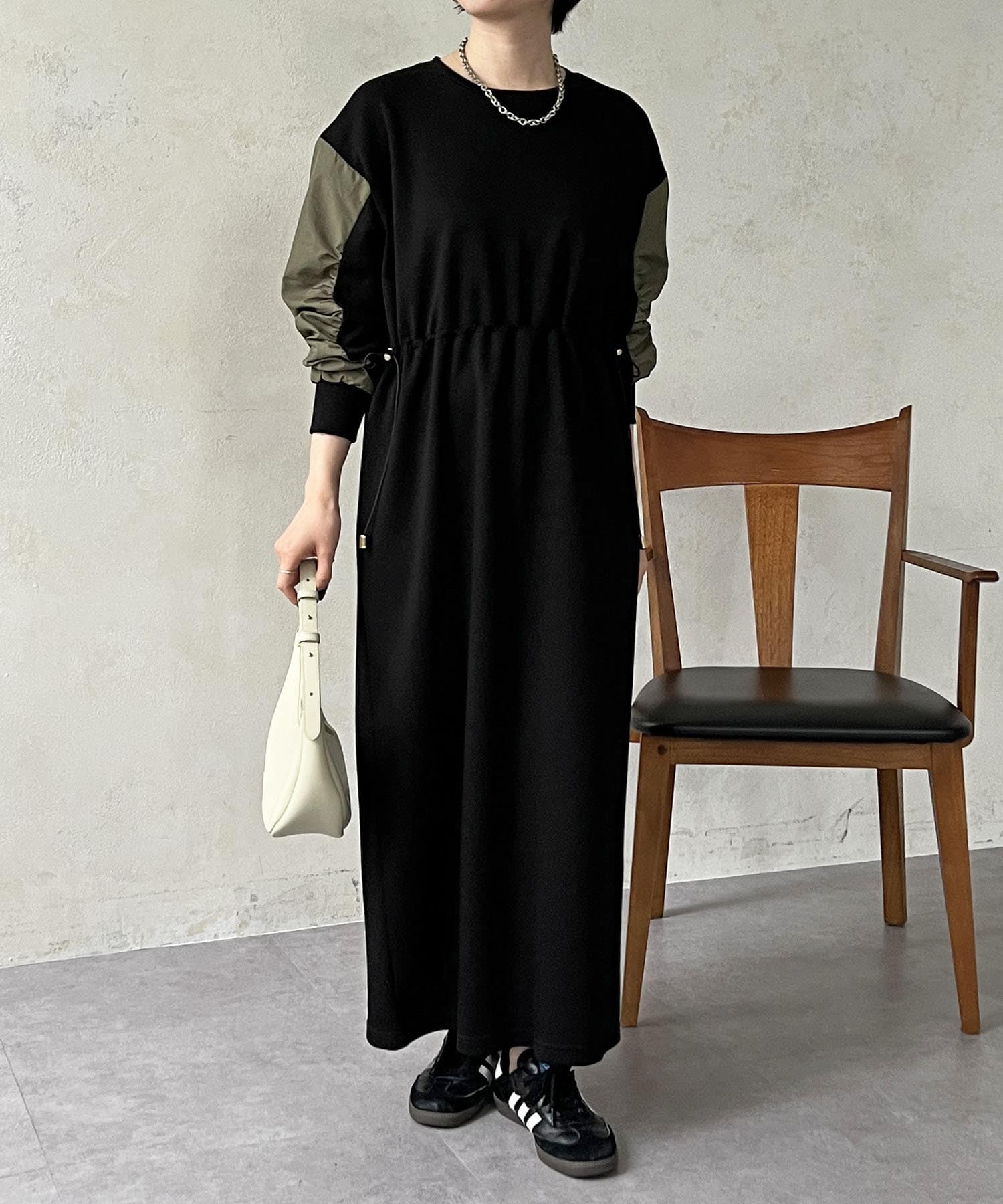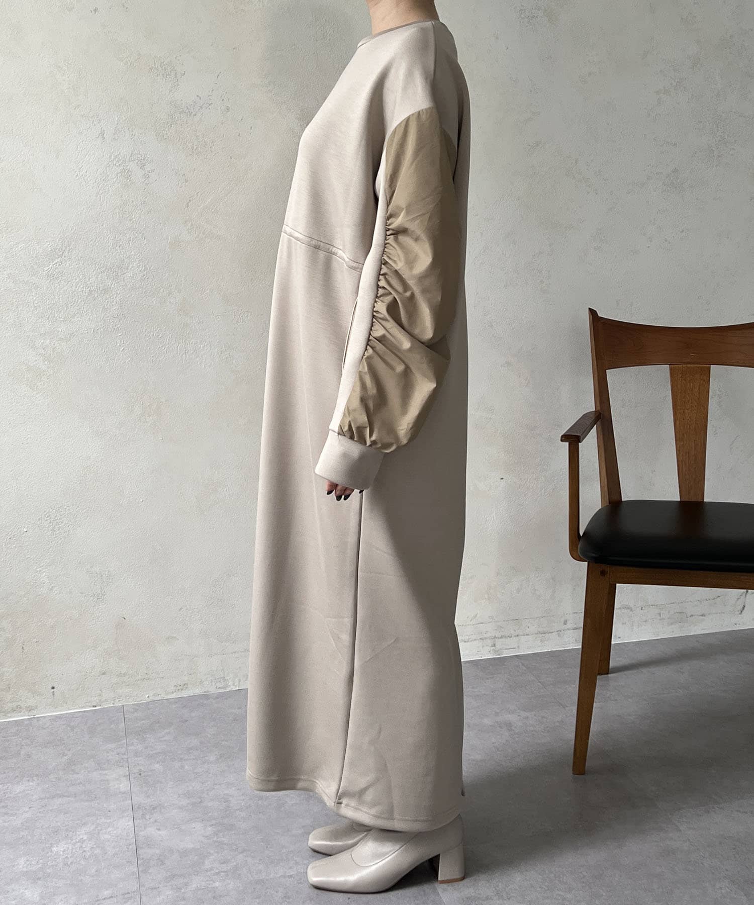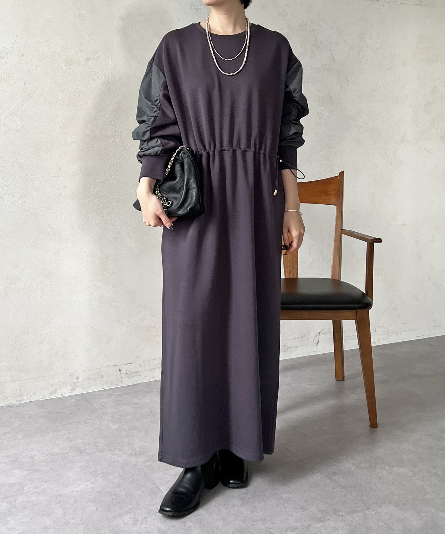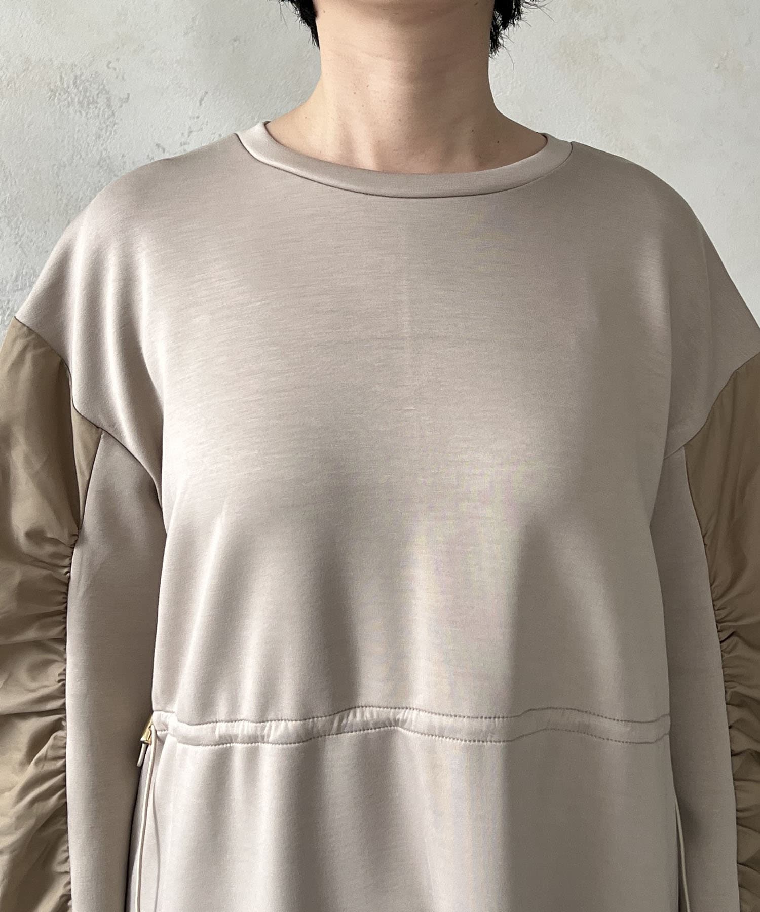 ・異素材ドッキングの袖はギャザー仕様で立体的に◎