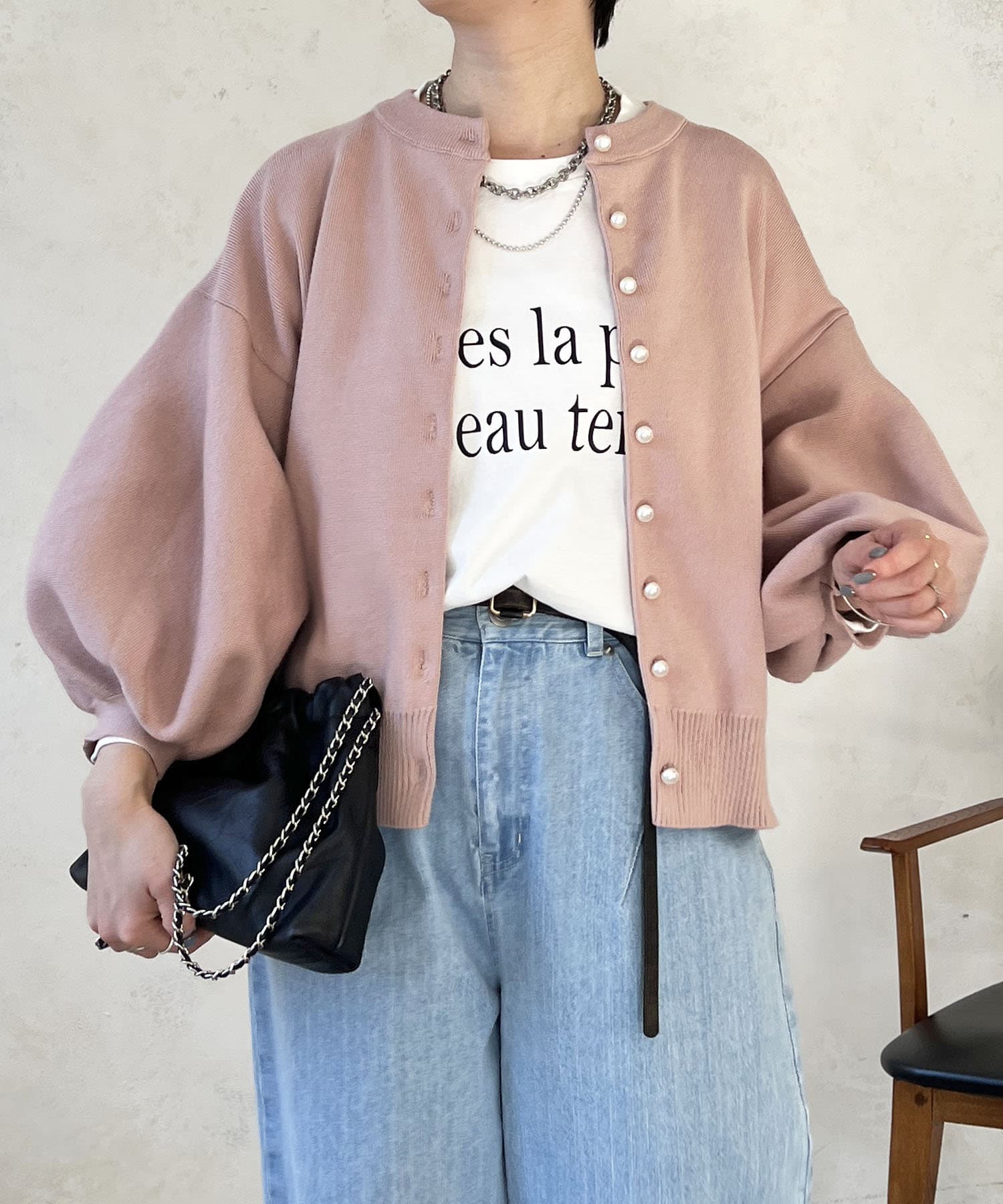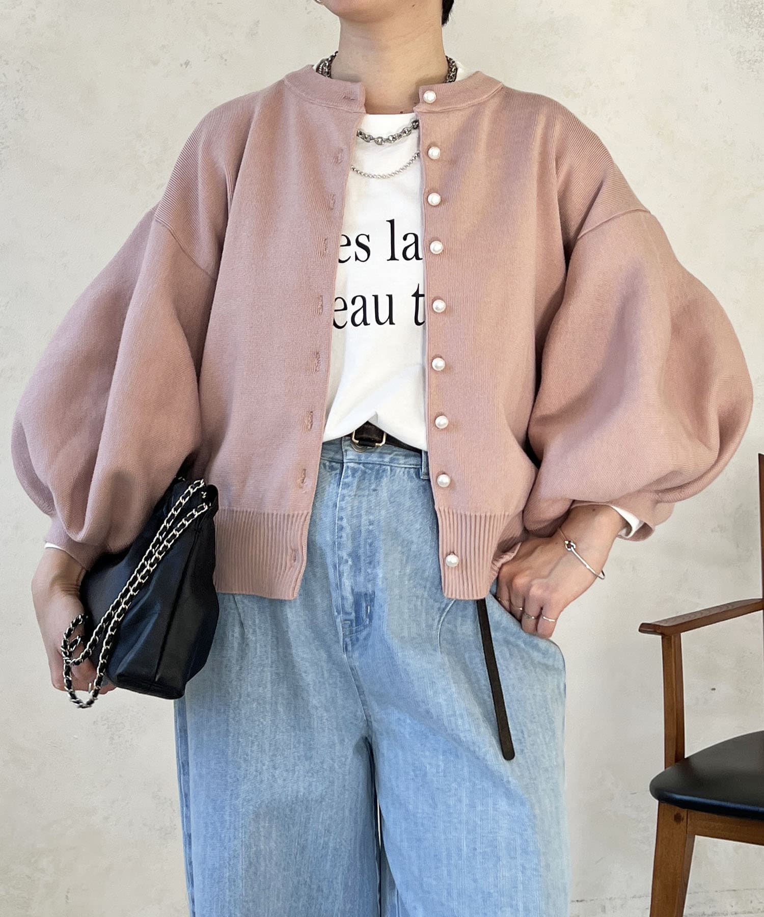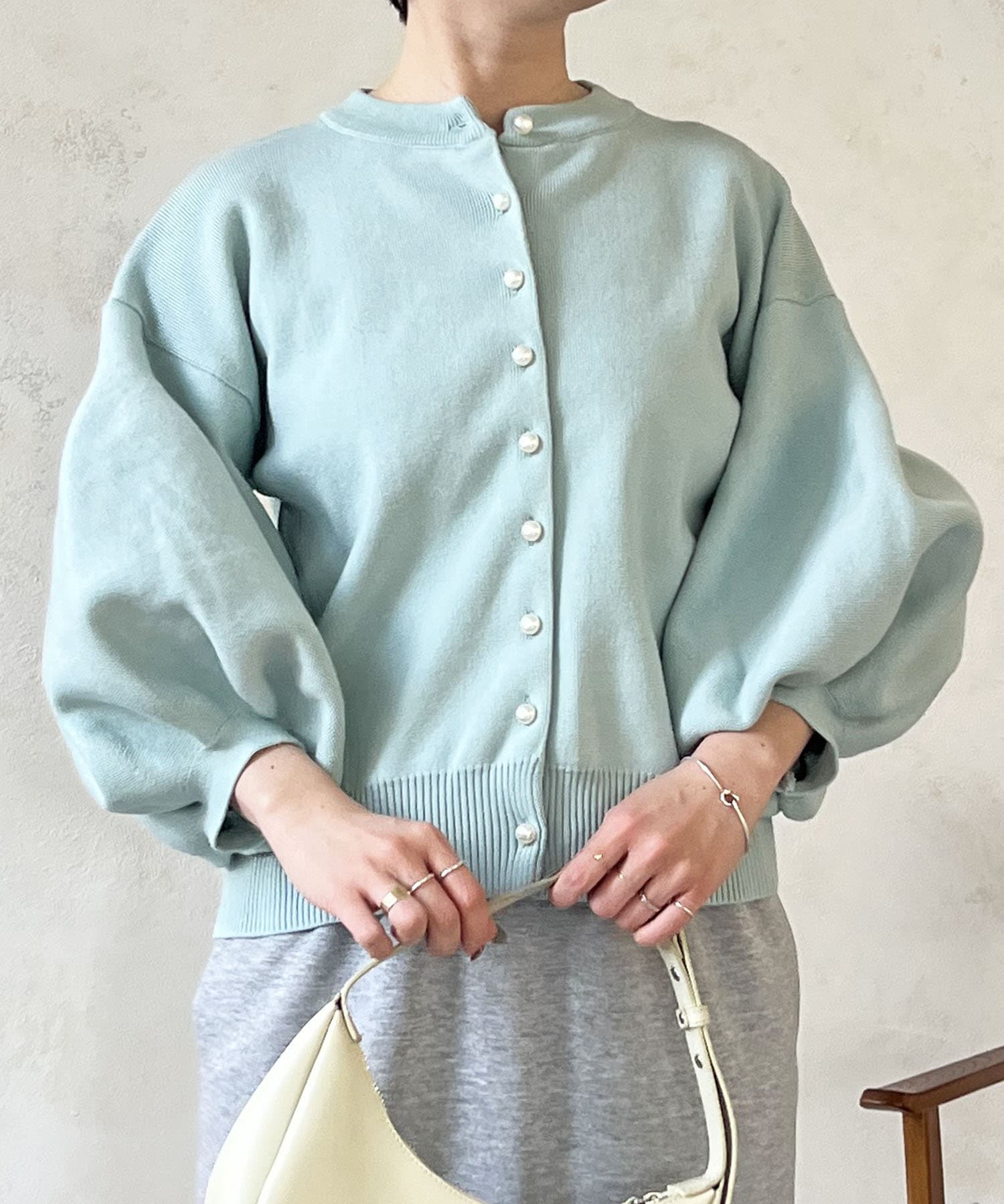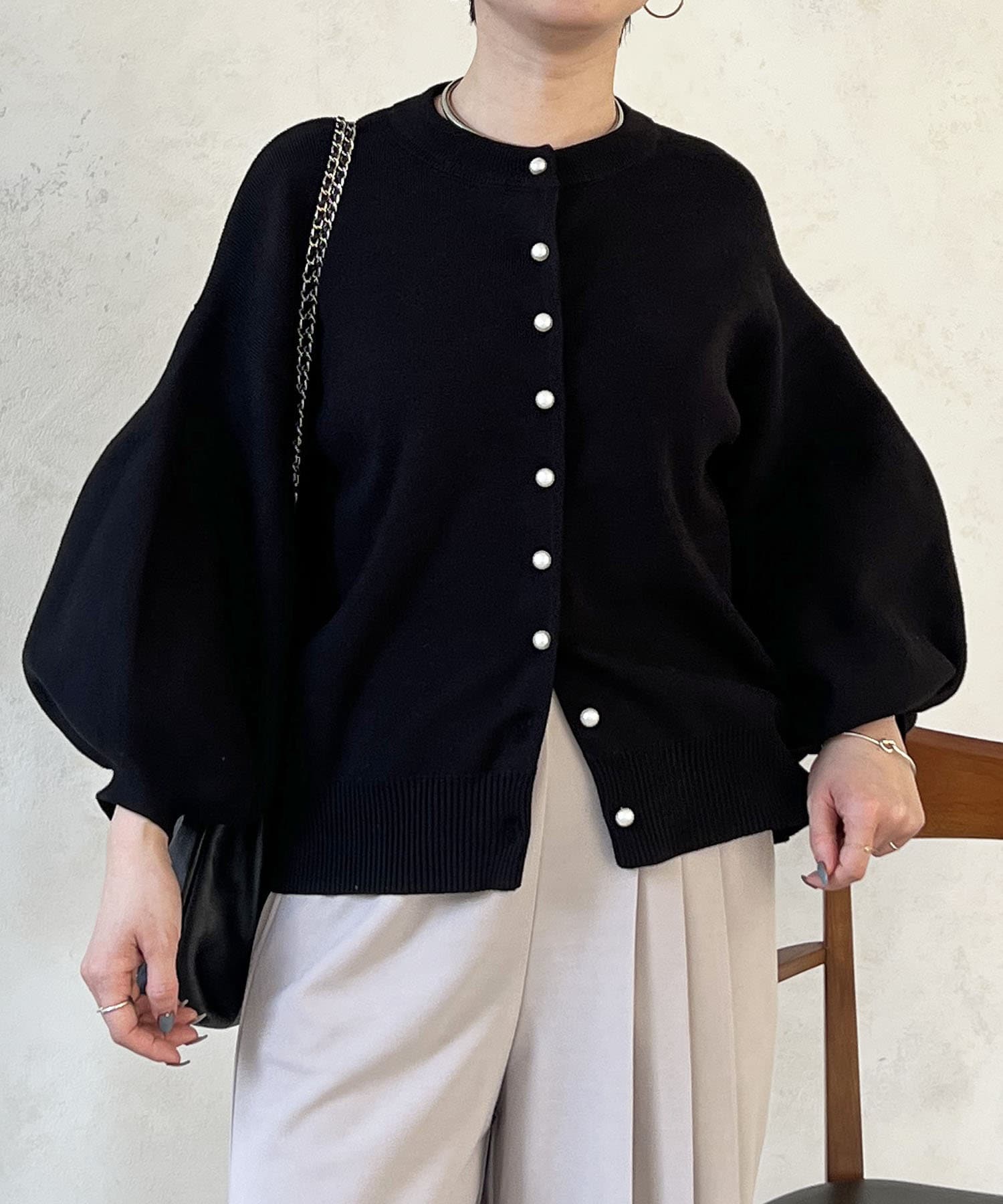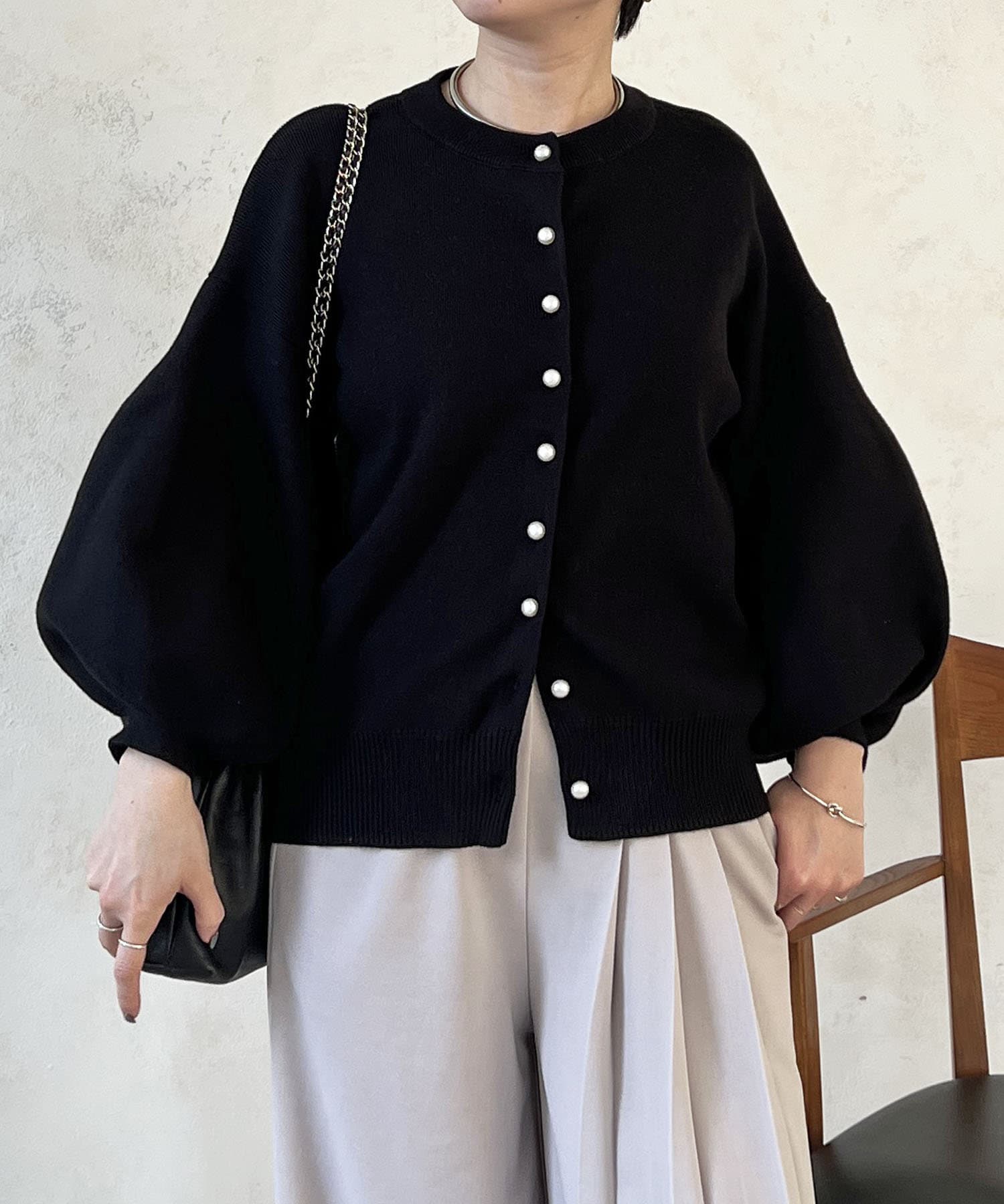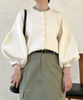 パールボタンやバルーンスリーブで華やかな印象に