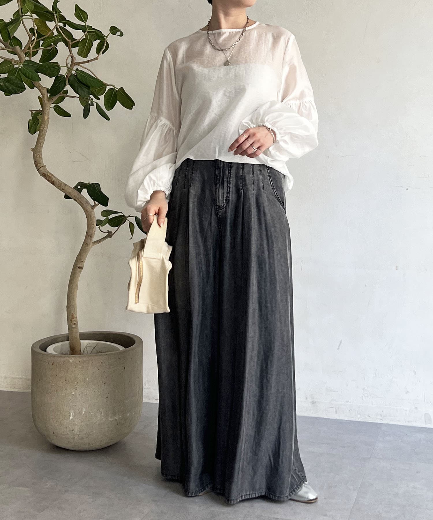・丸みのあるボリュームスリーブがコーディネートのポイントに