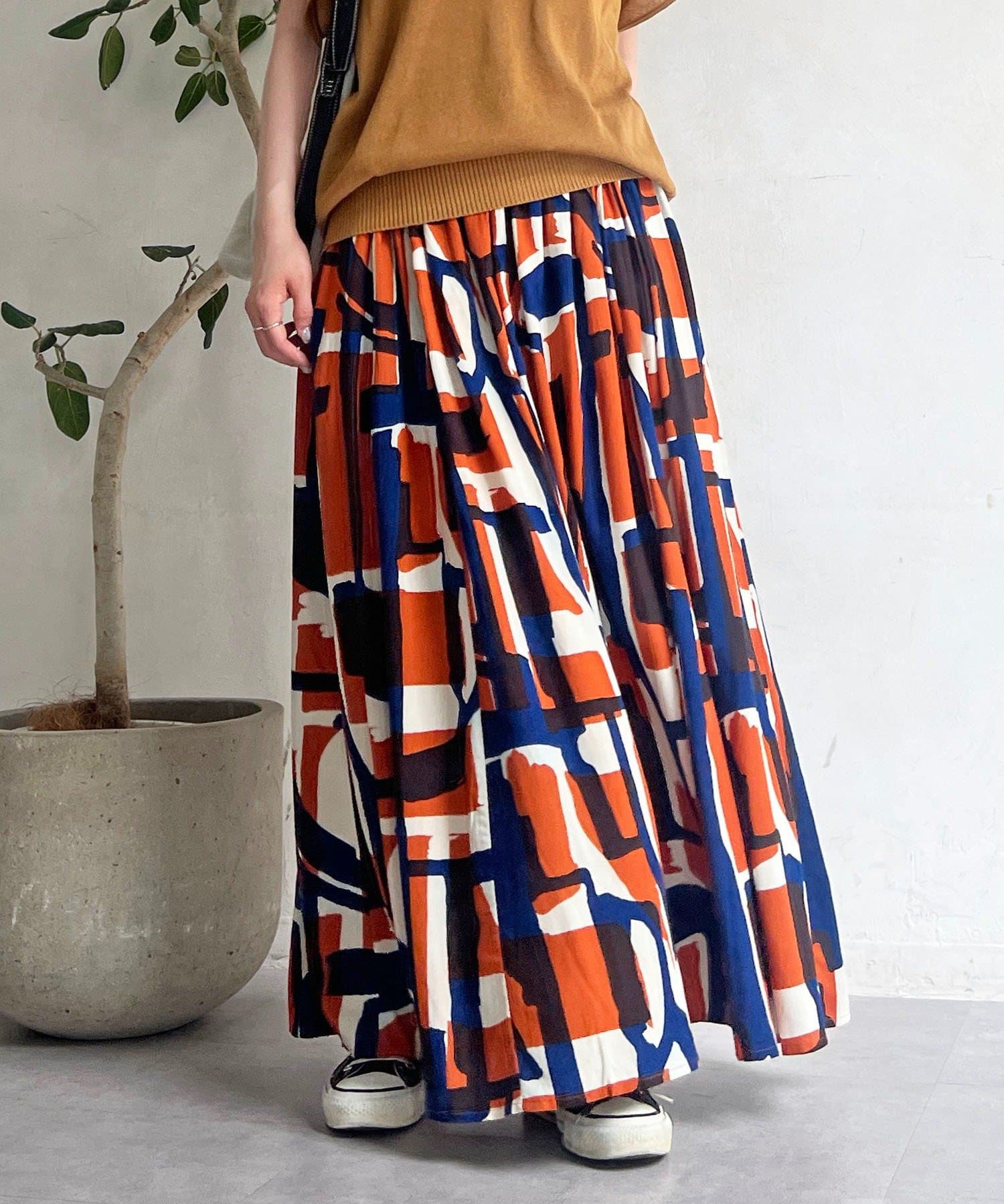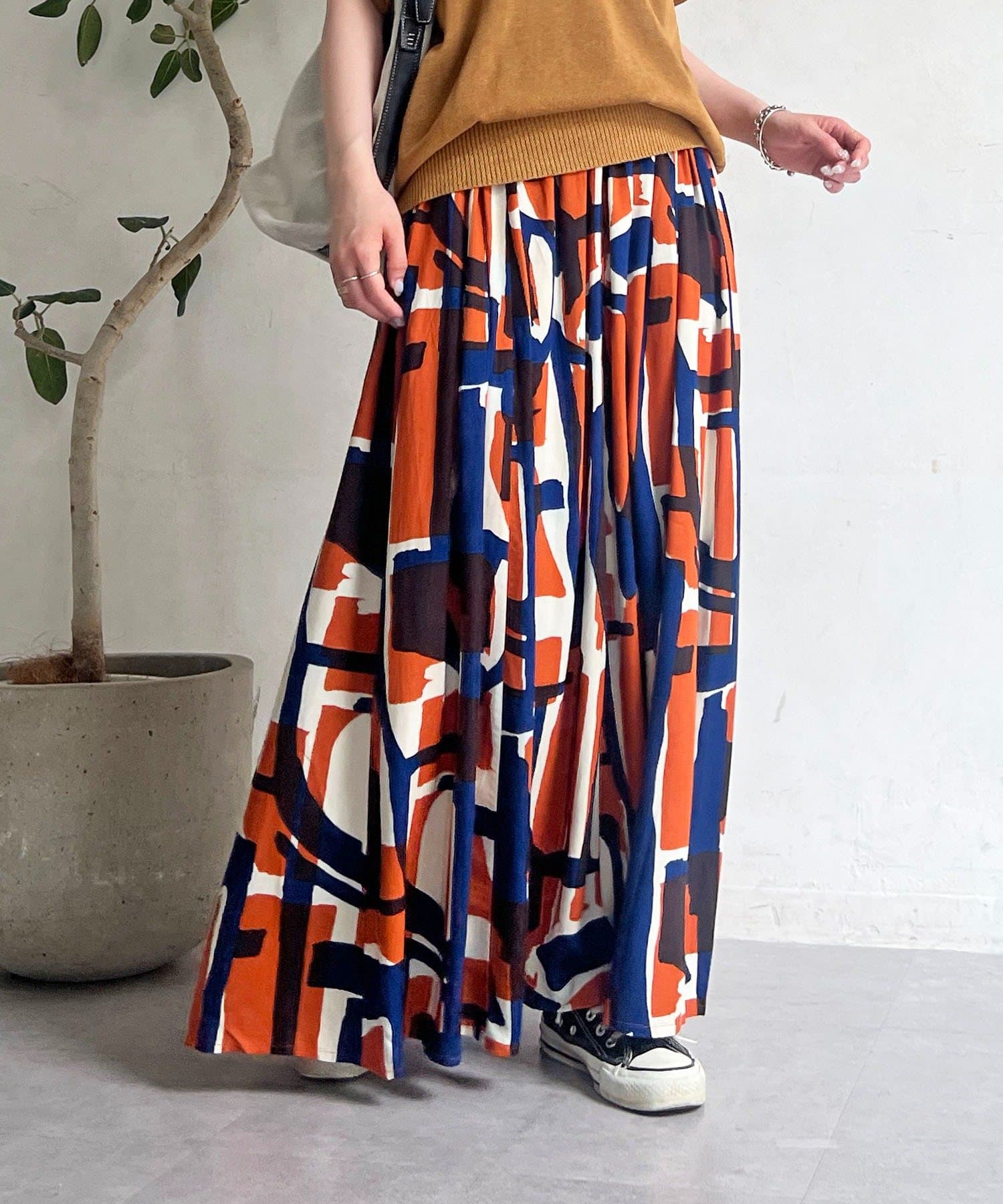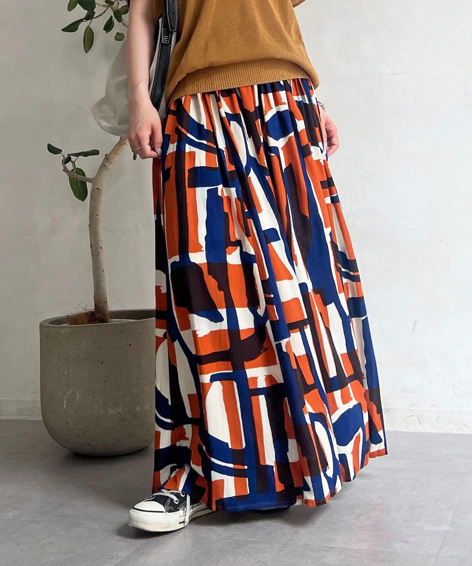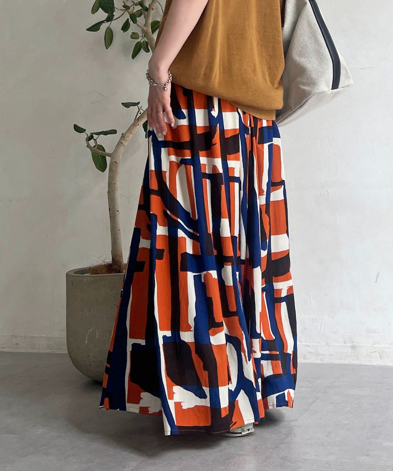 コーディネートの主役になるブロック柄スカート