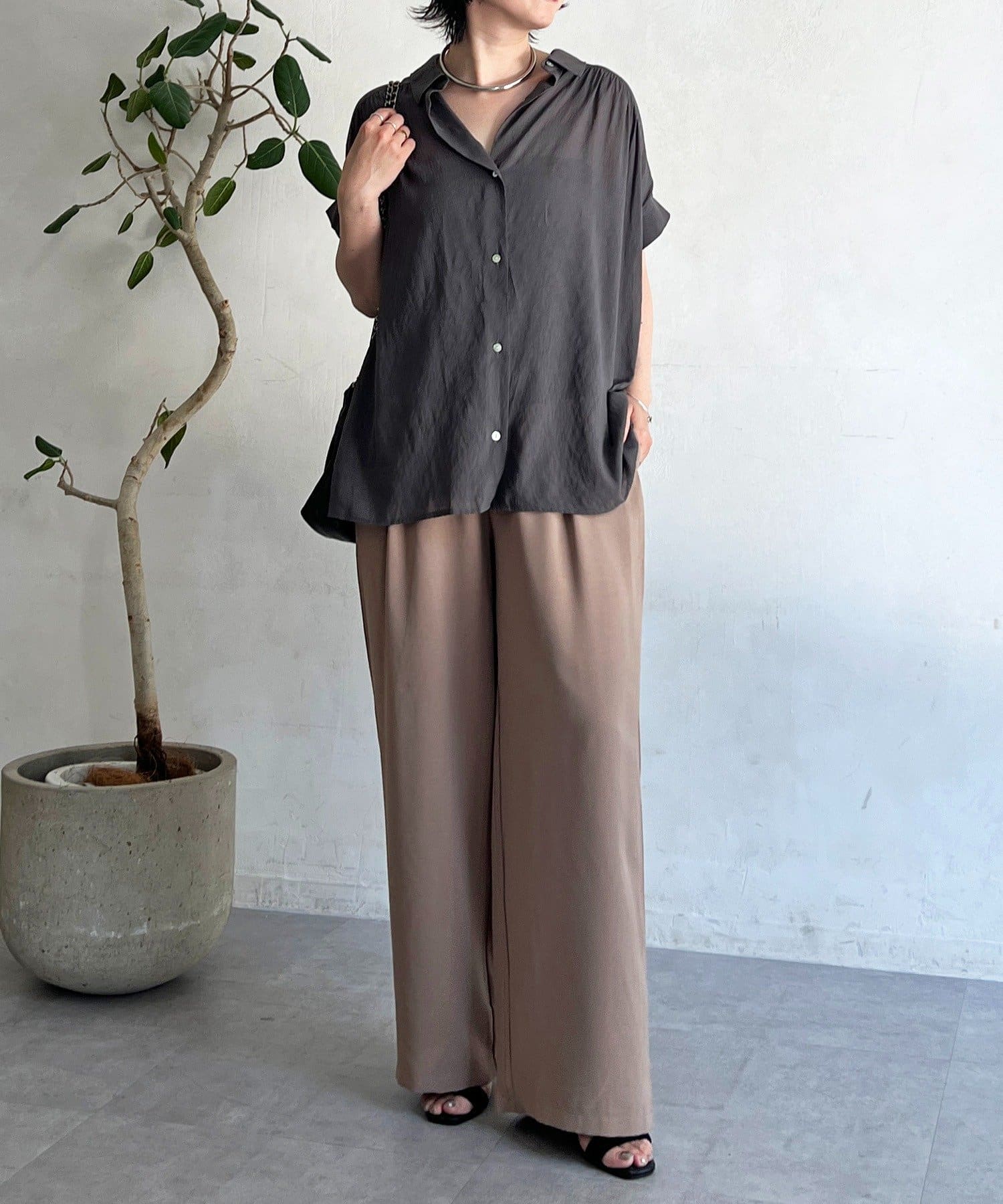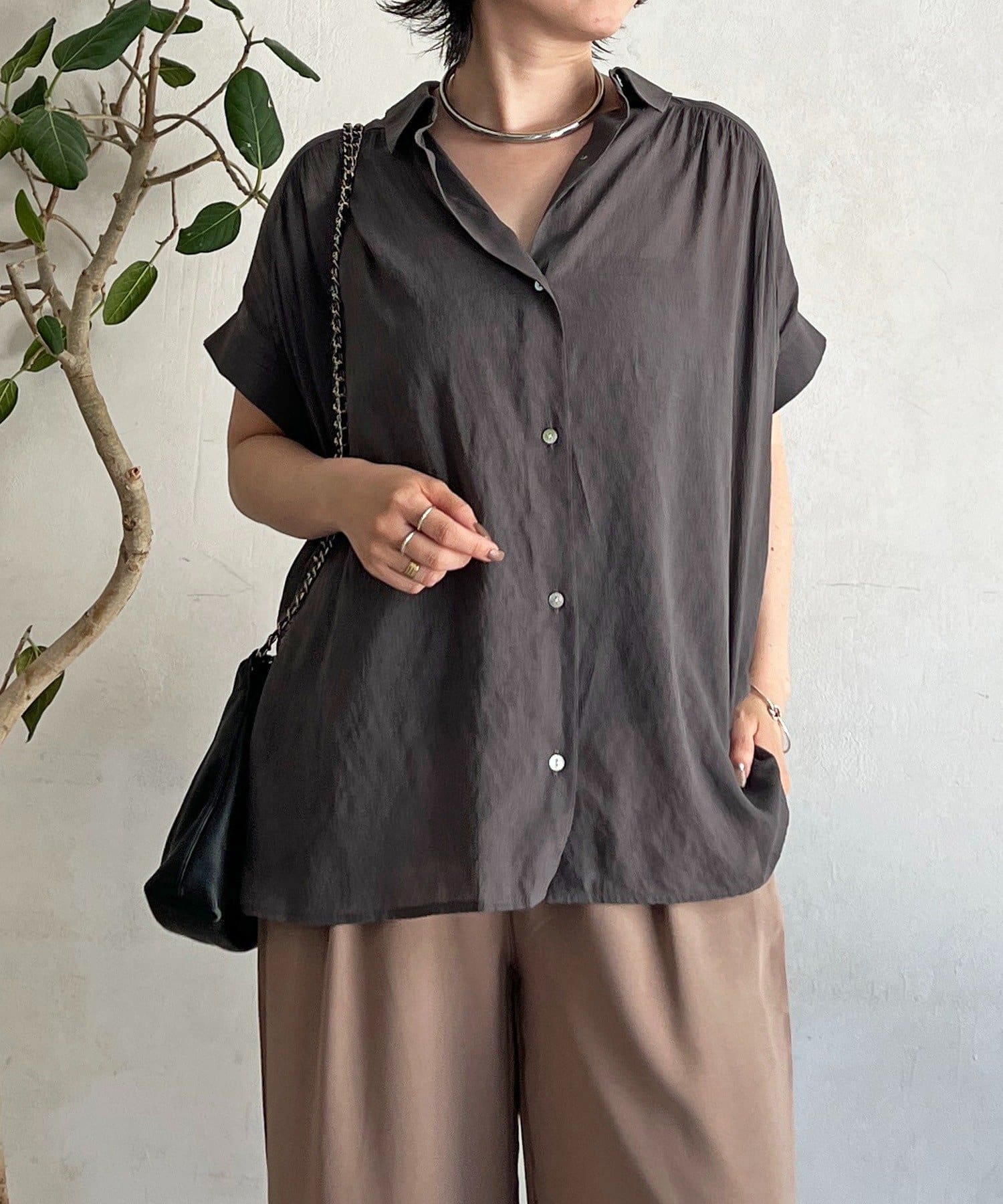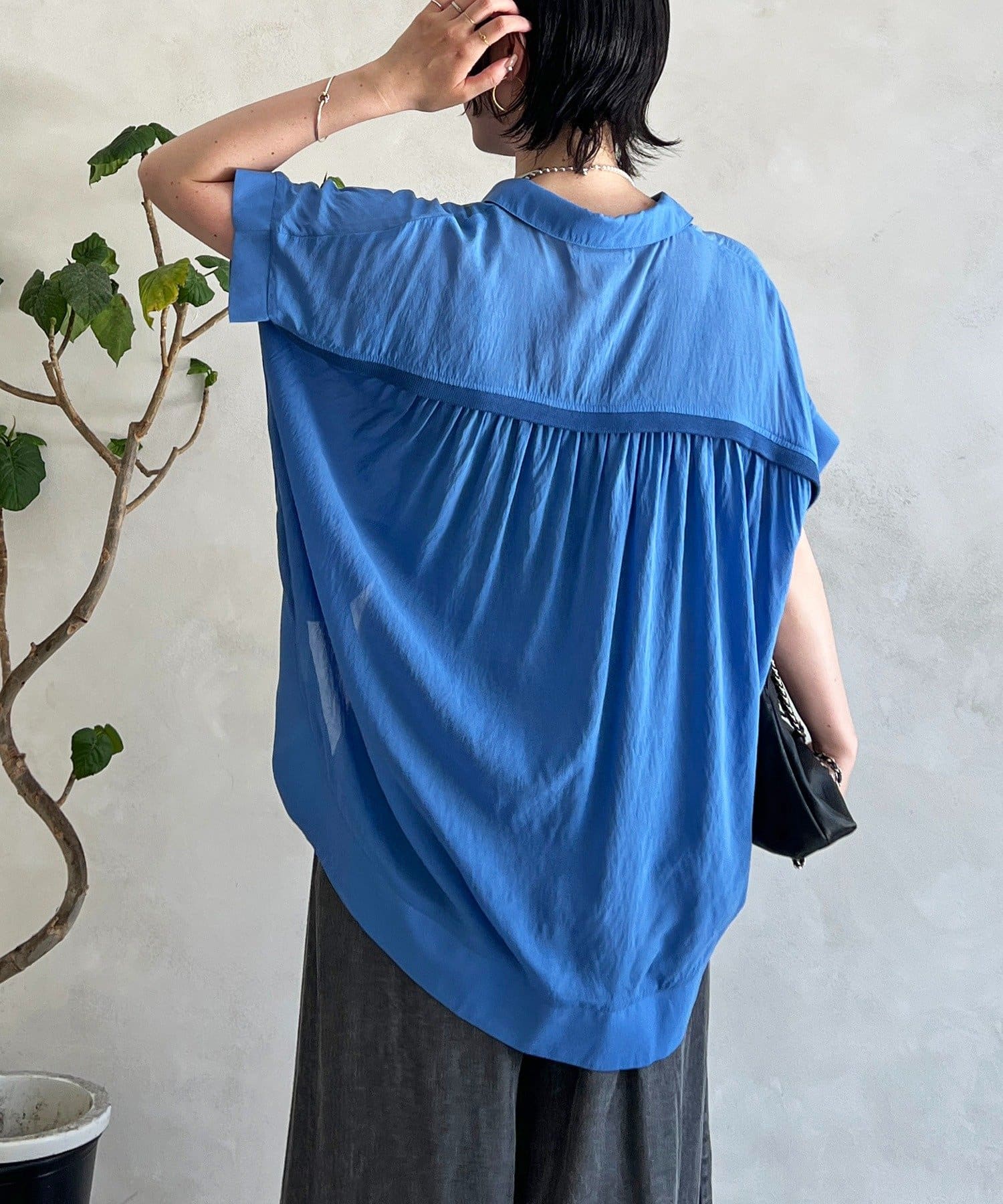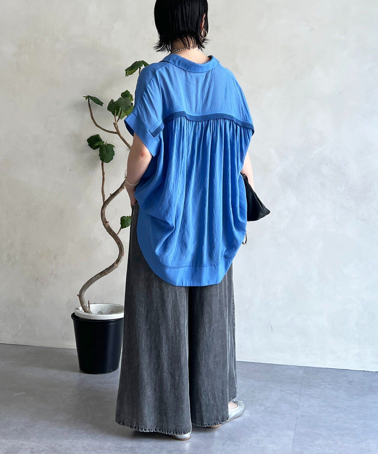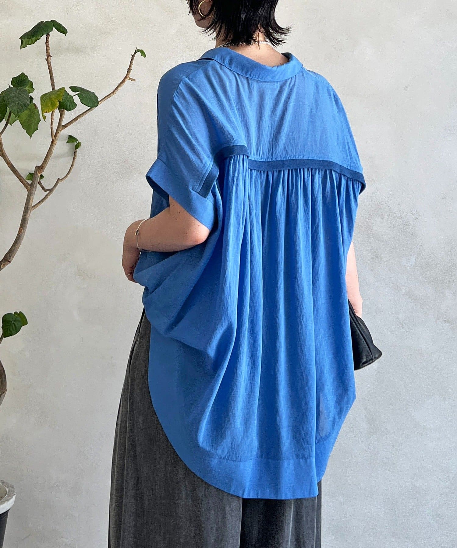 柔らかい風合いとバックギャザーデザインが華やかなブラウス