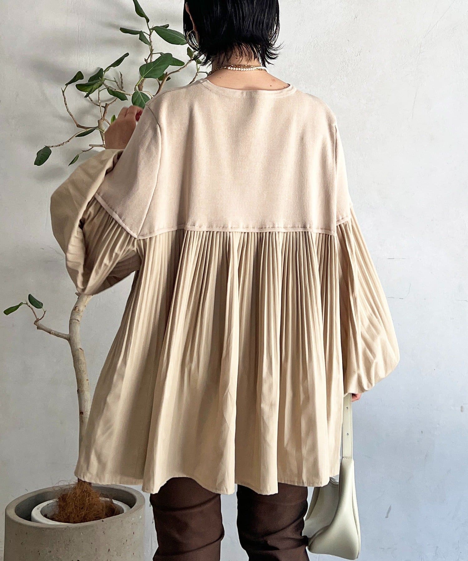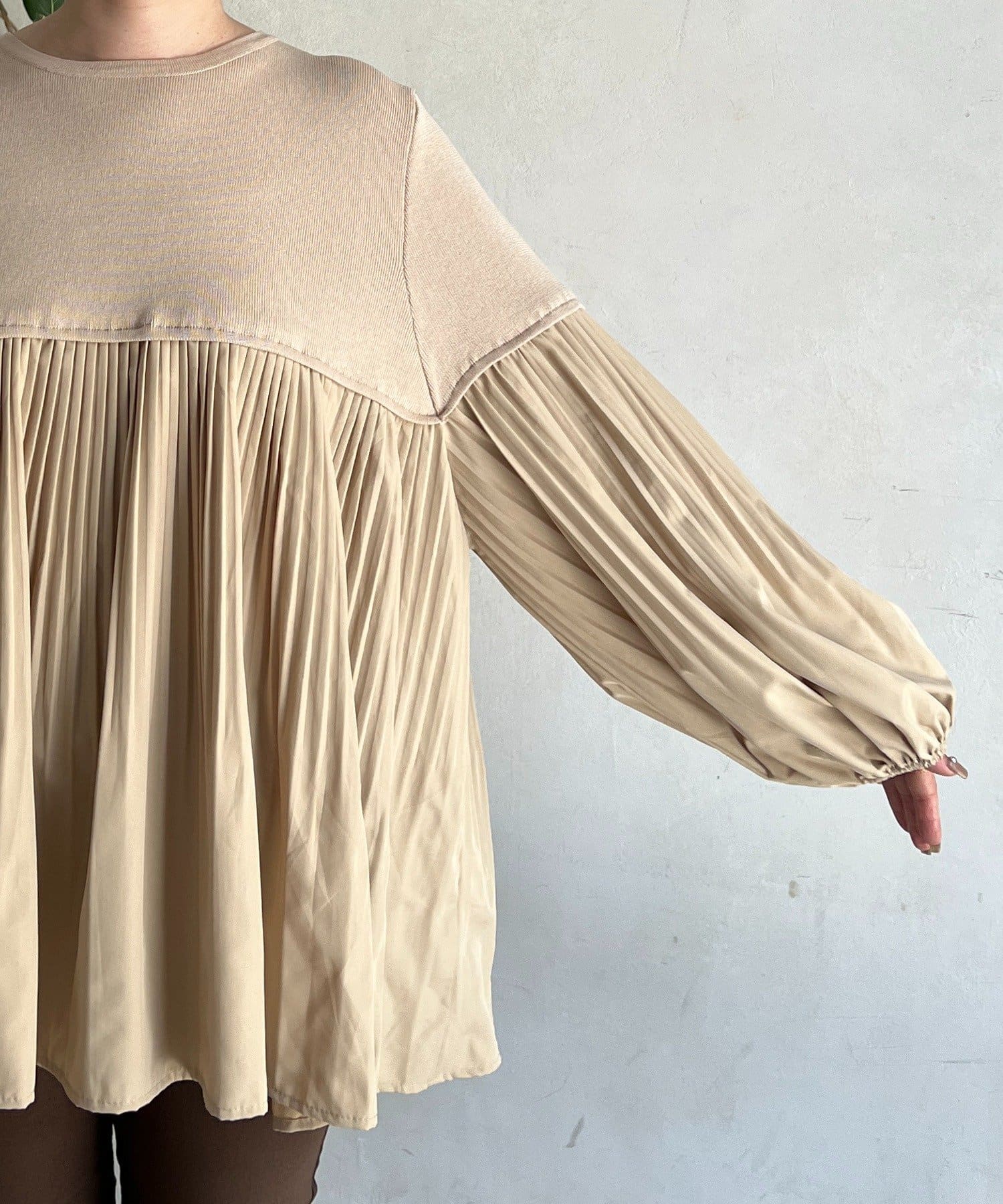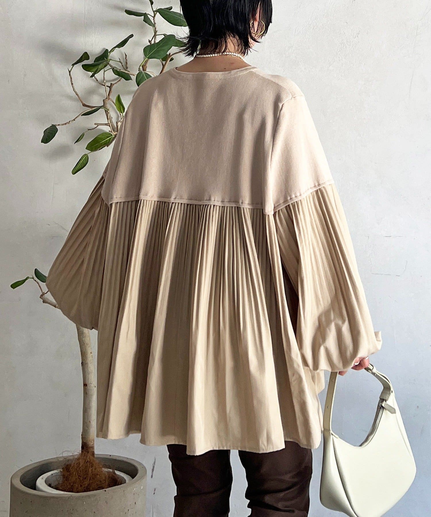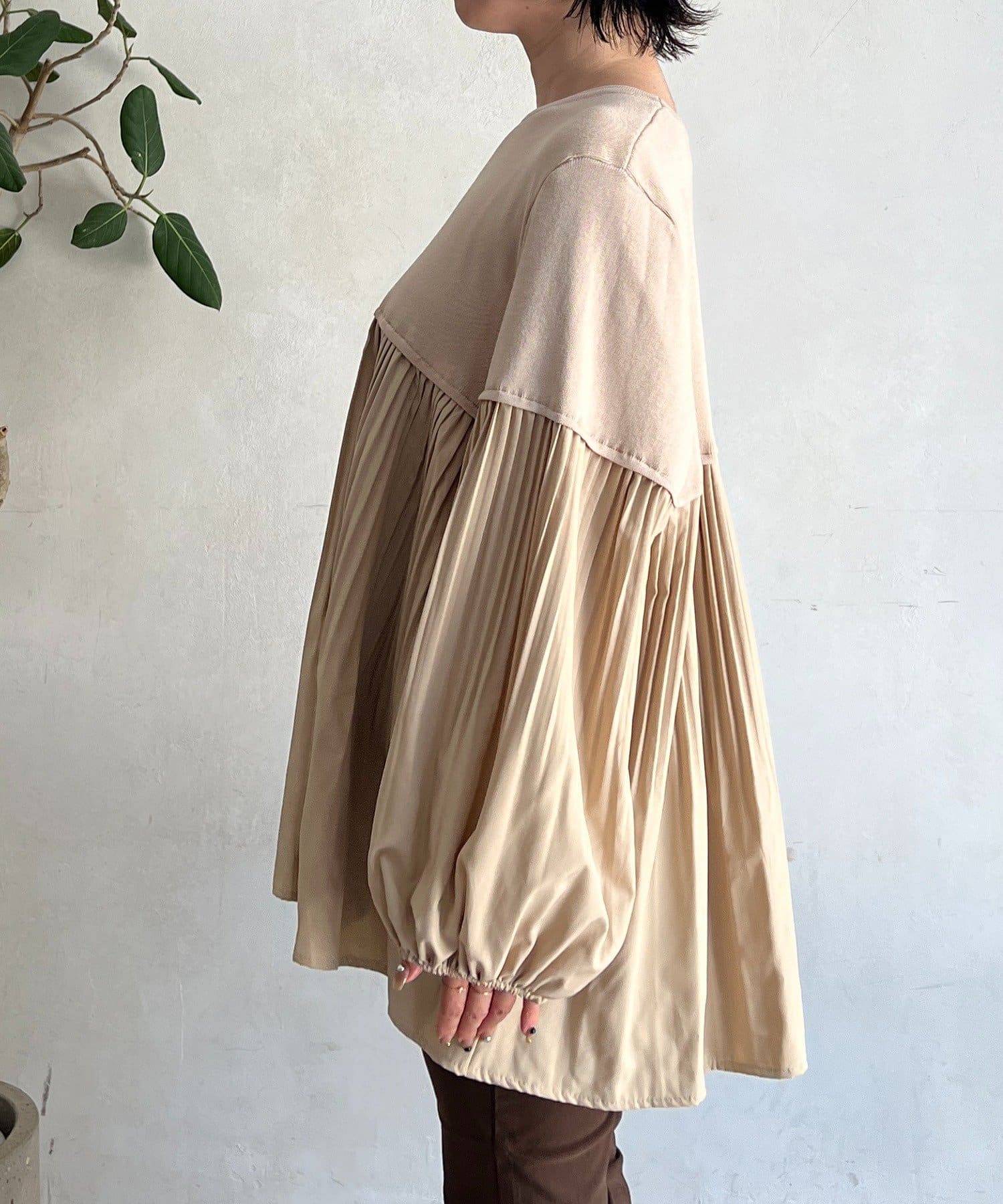 ・伸縮性のあるニットとブラウス素材のプリーツがドッキングした着映えカットソー