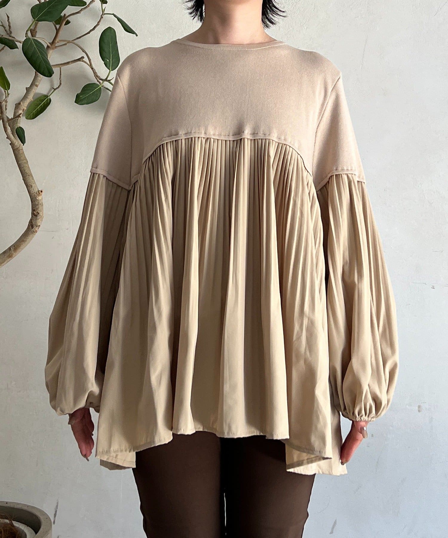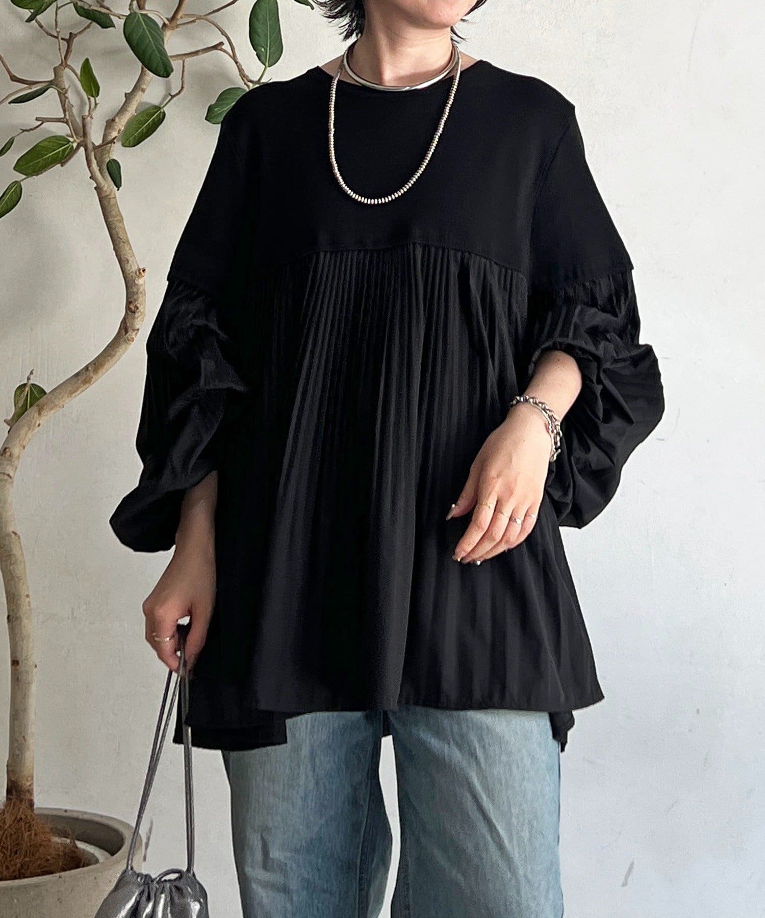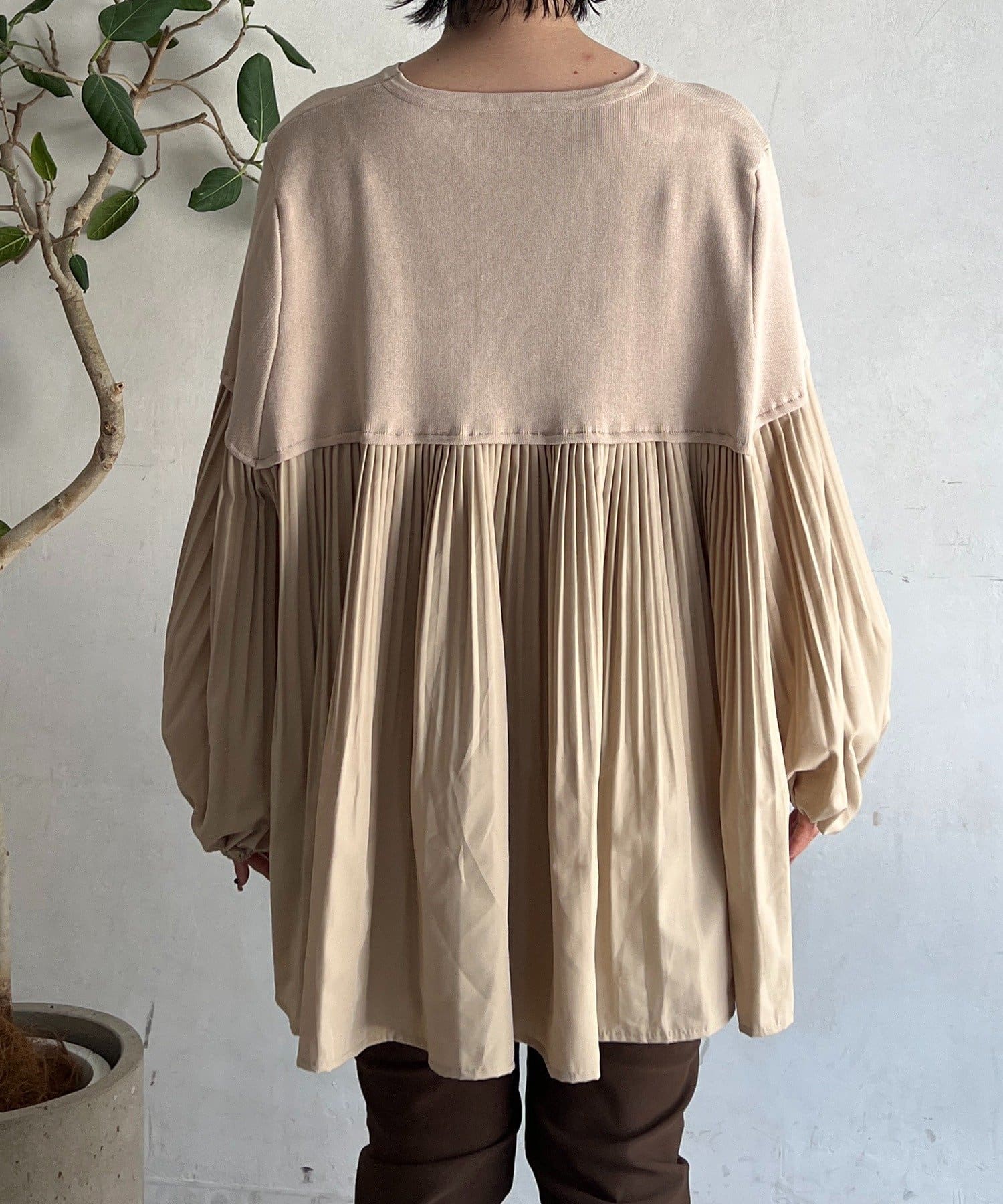 ・伸縮性のあるニットとブラウス素材のプリーツがドッキングした着映えカットソー