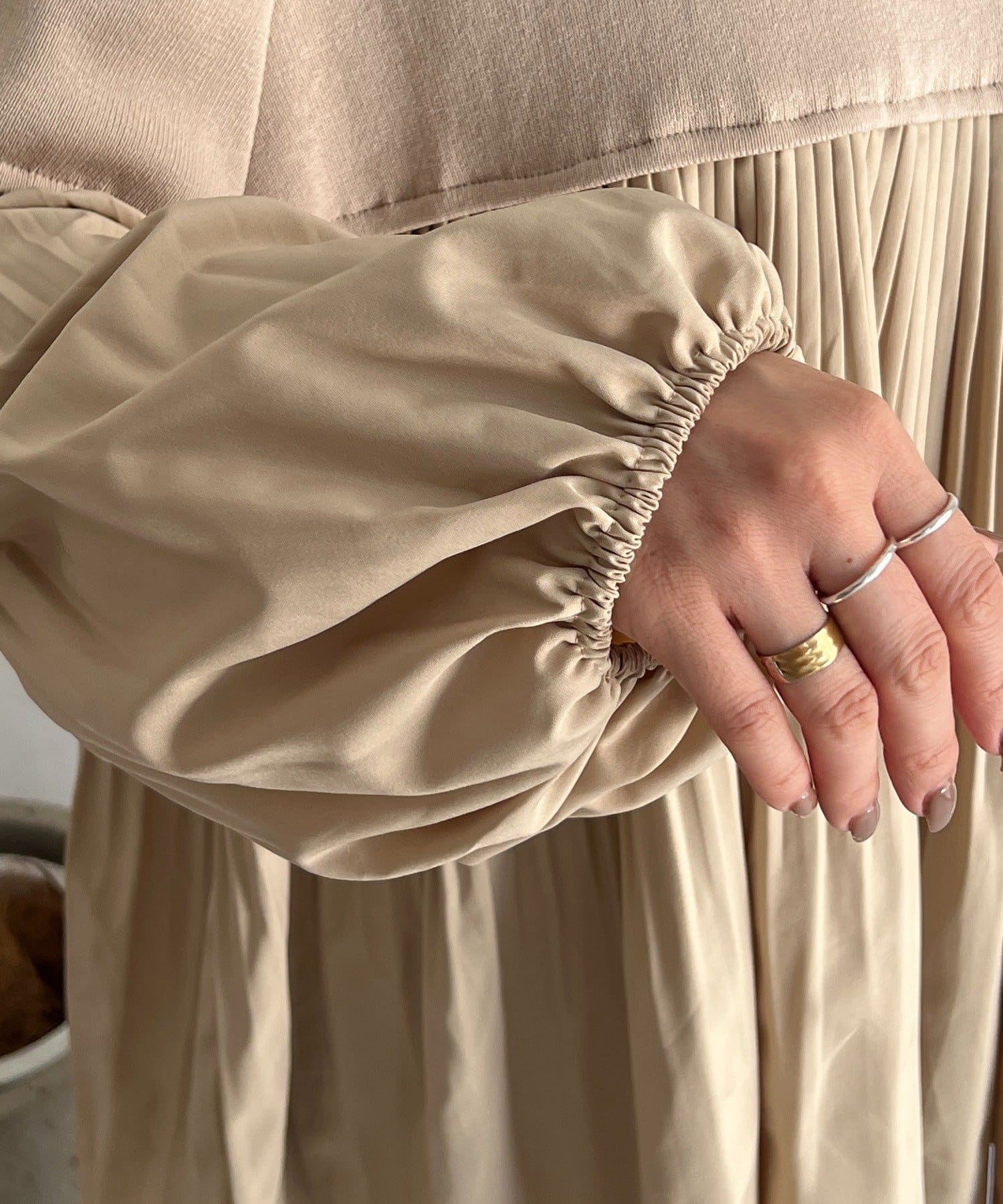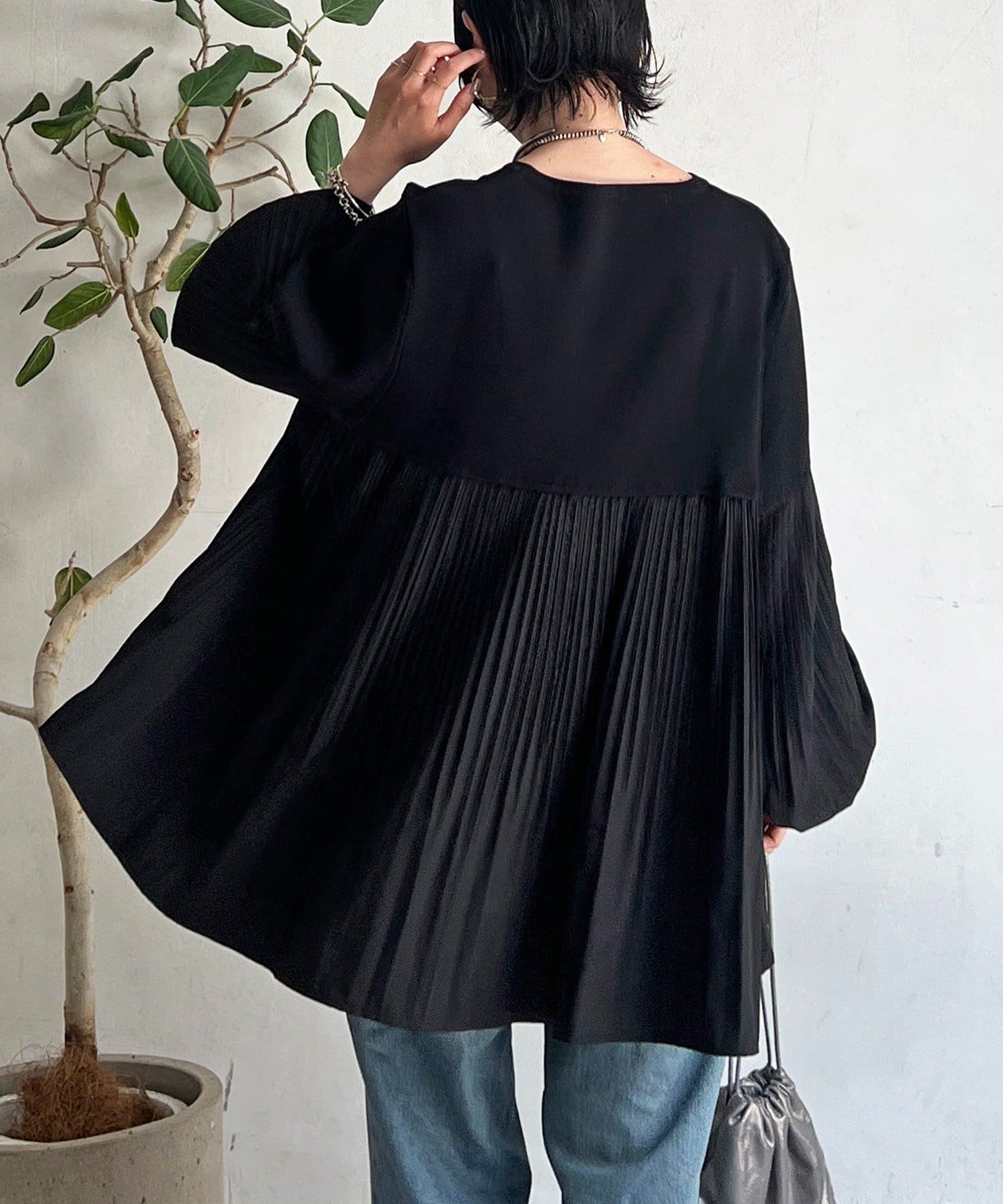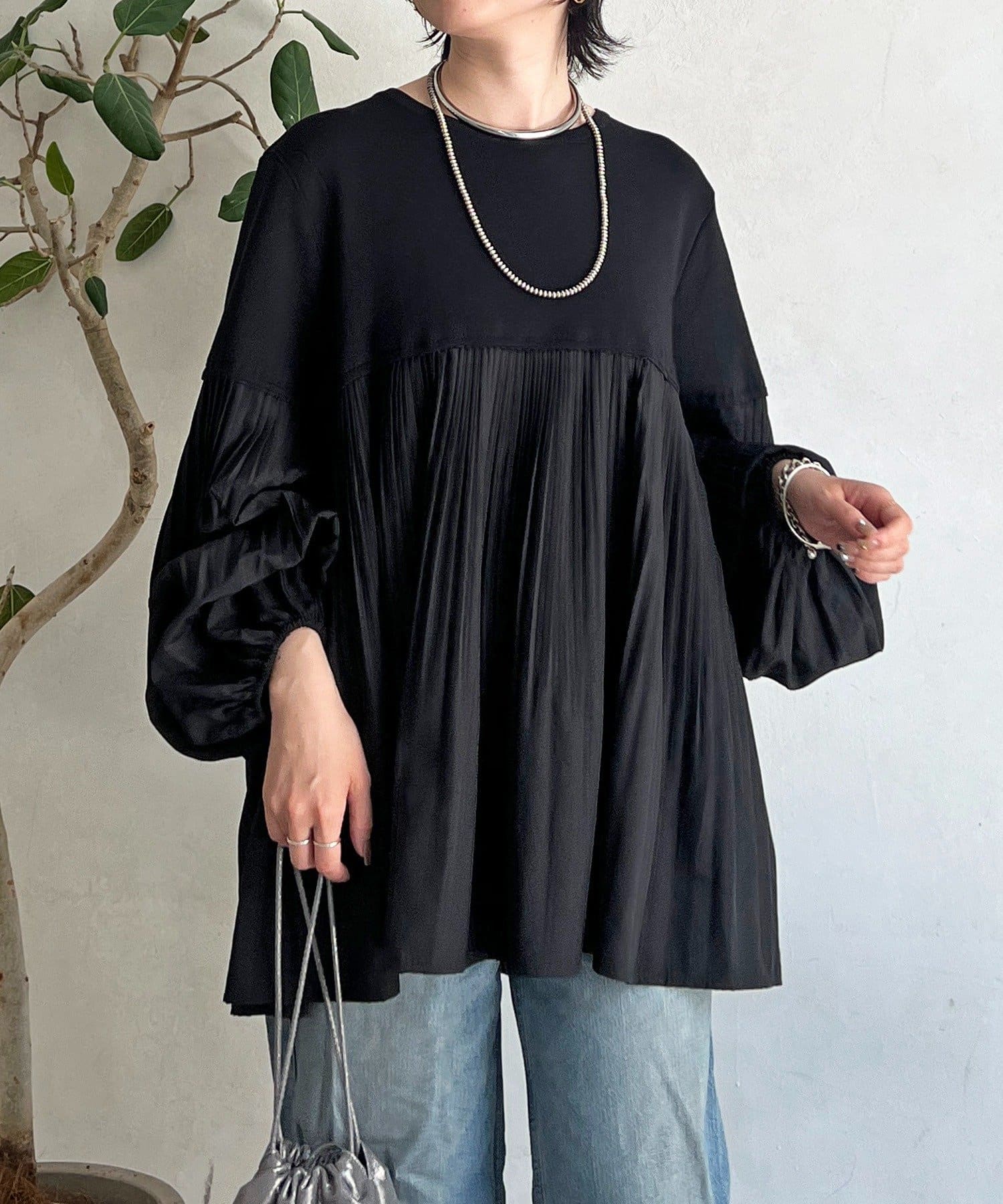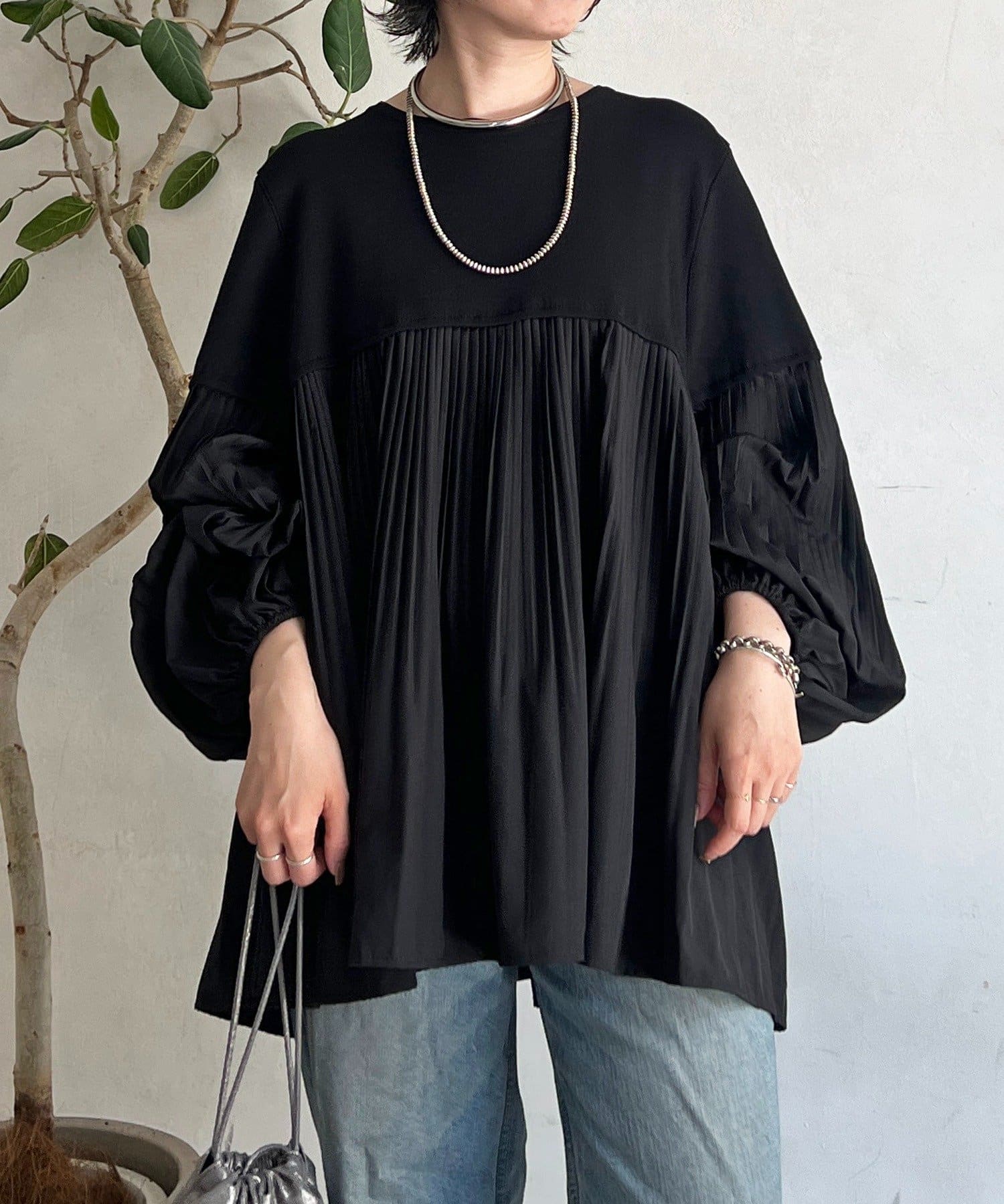 ・伸縮性のあるニットとブラウス素材のプリーツがドッキングした着映えカットソー