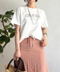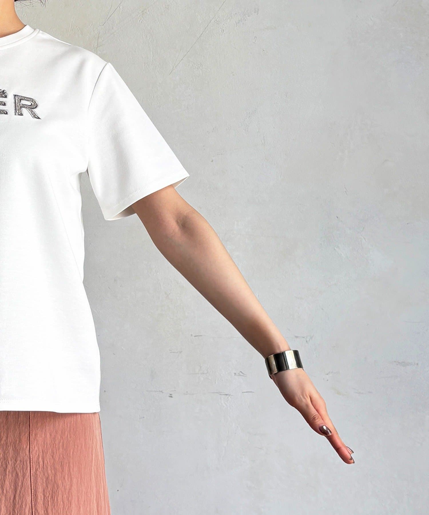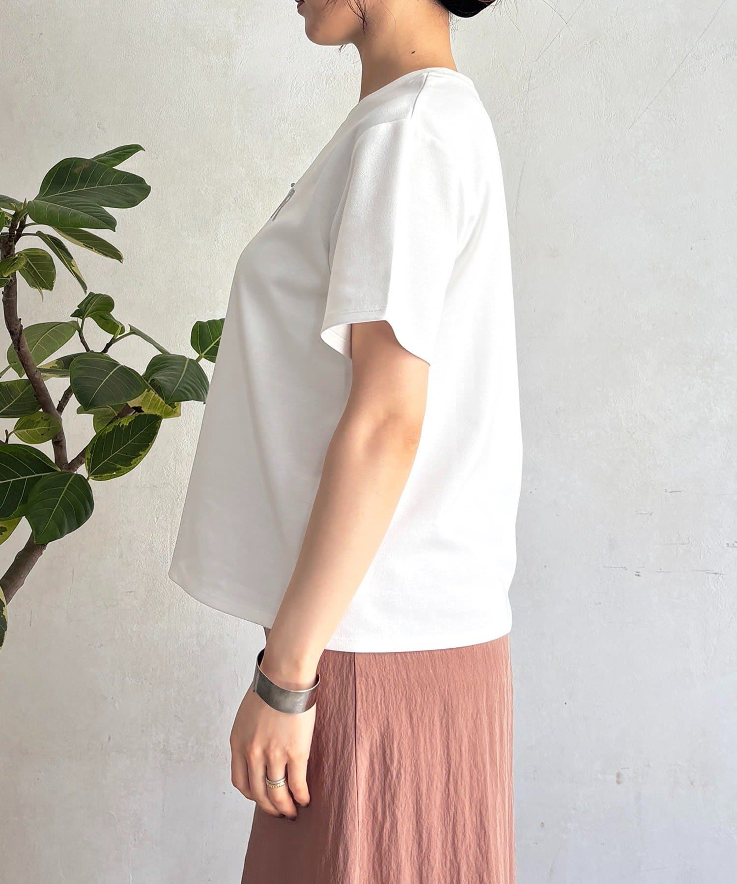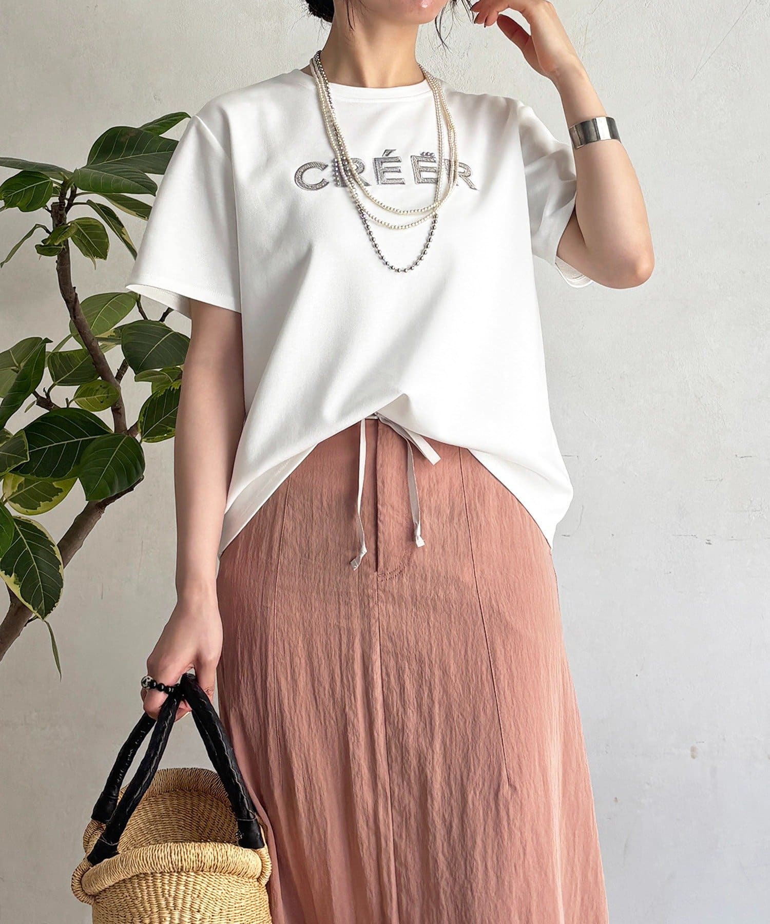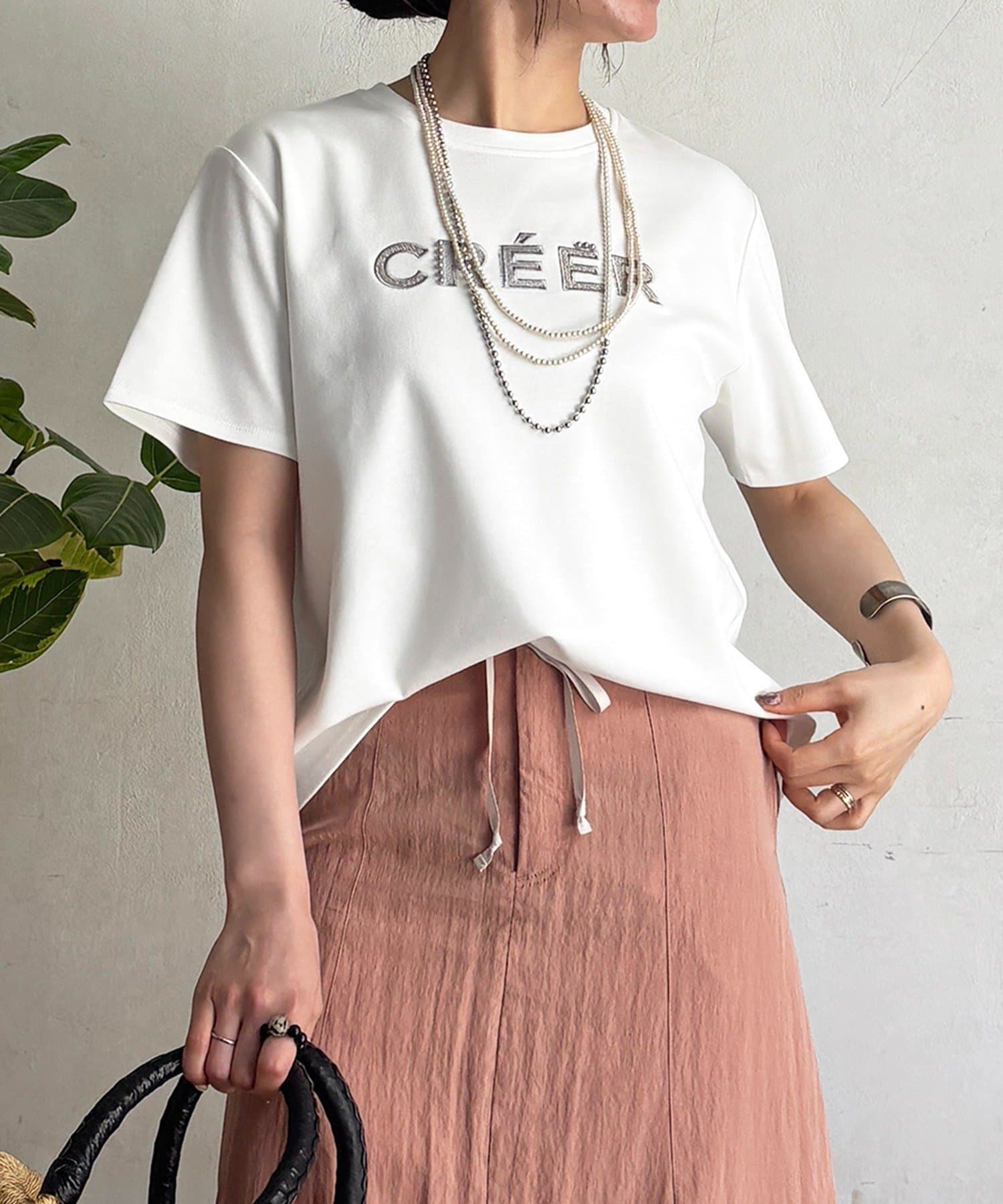 上品カジュアルに着こなせるビーズ×刺繍ロゴTシャツ
