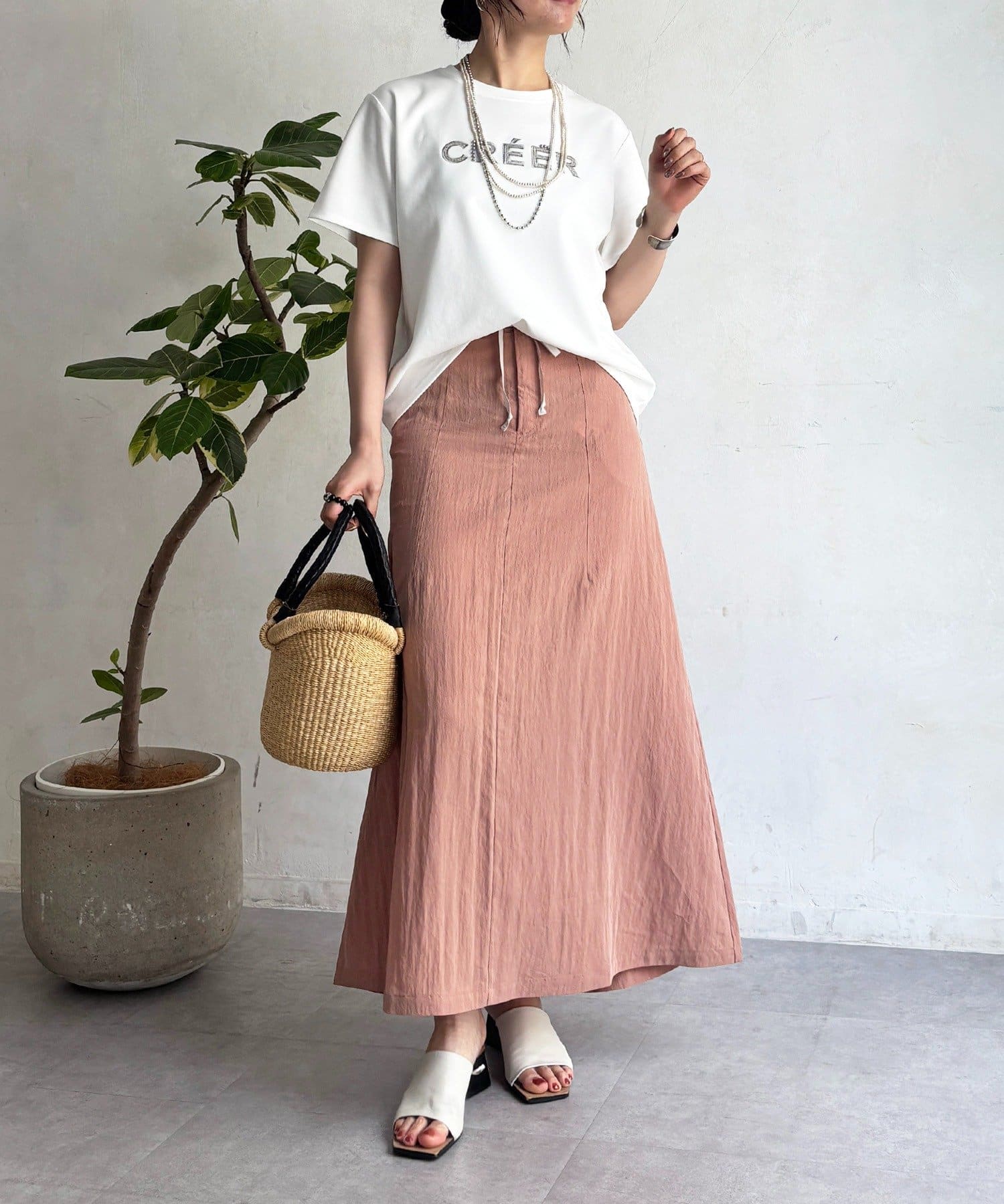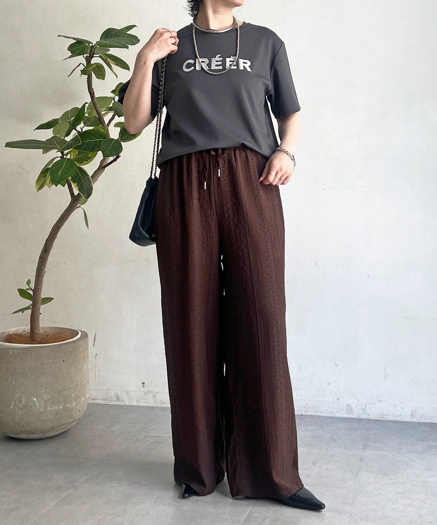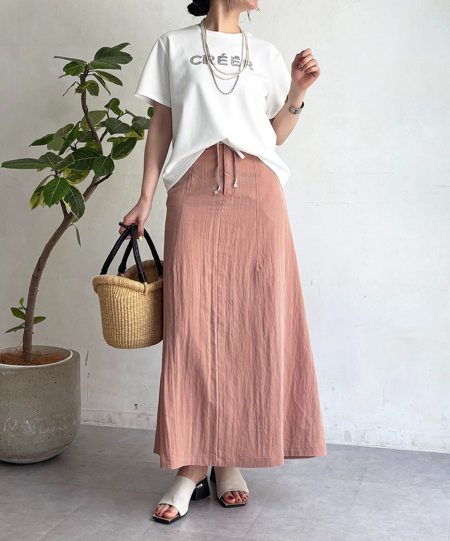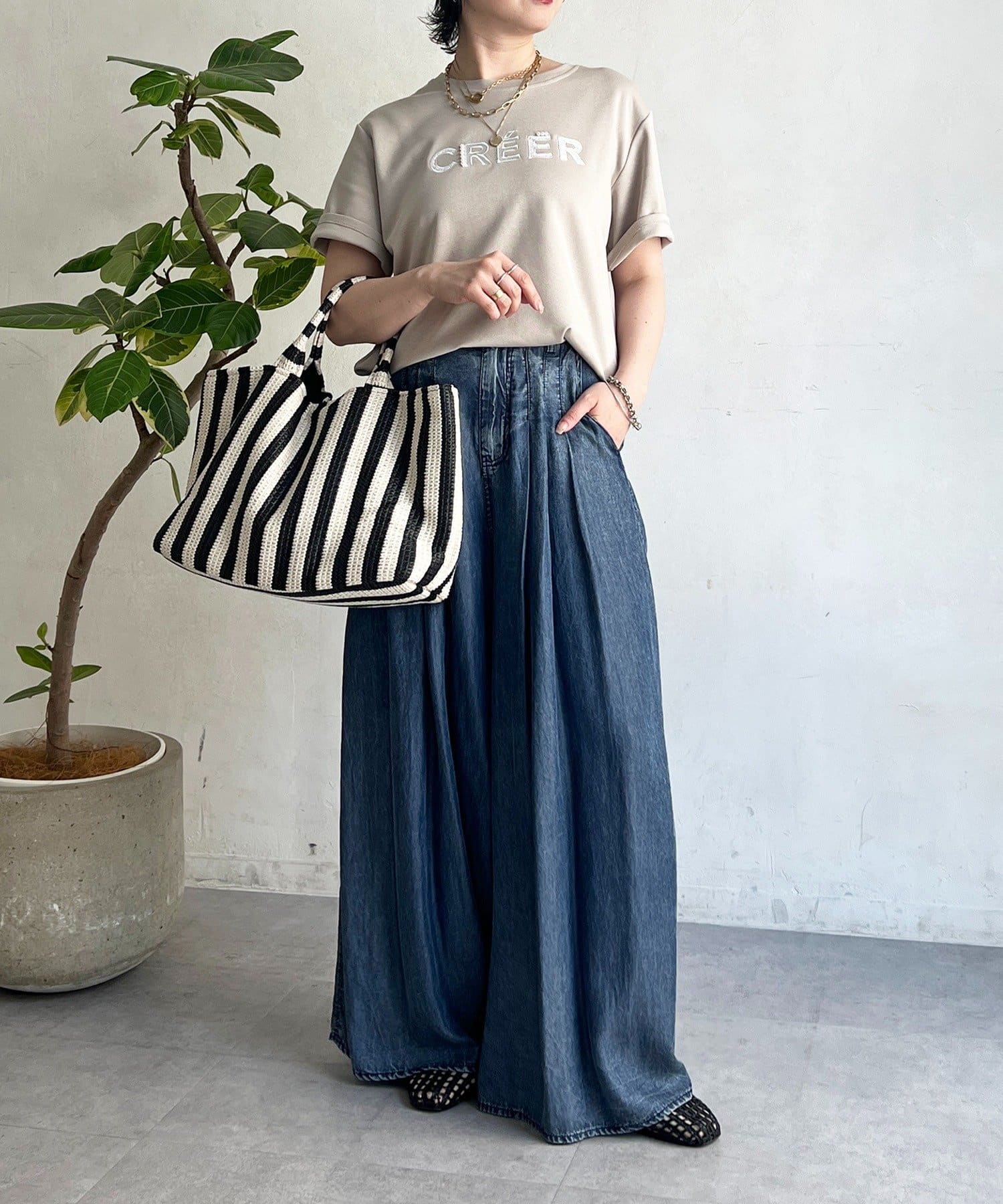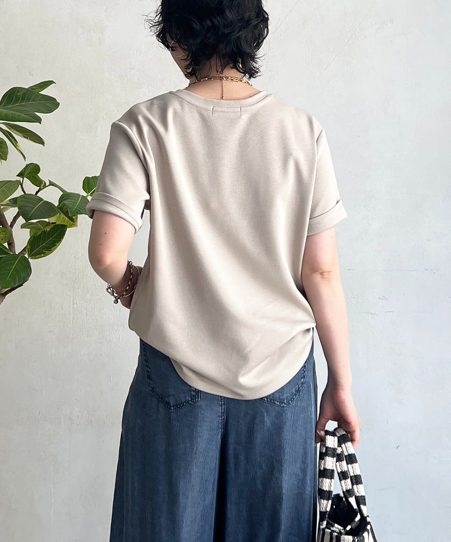 上品カジュアルに着こなせるビーズ×刺繍ロゴTシャツ