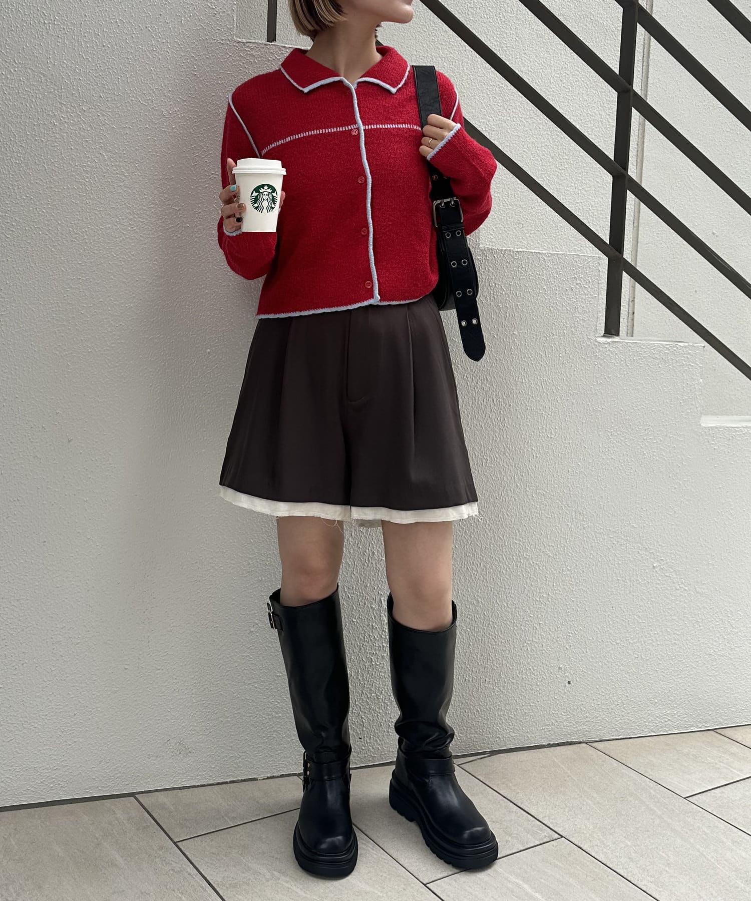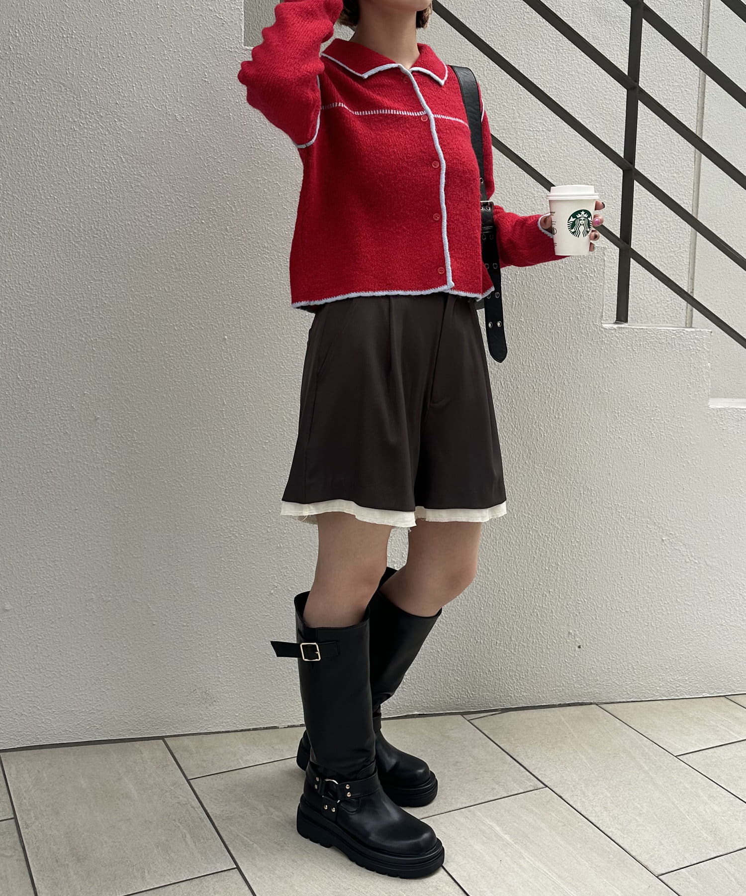 ・襟のあるきっちりした印象のトップスなのでミニスカパンと合わせてガーリーさをプラスしても可愛いです