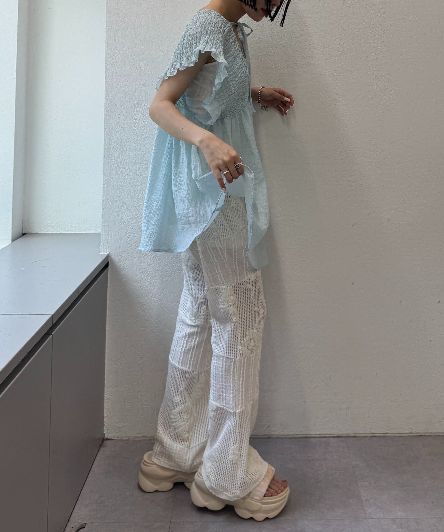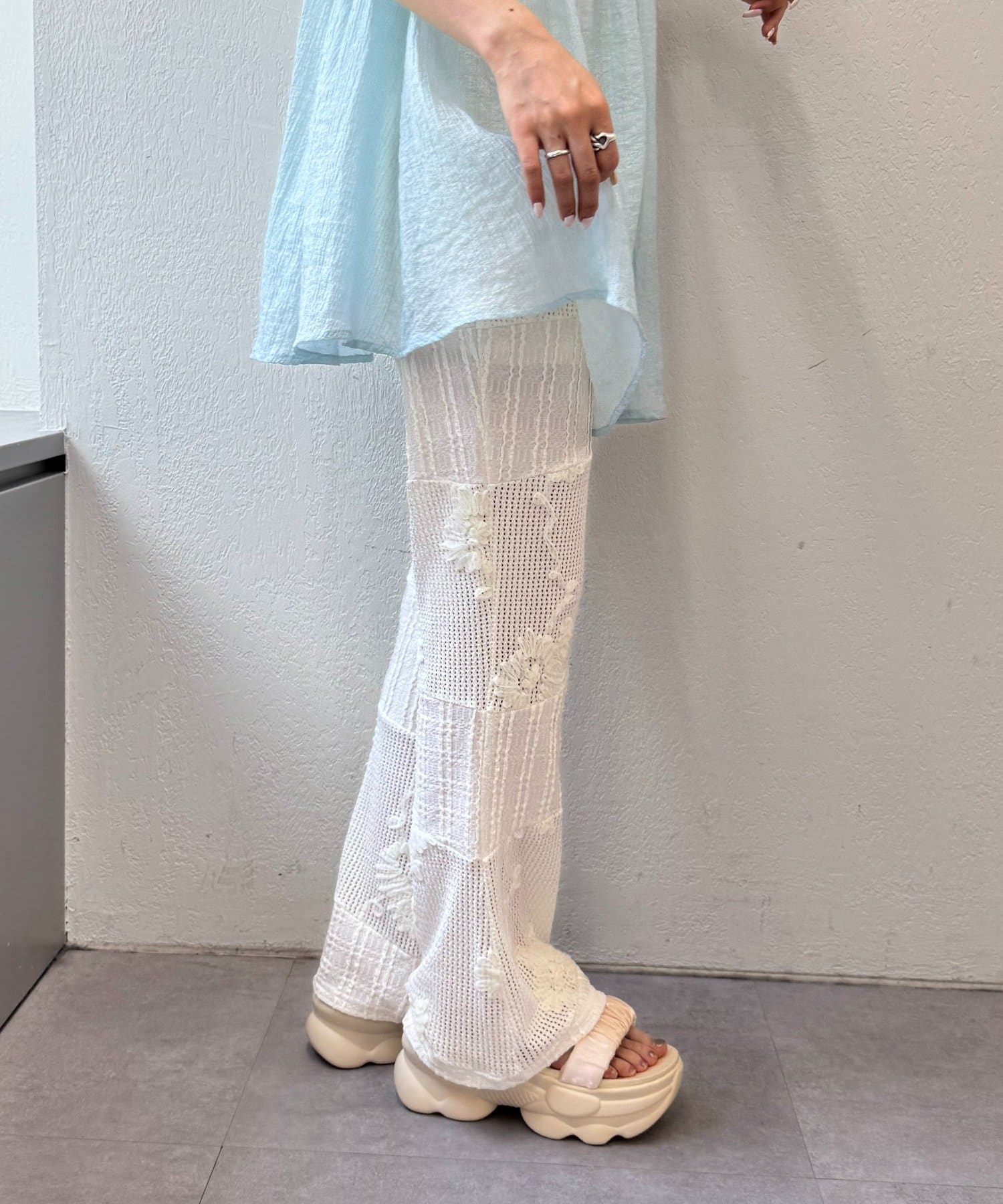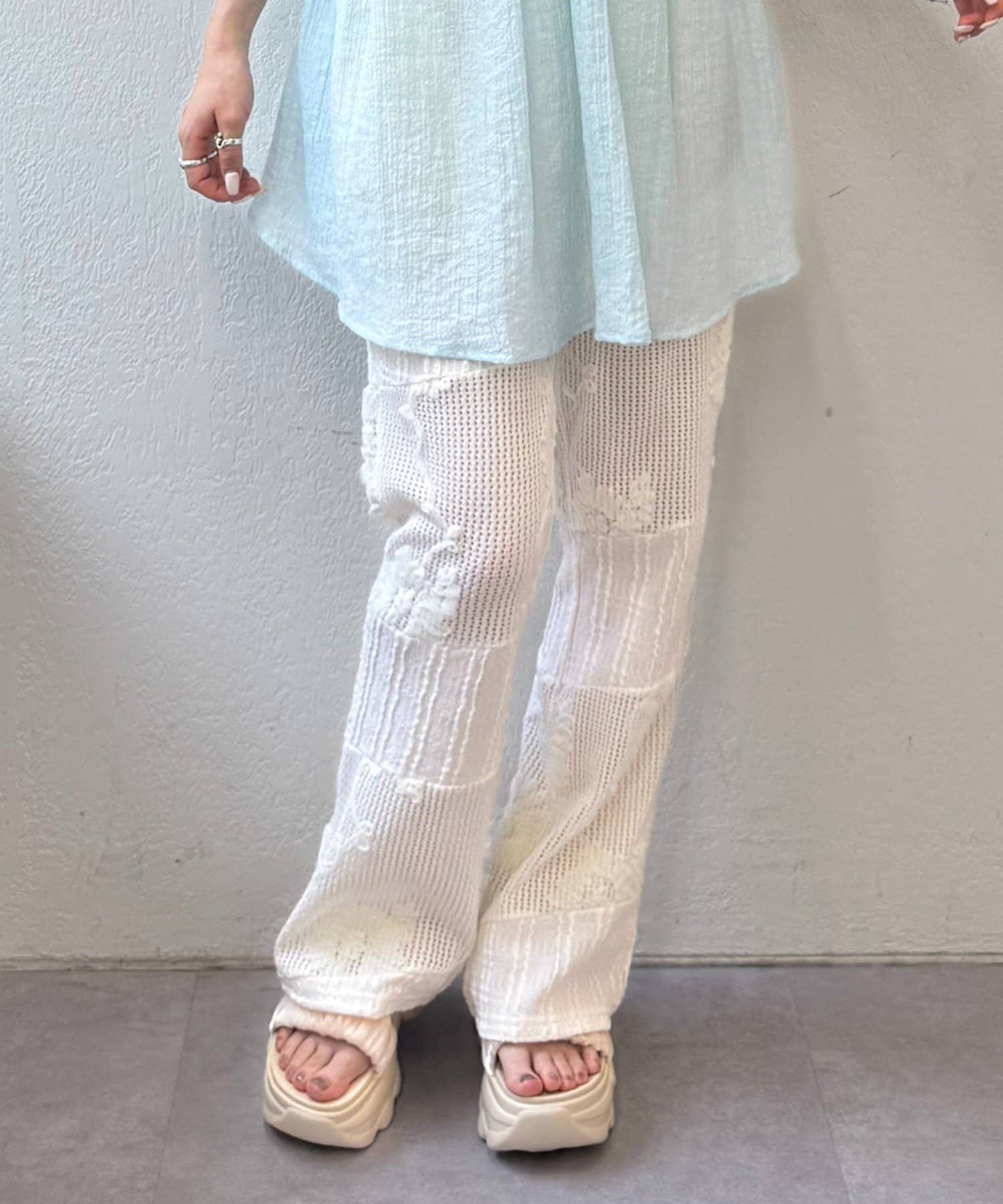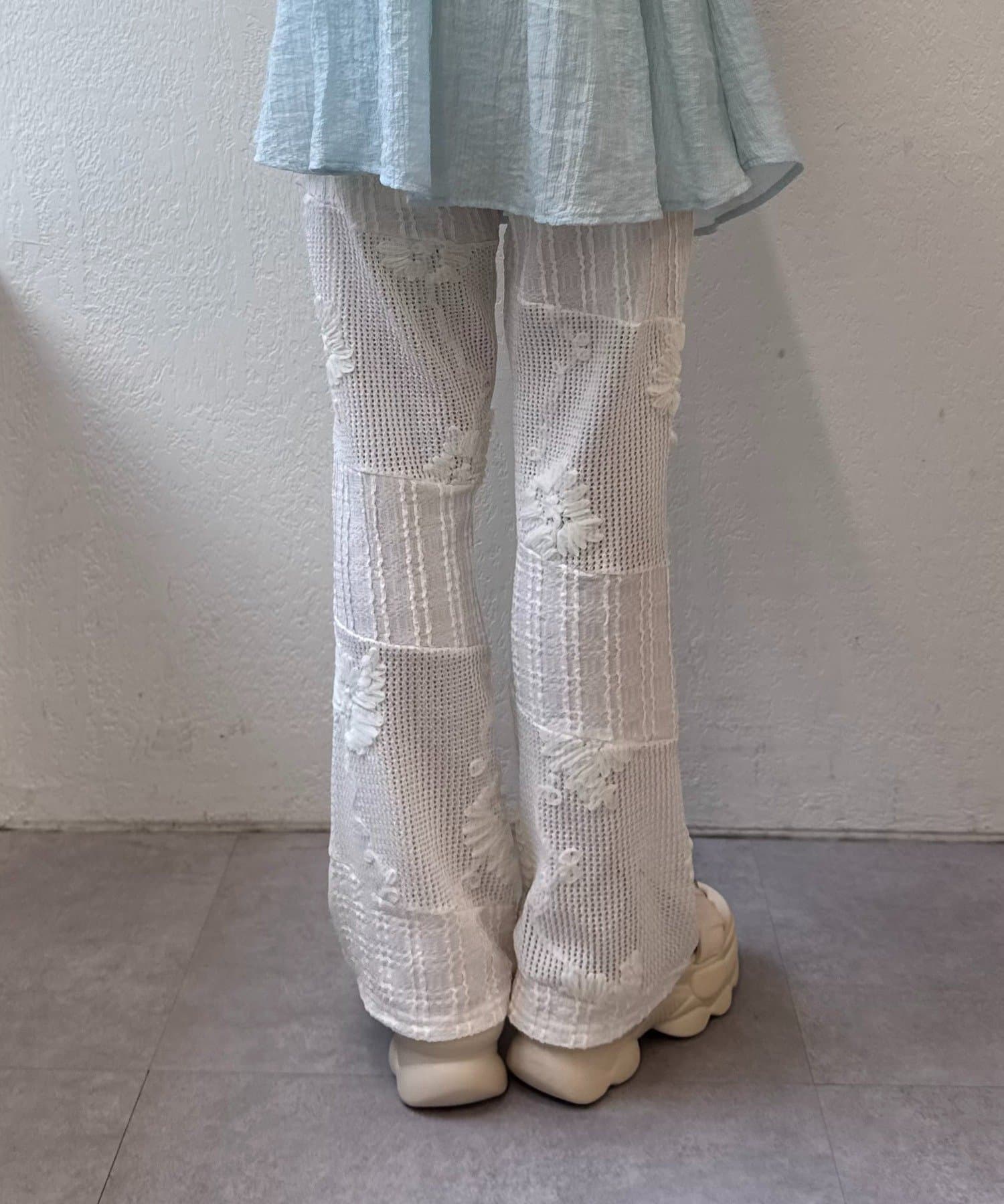 ・フラワーの付いたメッシュ生地とシワ感のあるふんわりとした生地が交互でになったレースパンツ