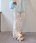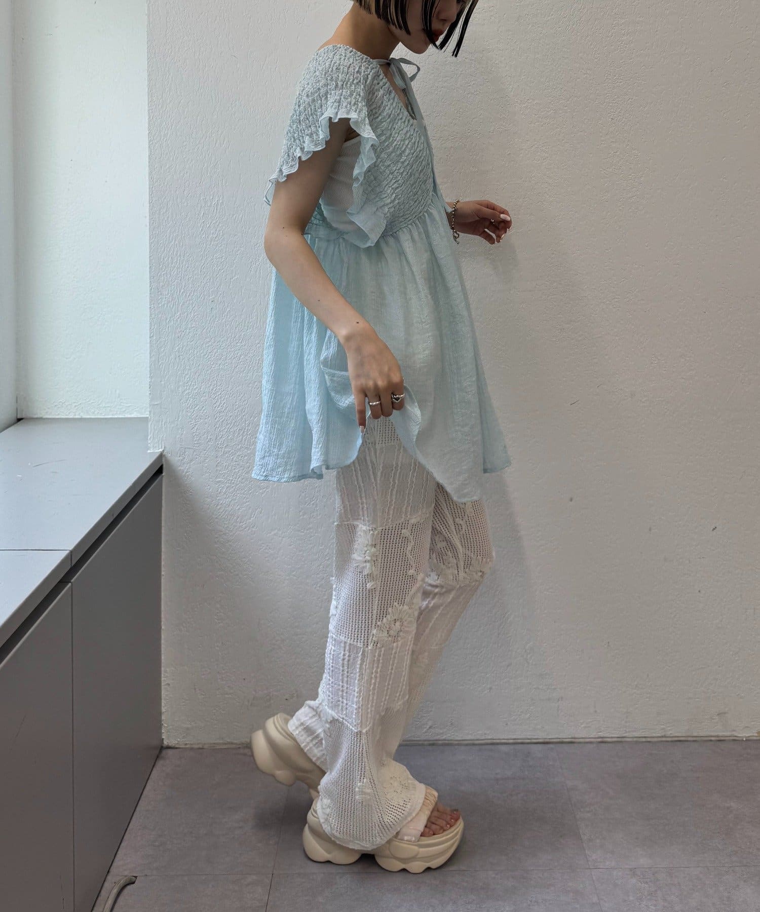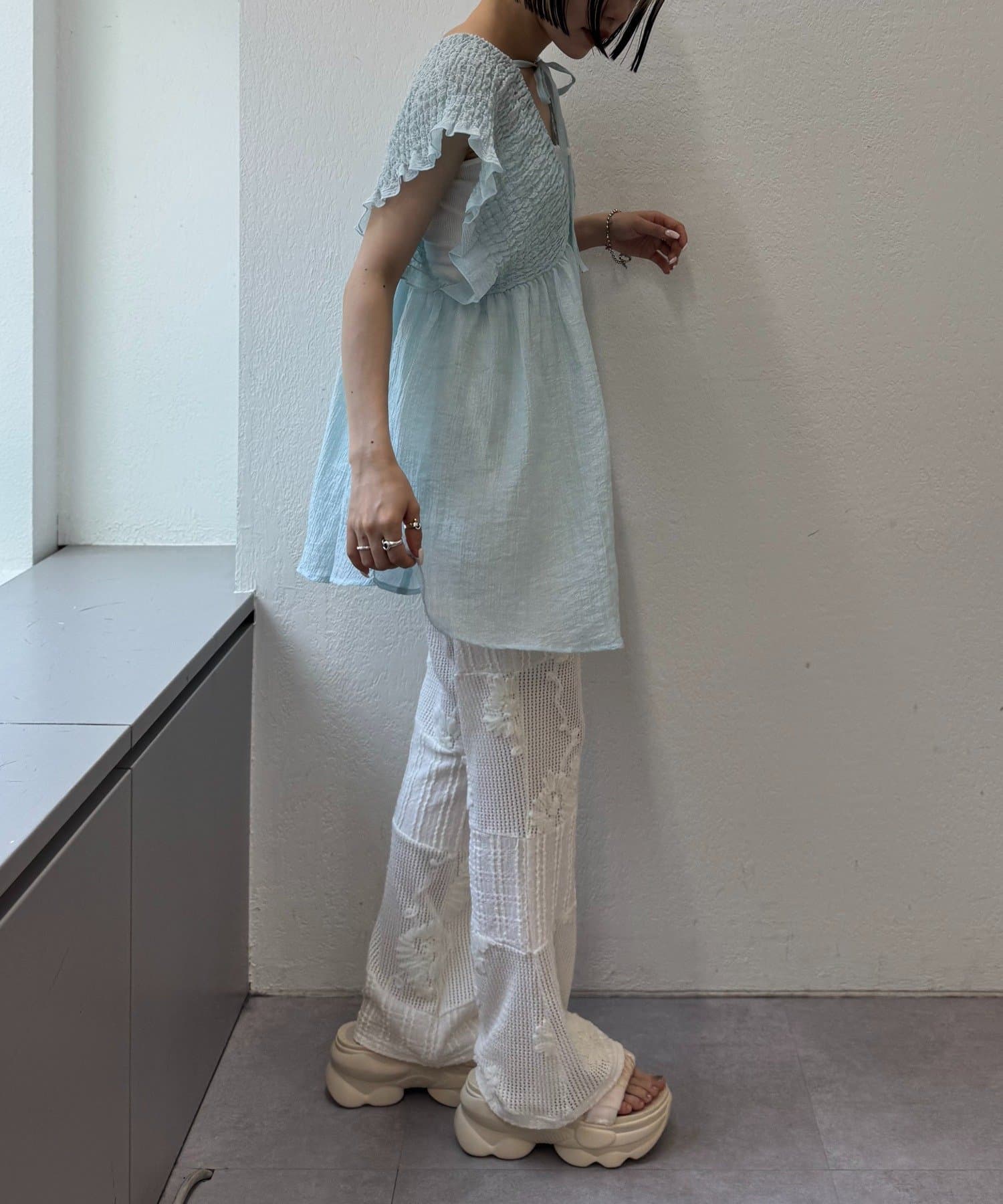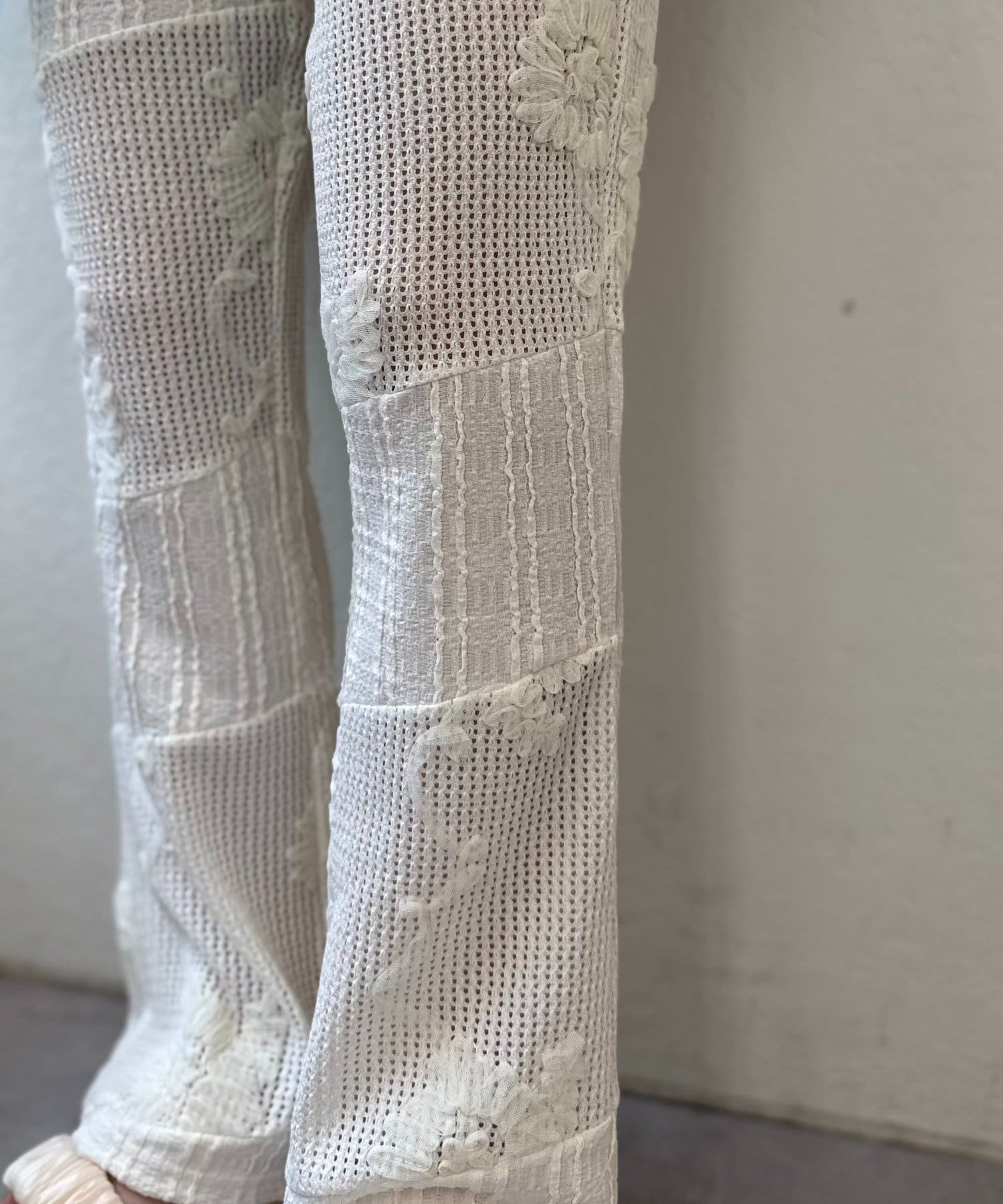 ・フラワーの付いたメッシュ生地とシワ感のあるふんわりとした生地が交互でになったレースパンツ