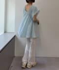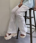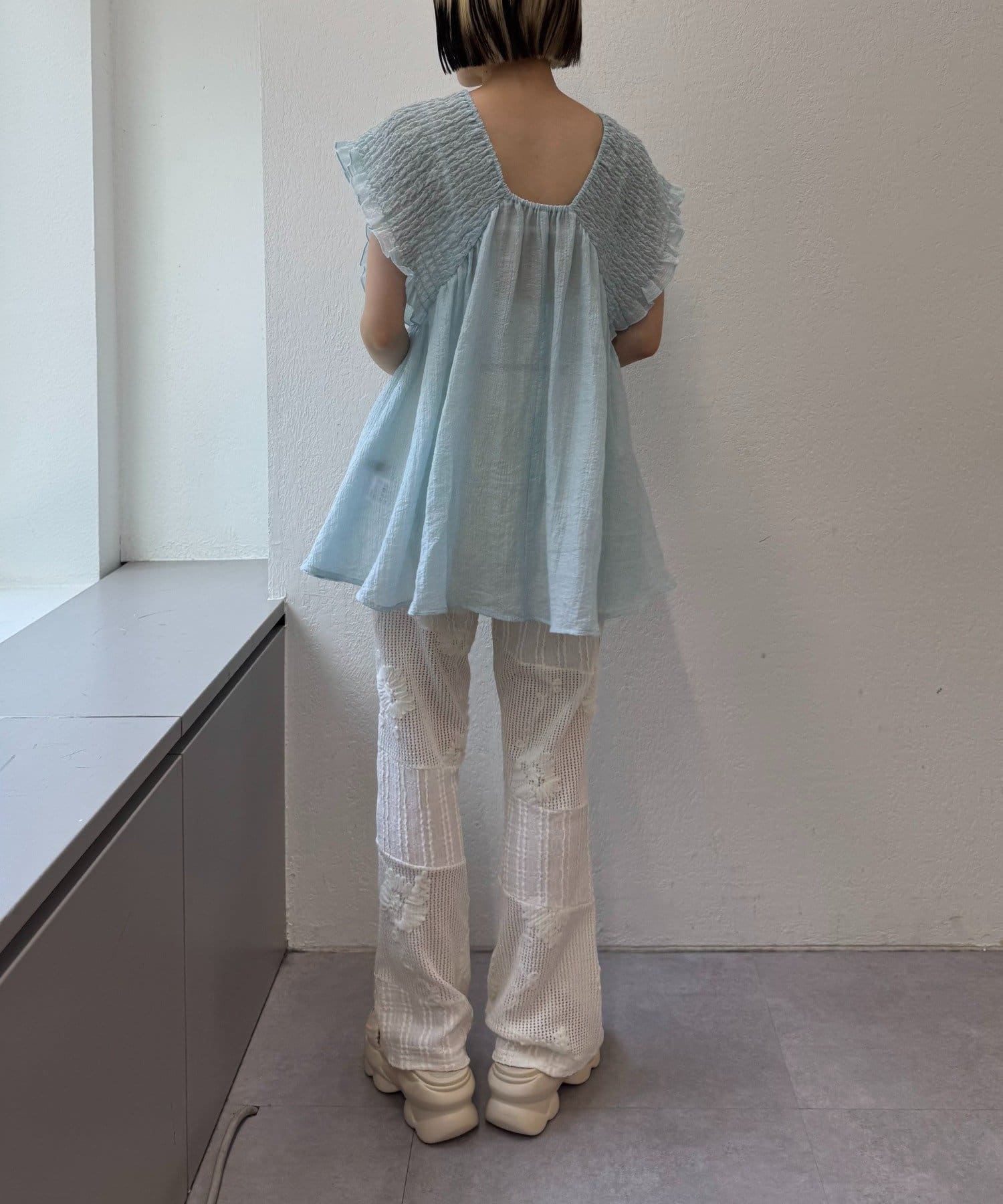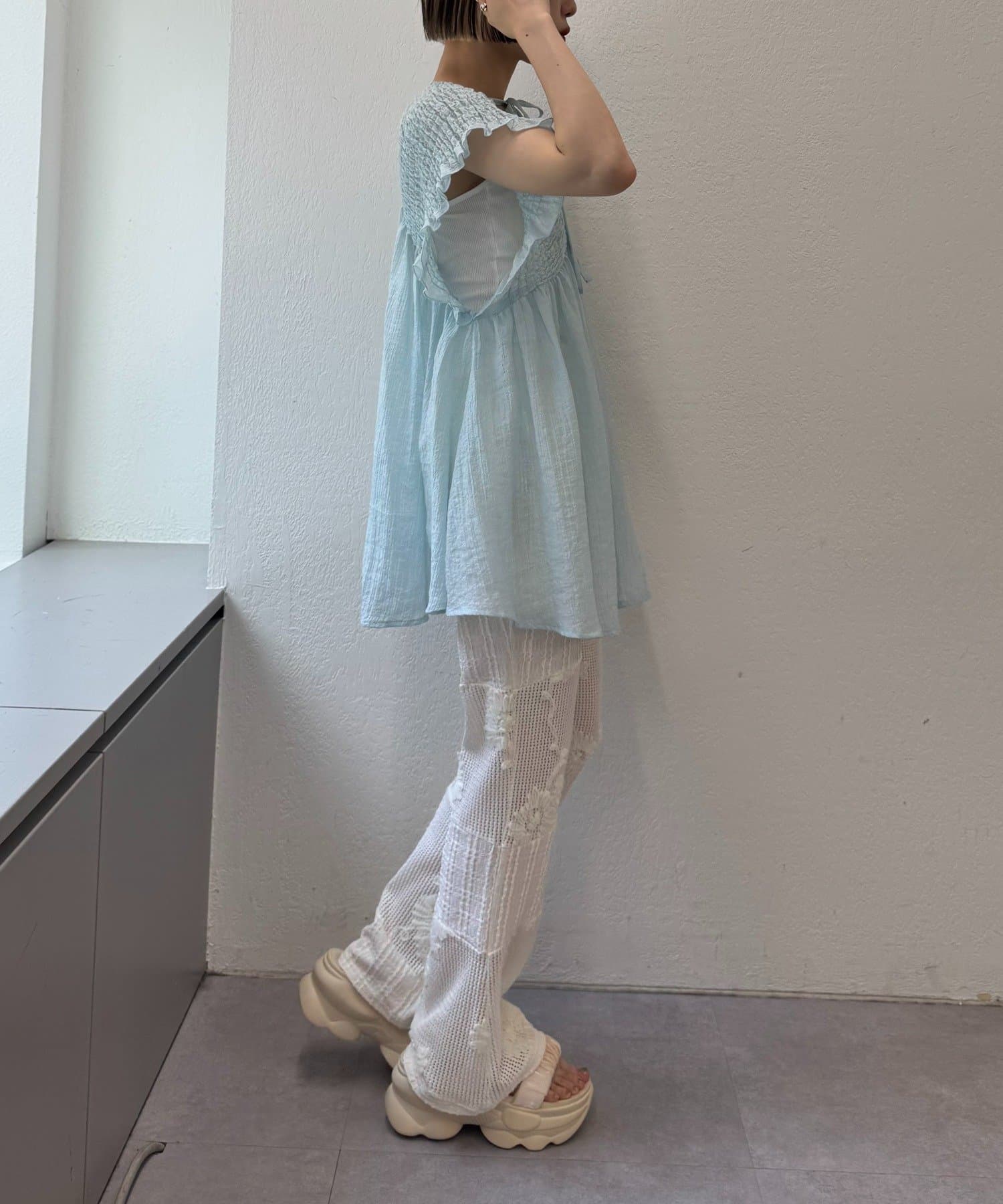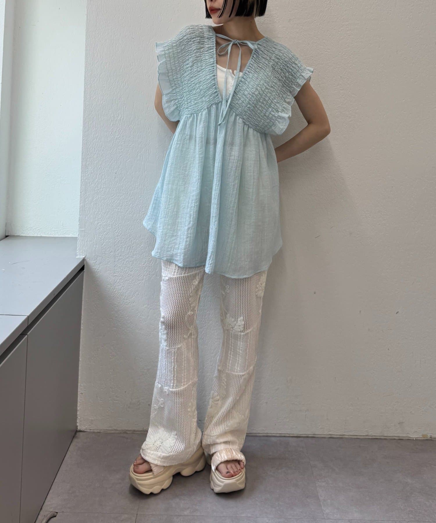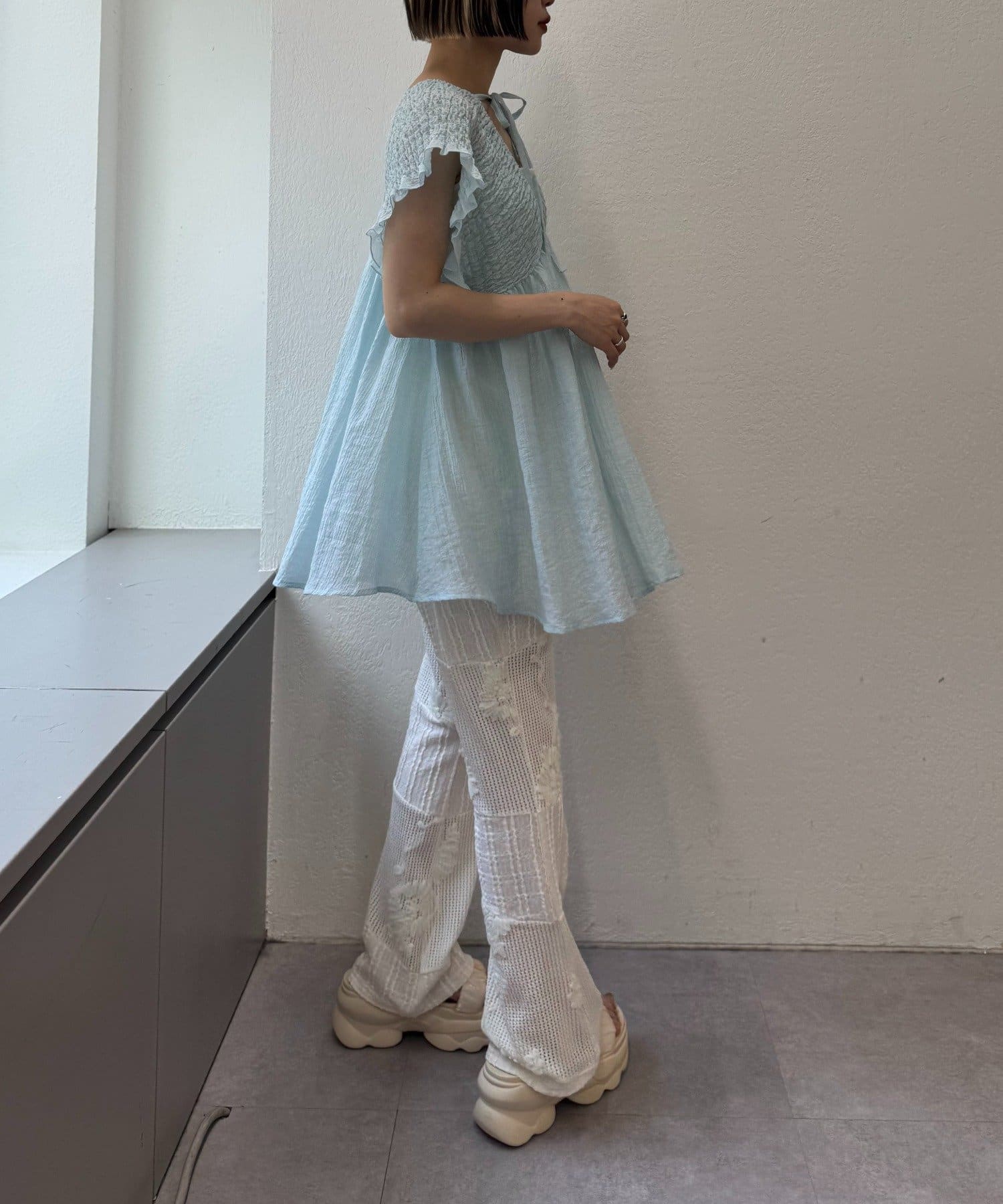 ・フラワーの付いたメッシュ生地とシワ感のあるふんわりとした生地が交互でになったレースパンツ