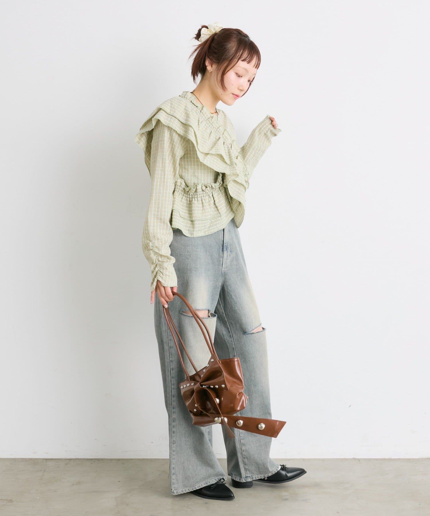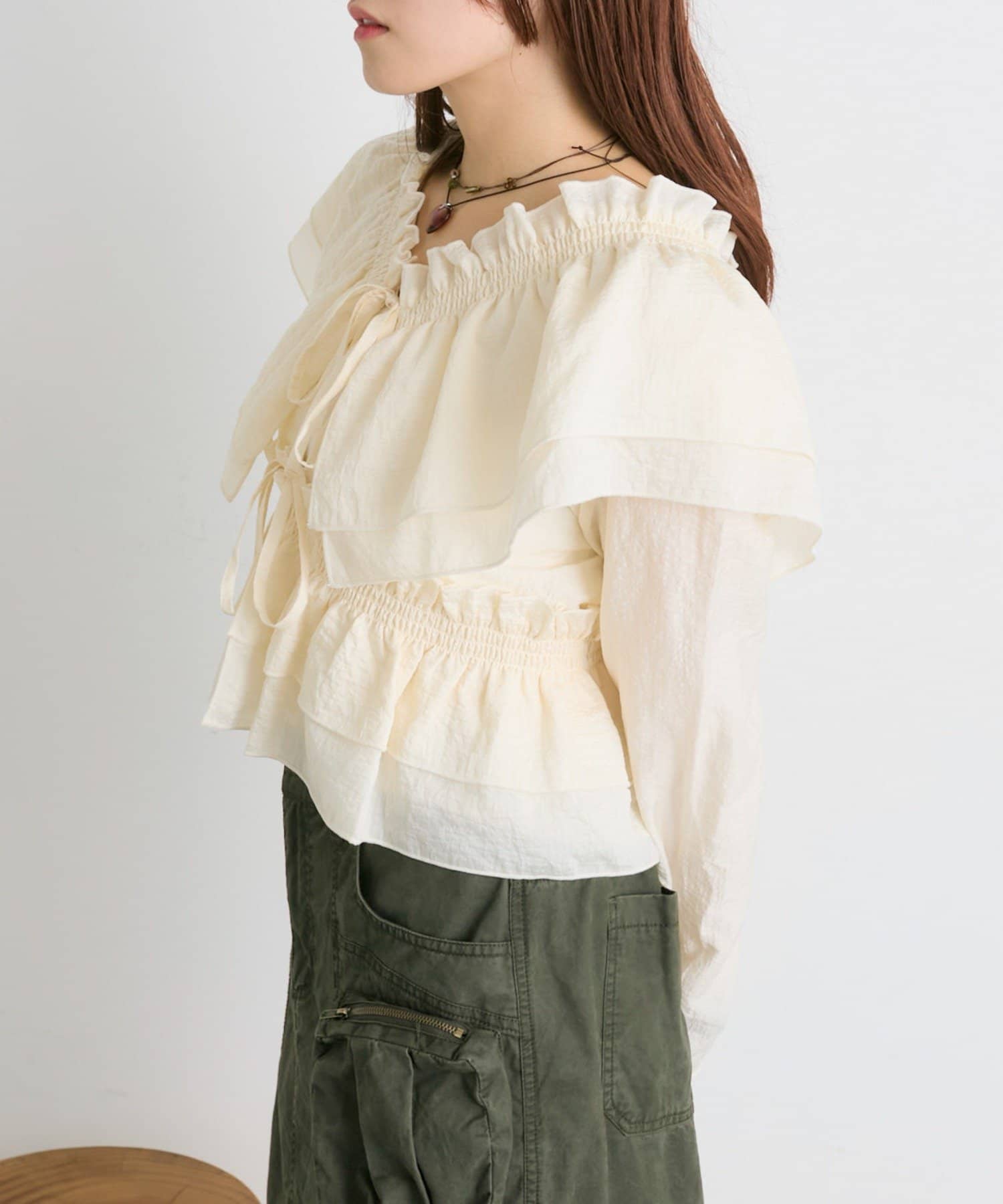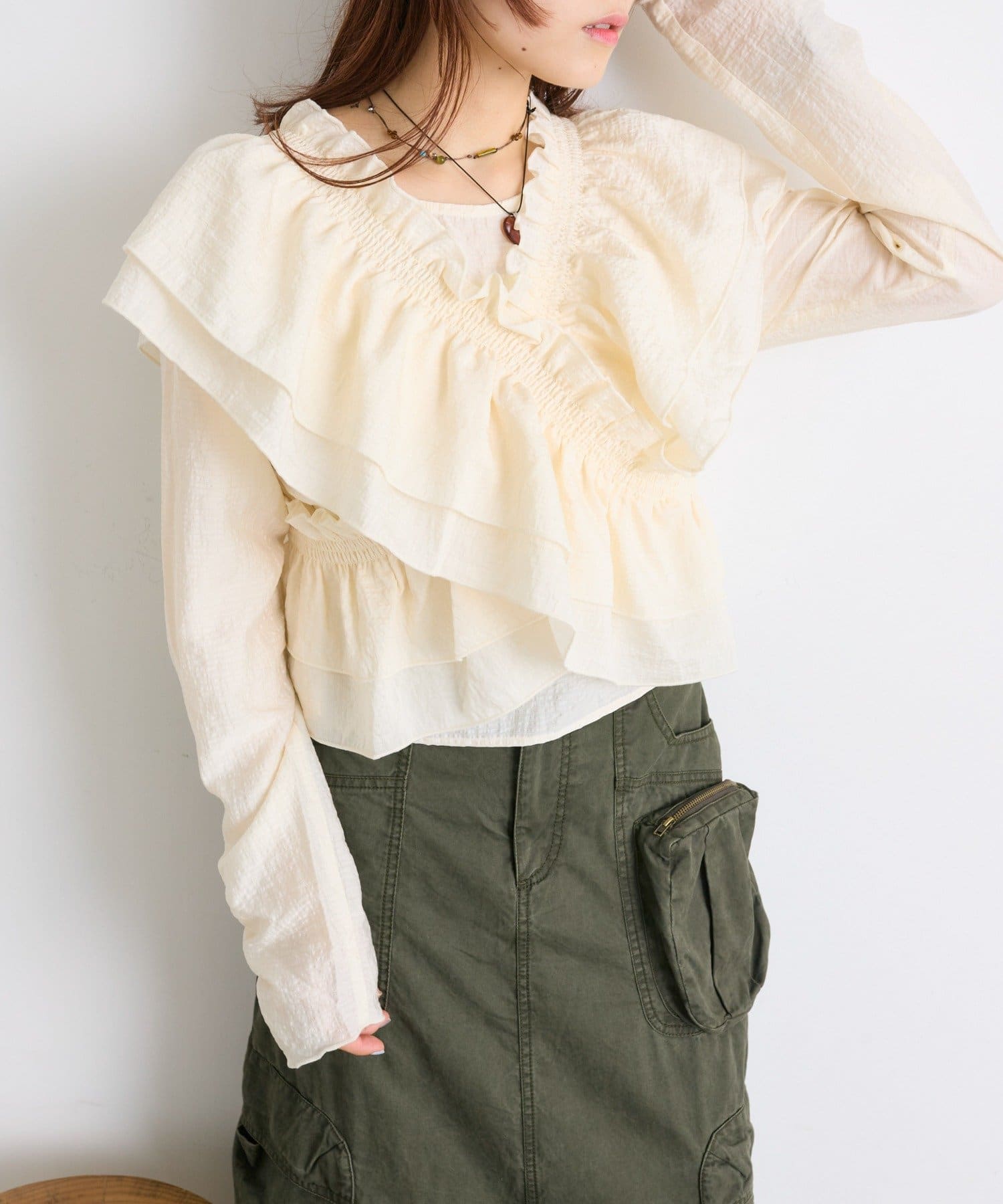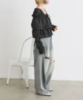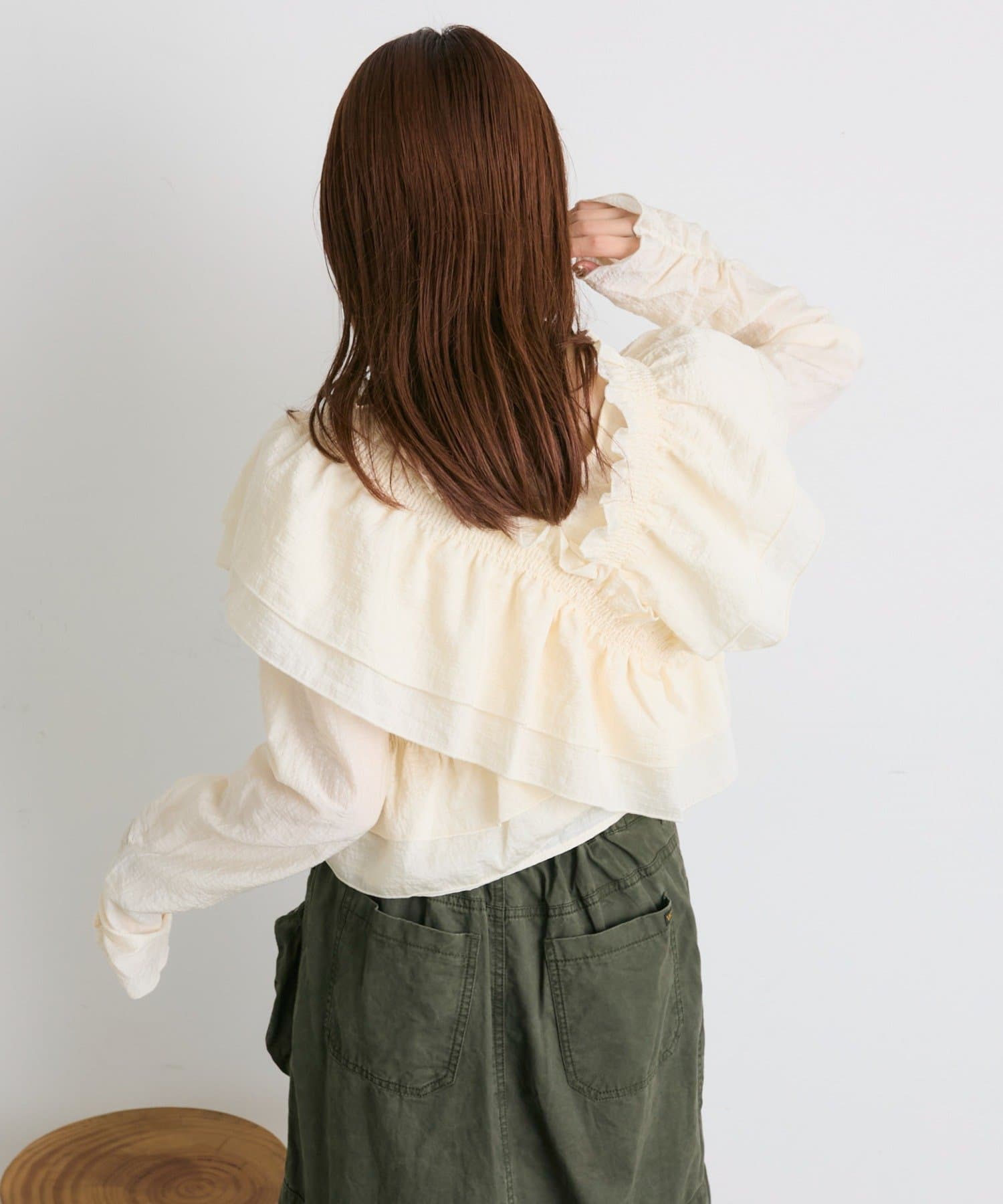 ・片方のフリルを腕の下に下したワンショル風の着こなしが垢抜けコーデに♪