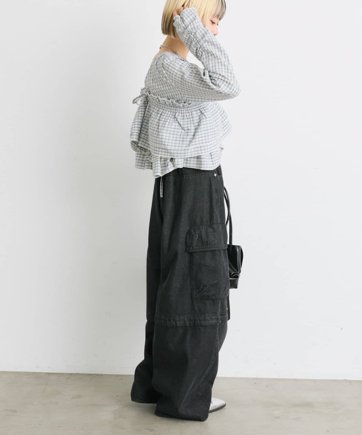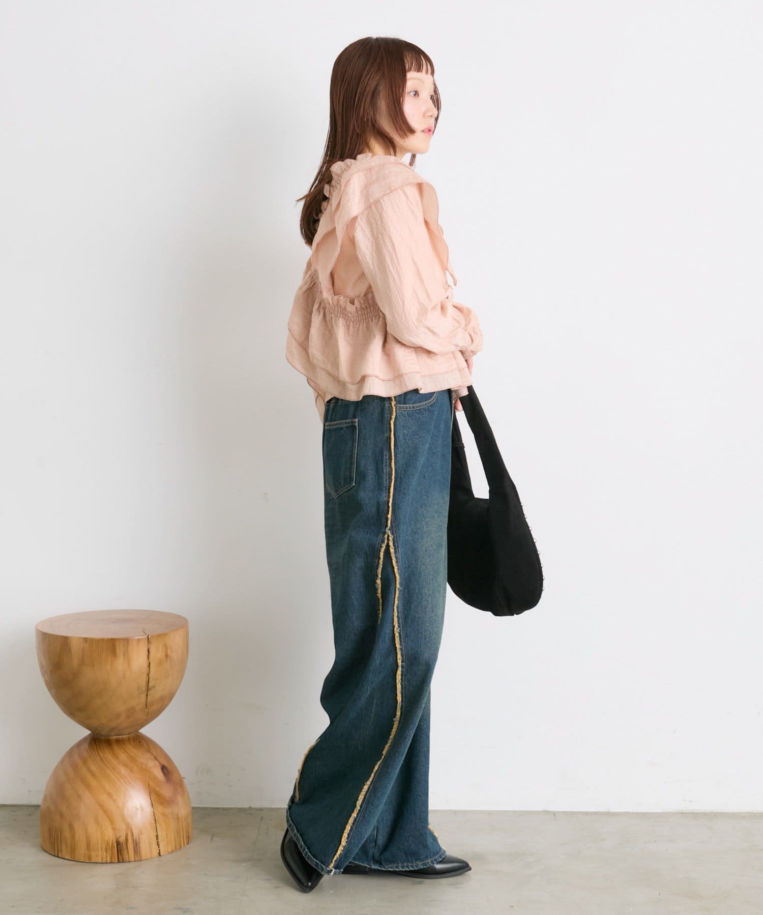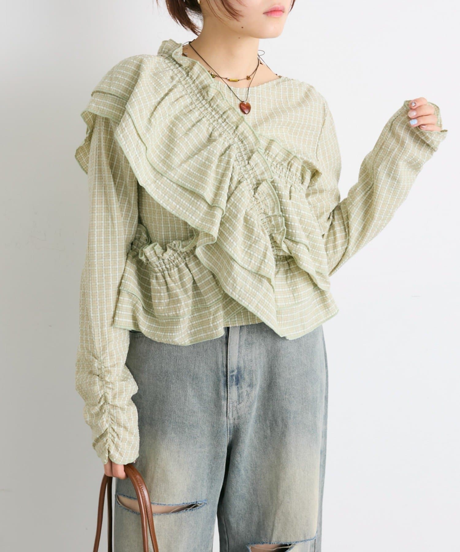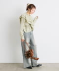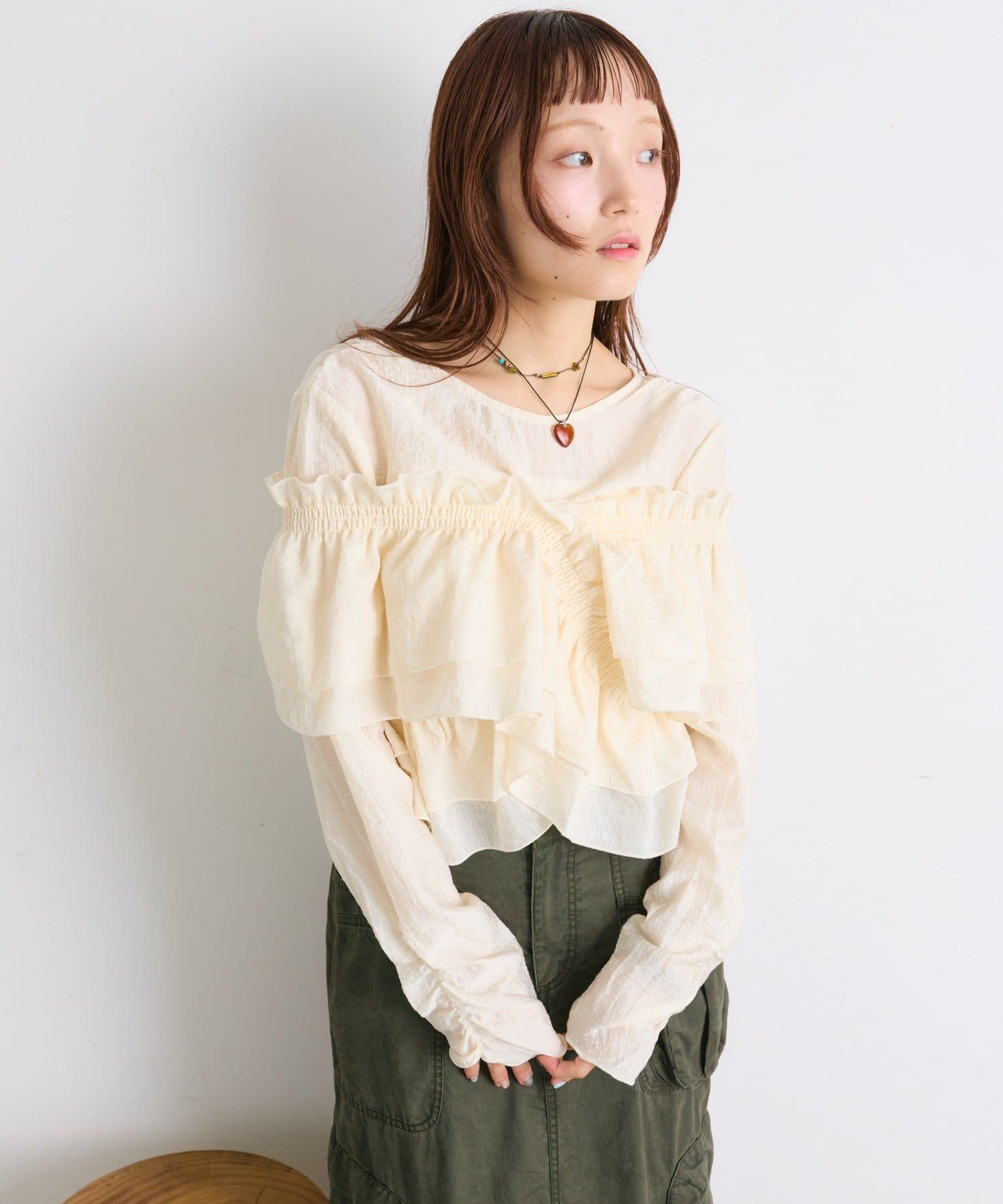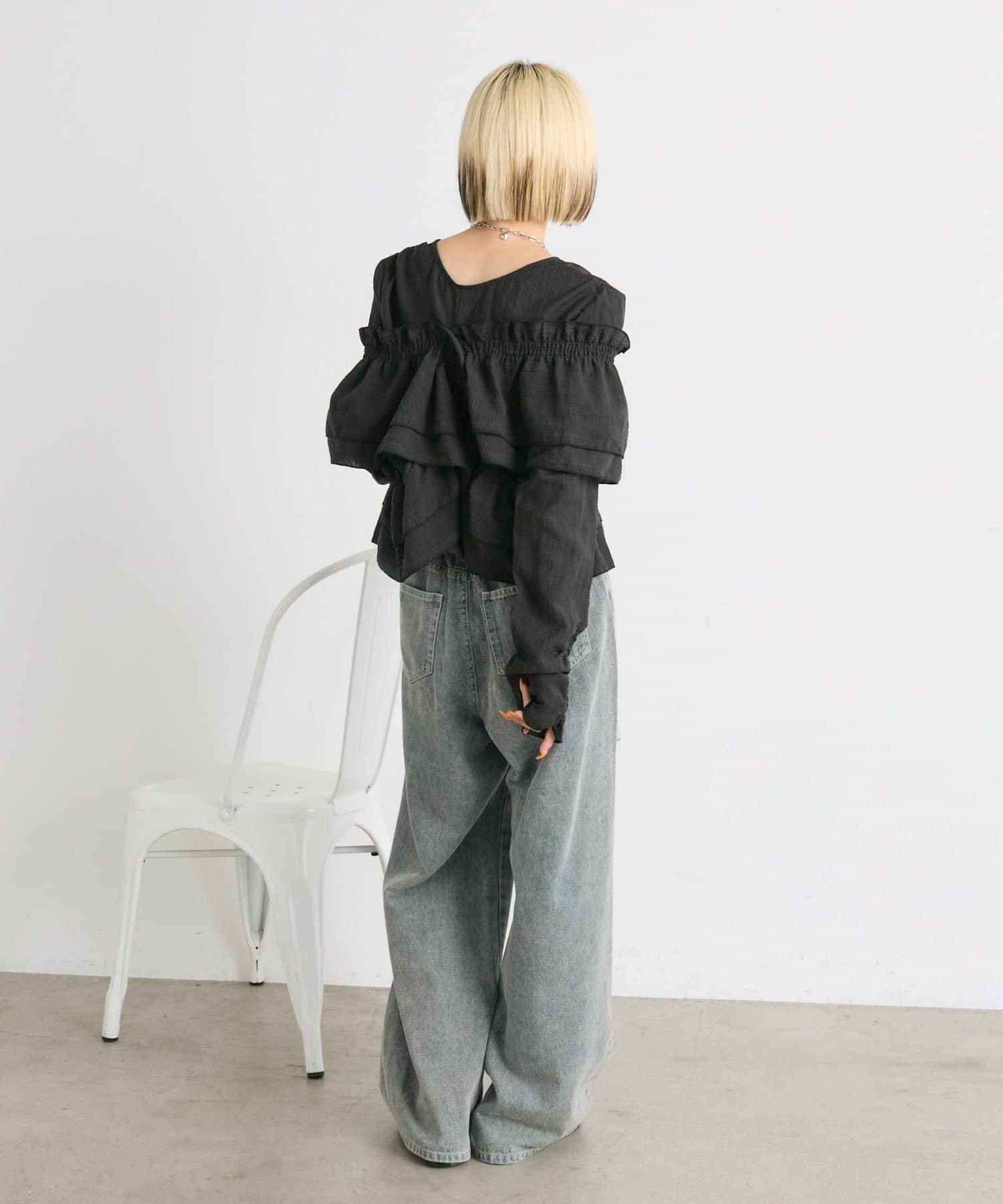 ・片方のフリルを腕の下に下したワンショル風の着こなしが垢抜けコーデに♪