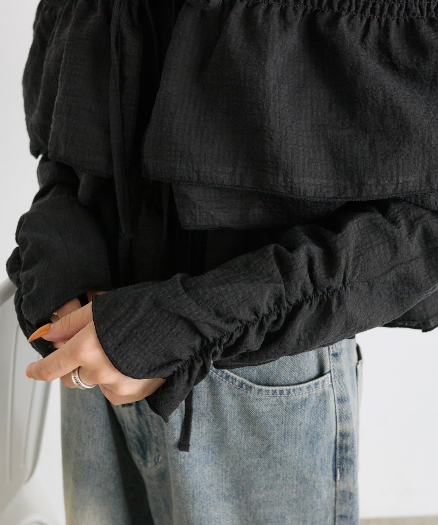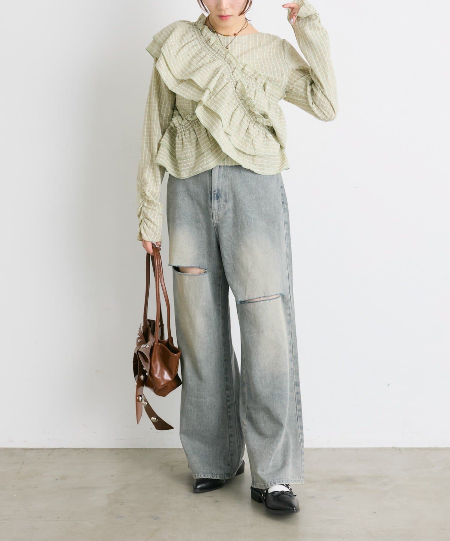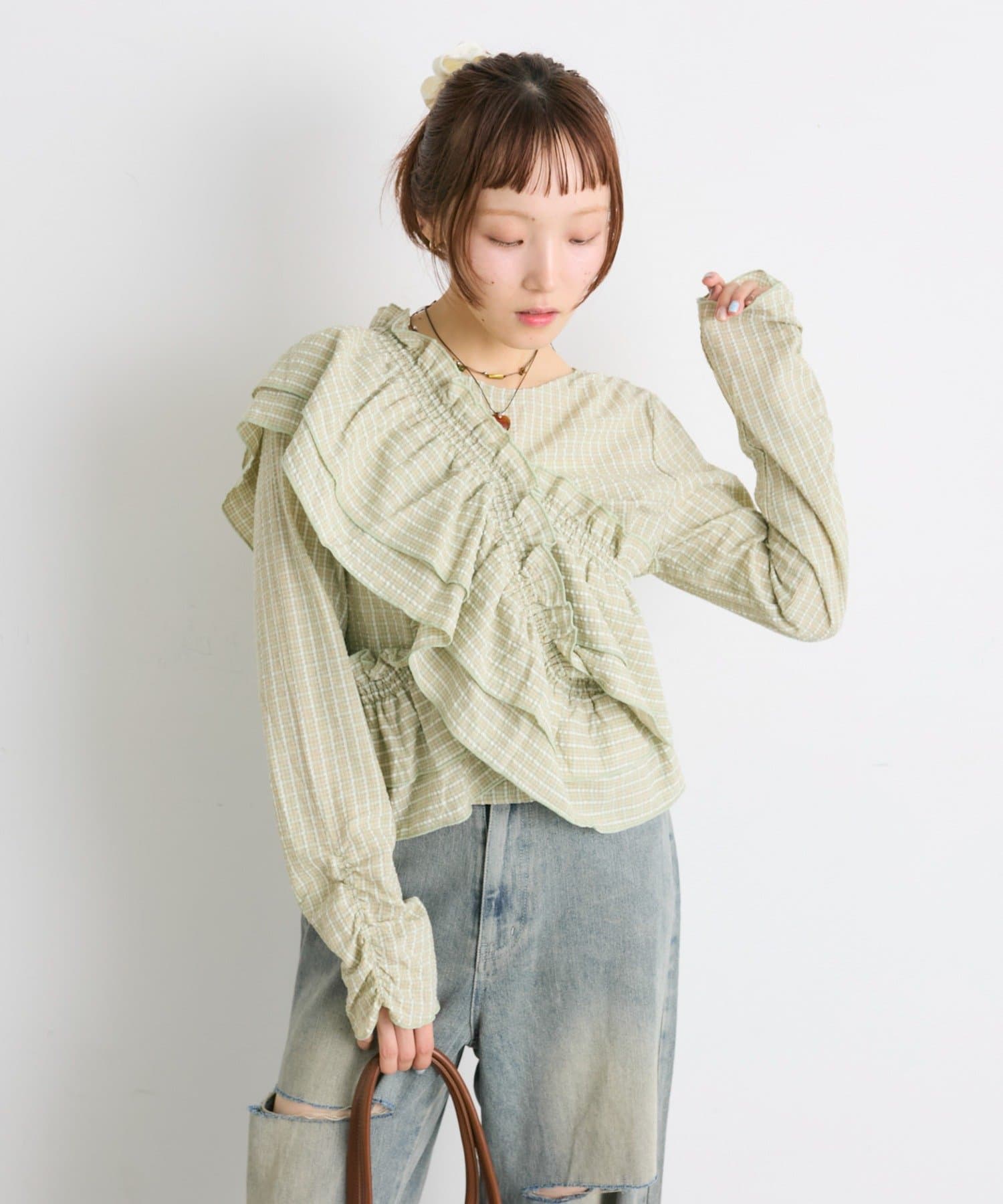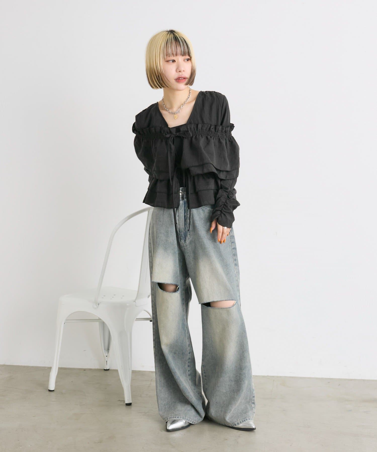 ・片方のフリルを腕の下に下したワンショル風の着こなしが垢抜けコーデに♪